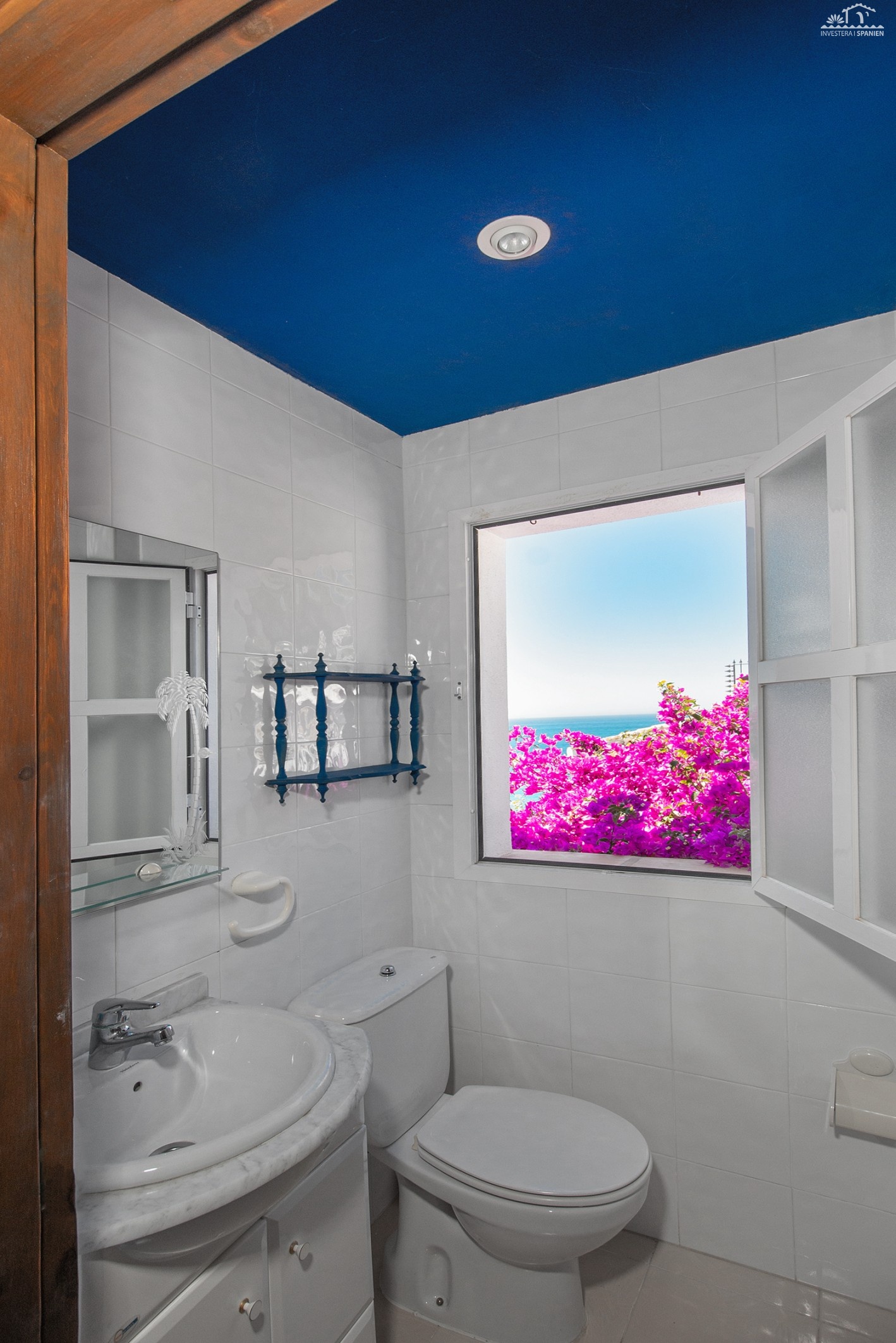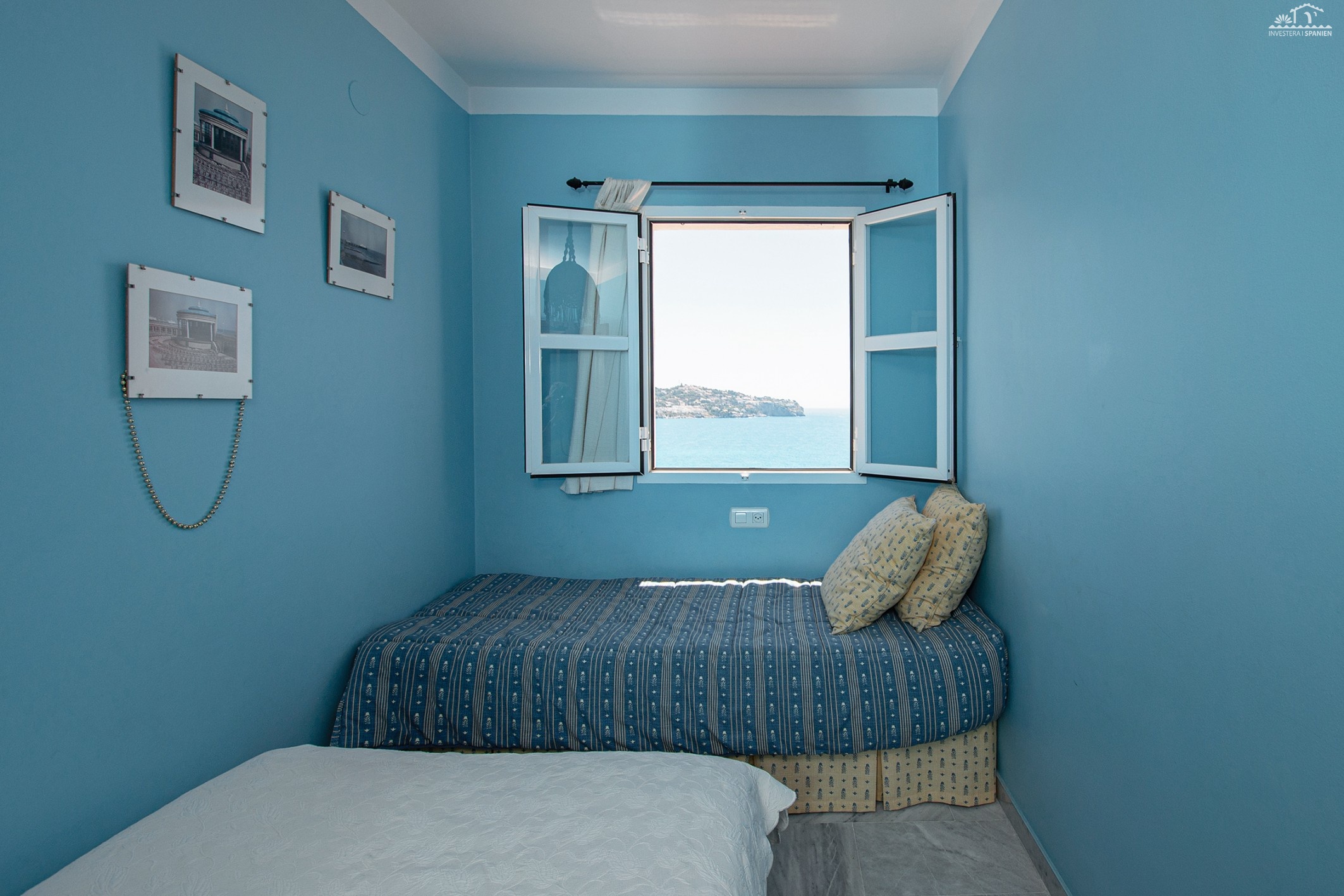 Inside the entrance, a staircase leads down to a hall with a bathroom and 3 bedrooms, all with equally nice sea views.