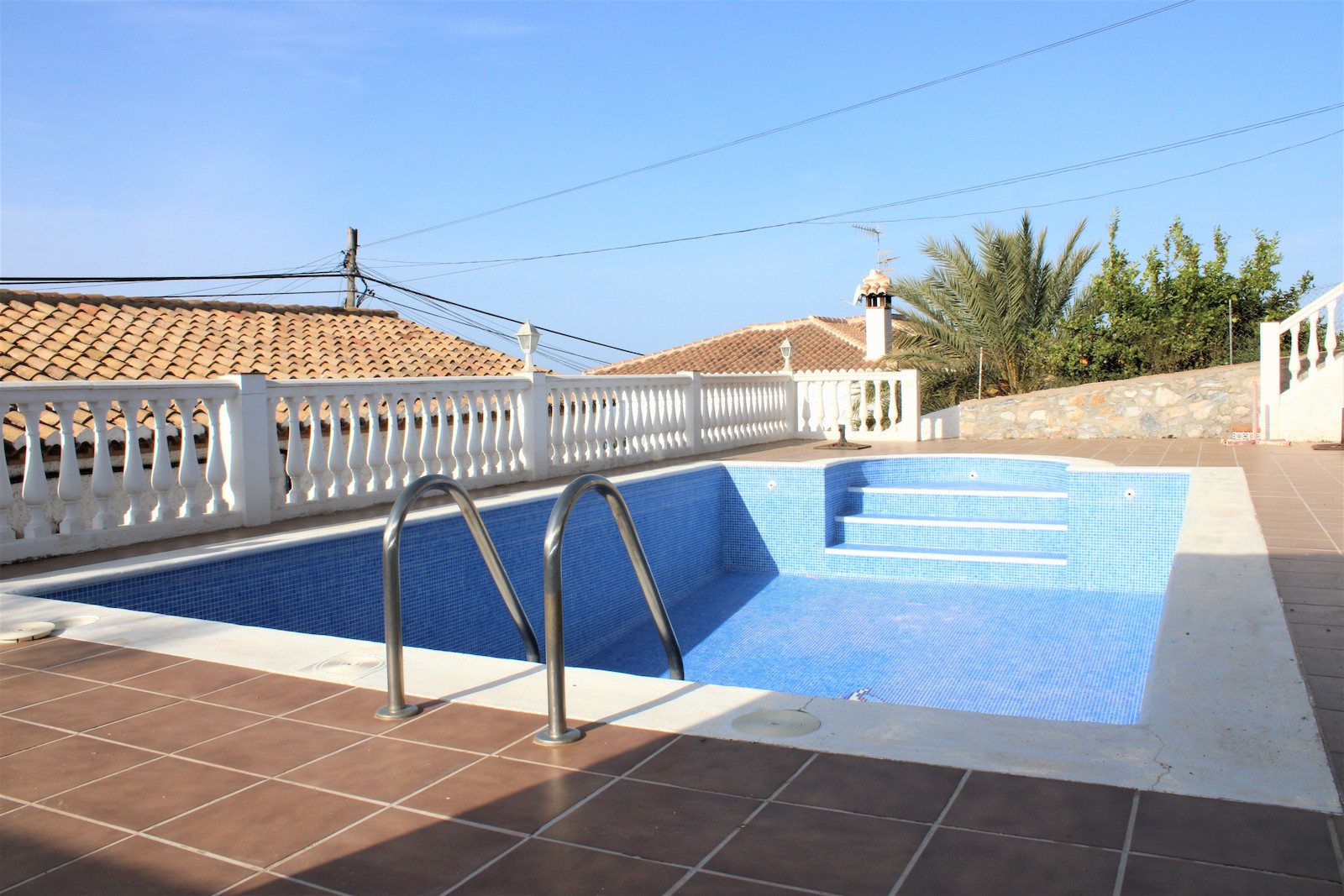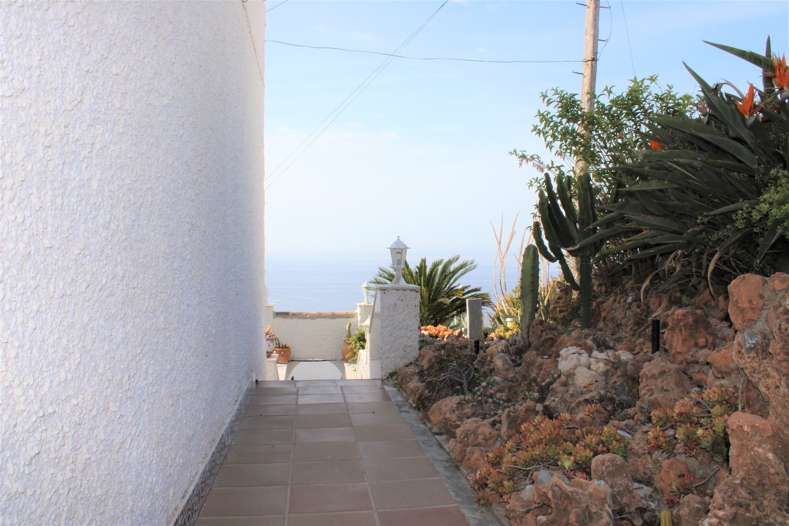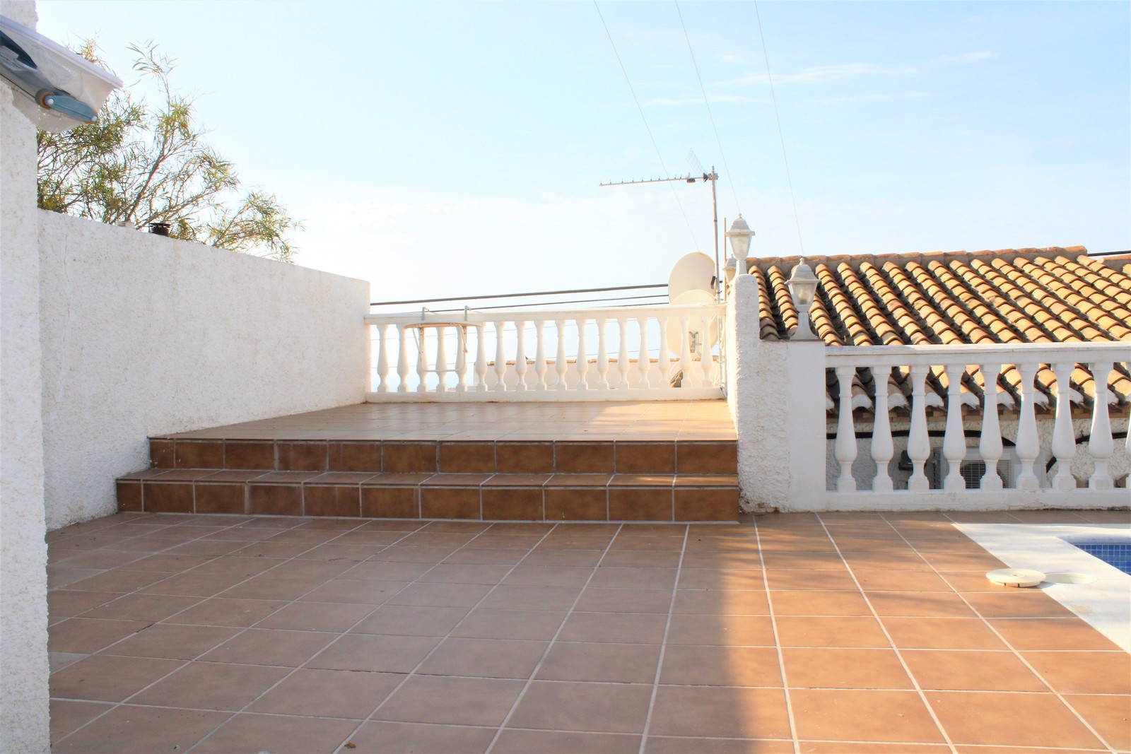 Solid single storey villa in the urbanization Alfa Mar, located between Almuñécar and Salobreña. Easily maintained plot of 482 sqm, living area of 100 sqm and a private garage of 9 sqm. The large swimming pool and solarium are located upstairs from the house and offer a wonderful view from the terrace, there is also a guest house with toilet.