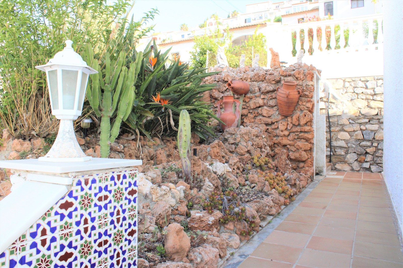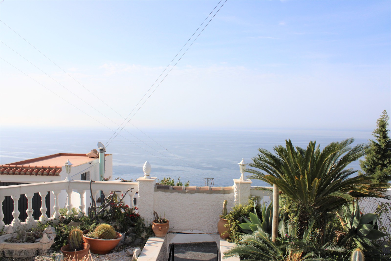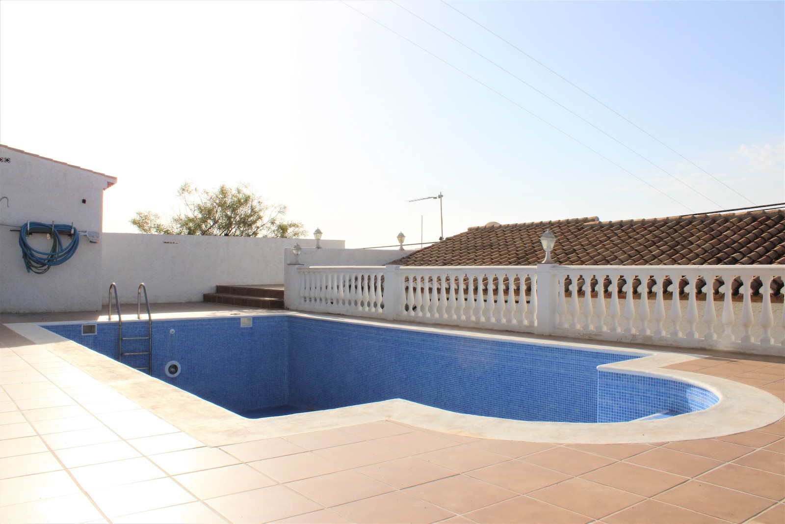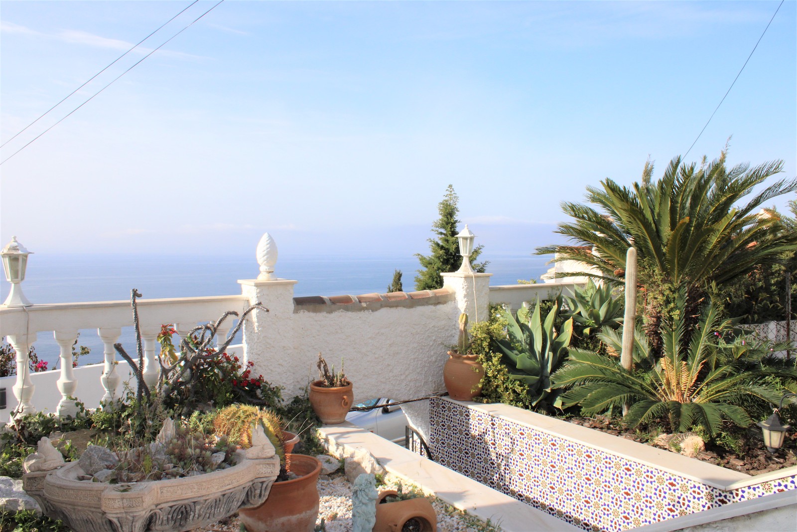 Solid single storey villa in the urbanization Alfa Mar, located between Almuñécar and Salobreña. Easily maintained plot of 482 sqm, living area of 100 sqm and a private garage of 9 sqm. The large swimming pool and solarium are located upstairs from the house and offer a wonderful view from the terrace, there is also a guest house with toilet.