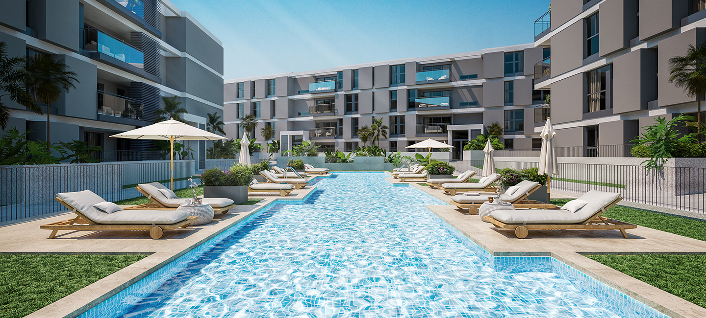104 2, 3 and 4 bedrooms designer apartments, 60 apartments in phase 1 and 44 in phase 2, with types of 2 to 4 bedrooms with garage, storage room and community pool.