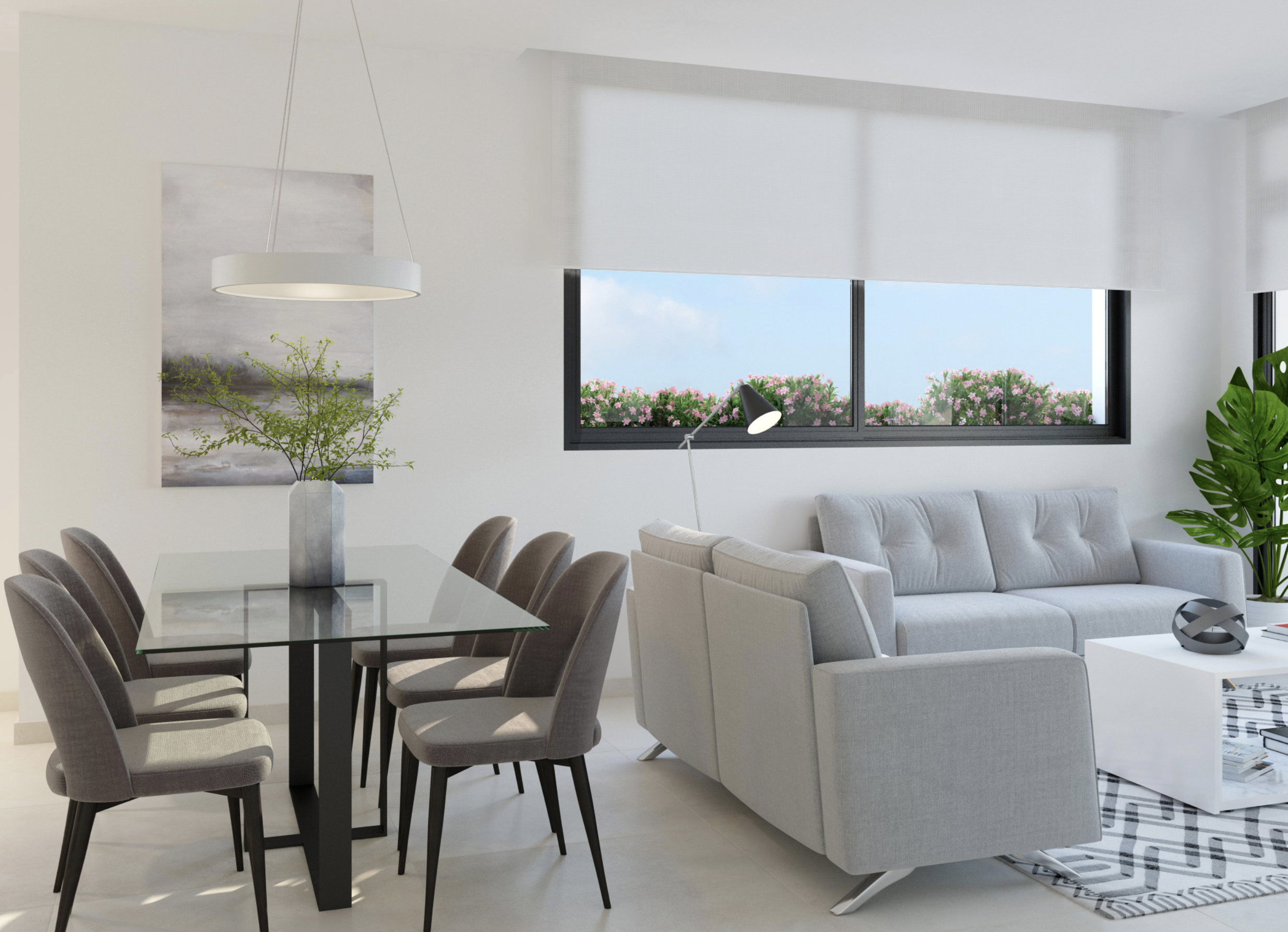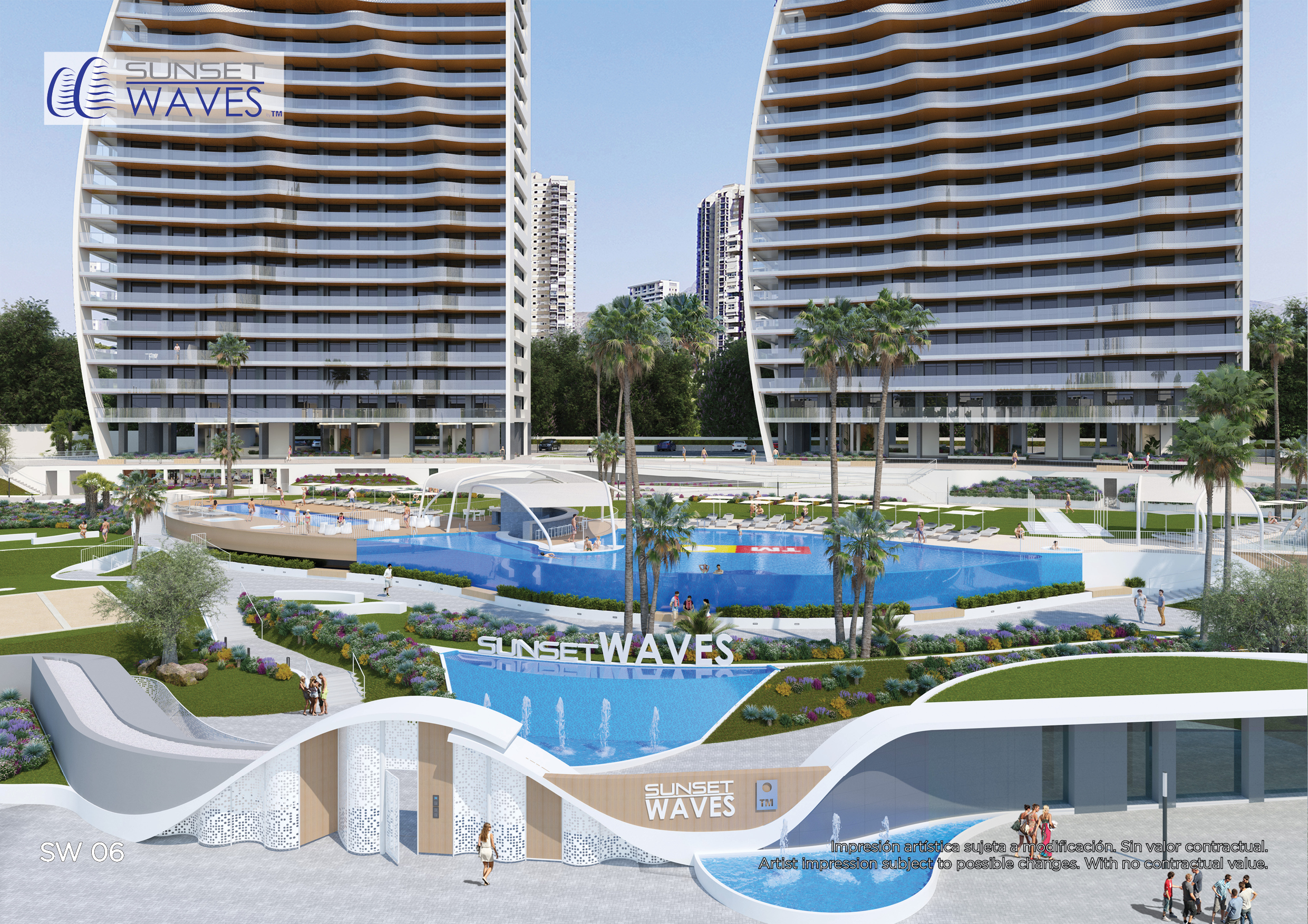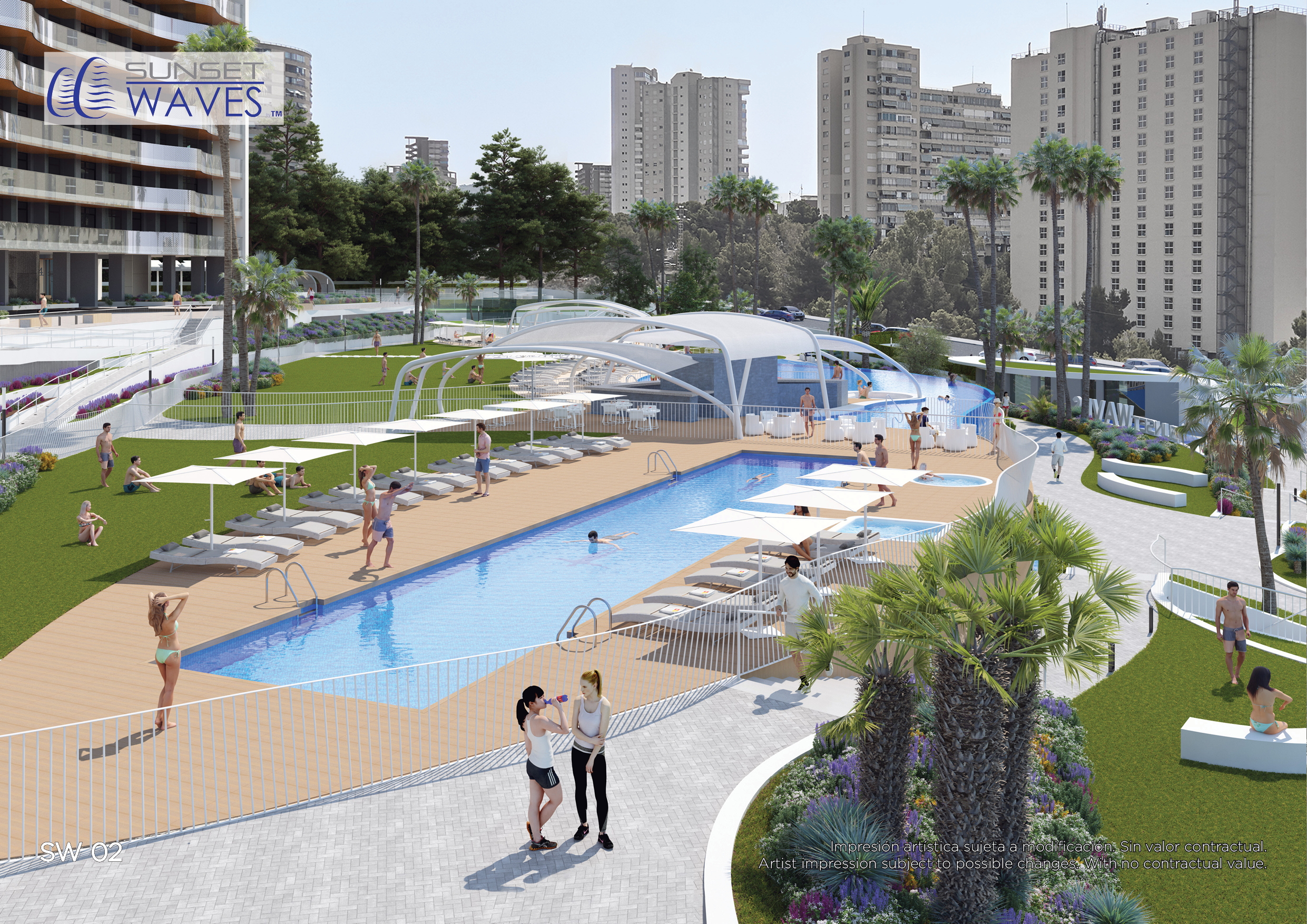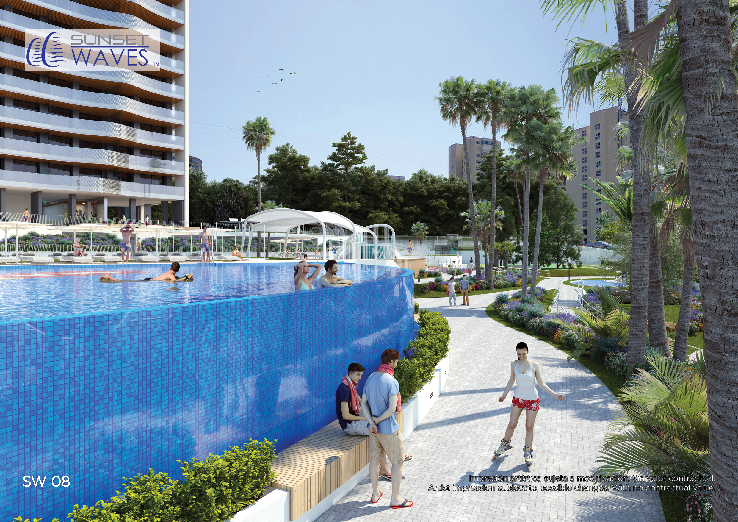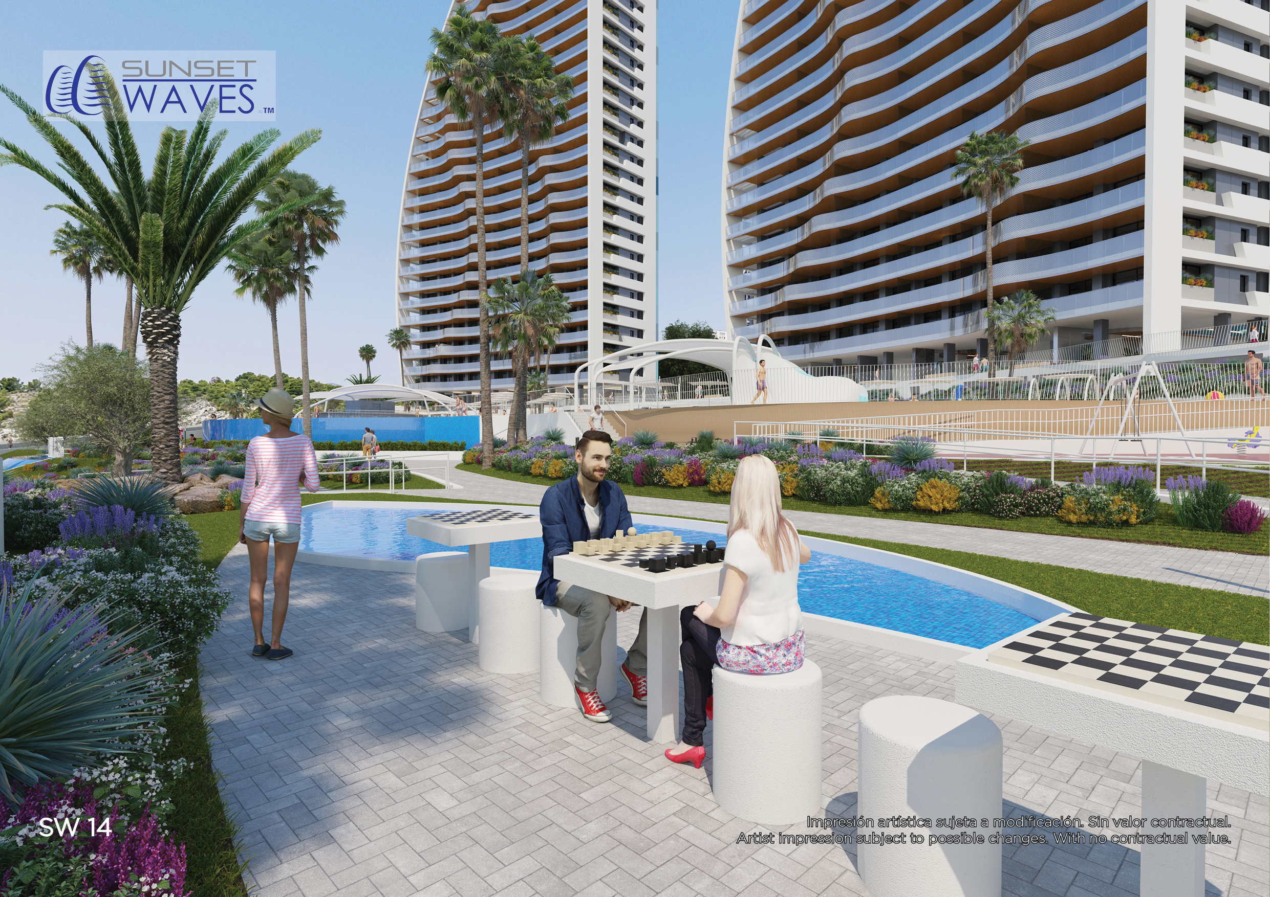 <strong>The extensive lineup</strong> at this residential estate also includes a large sports area to make even the most demanding of athletes happy, equipped with a heated swimming pool, a tennis court, a paddle court, multisports area, petanque courts and a panoramic gym sized 120m2. Those who prefer relaxation and peace and quiet can enjoy the chillout areas here: picnic areas and chess tables, massage rooms and sauna, completing the facilities of this fantastic resort. The children's playground, the climbing wall and the pool-lake within the security perimeter is the perfect place to let your kids have fun. With its avant-garde design that is sure to become a new icon on the Poniente beach, Sunset Waves is your home on the beach you always dreamed about.