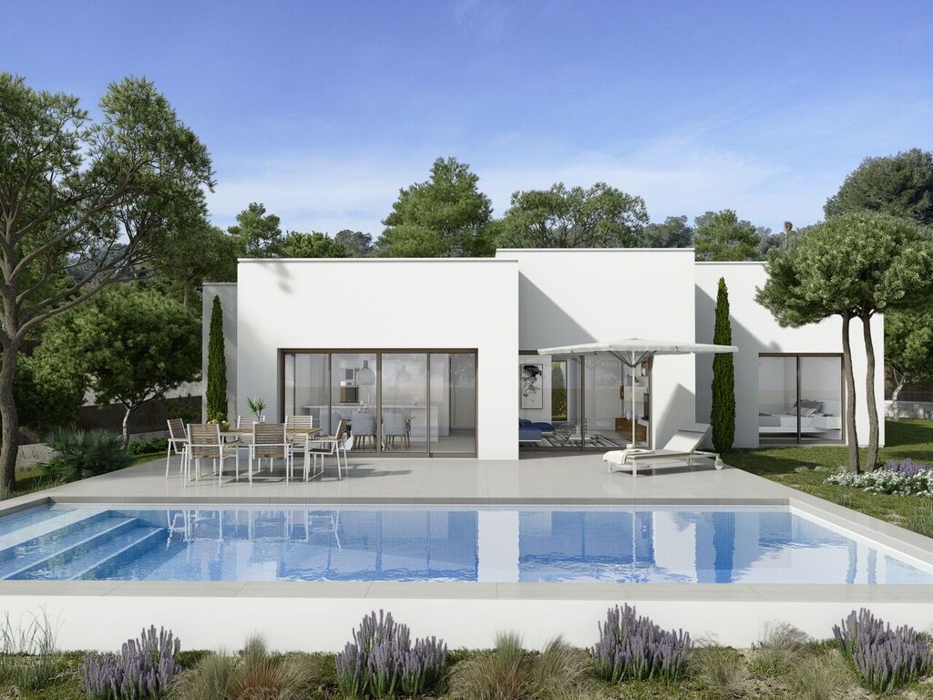 The Villa has three bedrooms and a large living room with integrated kitchen. Its functional and horizontal layout allows you to enjoy a wide extension of private land around the house. The open windows on the facade have been pushed to the limit, completely eliminating the conventional wall and integrating the exterior landscape with the interior of the house.