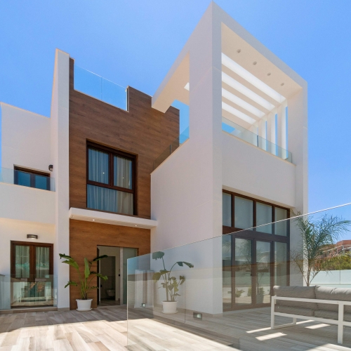 The houses are fully insulated for optimal indoor climate. Top insulation keeps the heat outside in the summer and the cold out in the winter. The villas will attract attention since they are the first in Spain to be built with a new Nordict wall system.Each residence consists of two full floors, private pool and terraces. The roof terrace with a stunning view over the turquoise Mediterranean Sea and the beautiful La Mata beach. All villas with gate car parking
