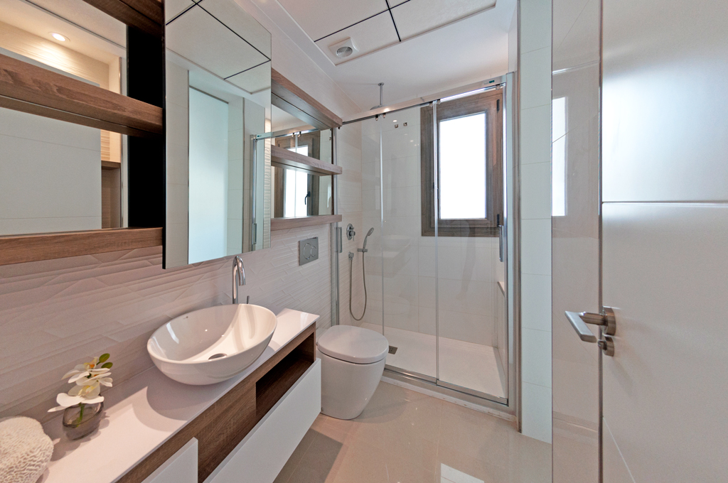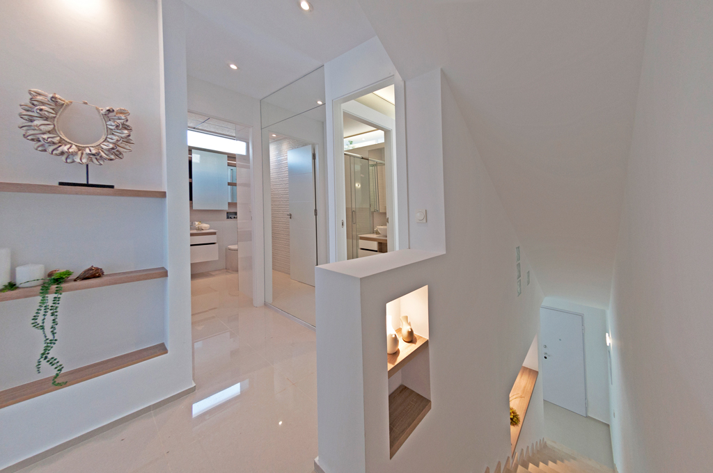 The properties are divided over two floors. On the ground floor you find a spacious open modern kitchen and living area with access to the private garden, a bathroom and a storage room. On the first floor you find 2 bedrooms with access to a balcony, a bathroom and the master bedroom with en-suite bathroom and access to a terrace overlooking the pool area and with external staircase to the roof terrace of 45m2.