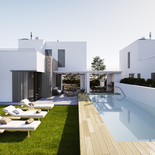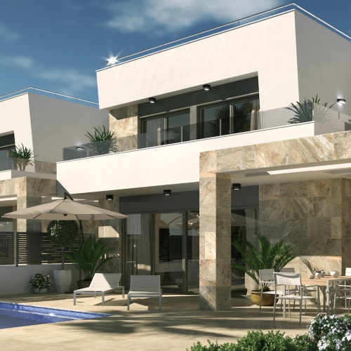 Independent dwelling with pool 7m x 4m and a private parking plot. South facing. Structure made of armed antisytemic concrete. Thermal insulation and sound proofing in all areas of the dwelling. Exterior coatings applied of stonewear, porcelaine and white mortar. Marble or porcelaine staircase. Steel and glass railings on stairs and terrace. Smooth interior paintwork. High and low kitchen furniture with silestone or granite worktops. Vitrivied porcelaine toilets. Bathroom furniture and taps and underfloor heating bathrooms. Niessen electricity supply (or similar), fibre optic, television and telephone. White doors 80 x 2.20 cm with magnetic closure. Armoured security entrance door, aluminum or PVC windows. Insulated and sound proofed windows. Automatic blinds. Panelled entrance and parking door. Energy saving hot water boiler arothermic with 100 litres capacity .Pre- istallation of air conditioning duct in all dwellings. Intercom at entrance to the plot. Steel perimeter, pedestrian access and vehicles. Solarium access, fenced plot and lighting on swimming pool.