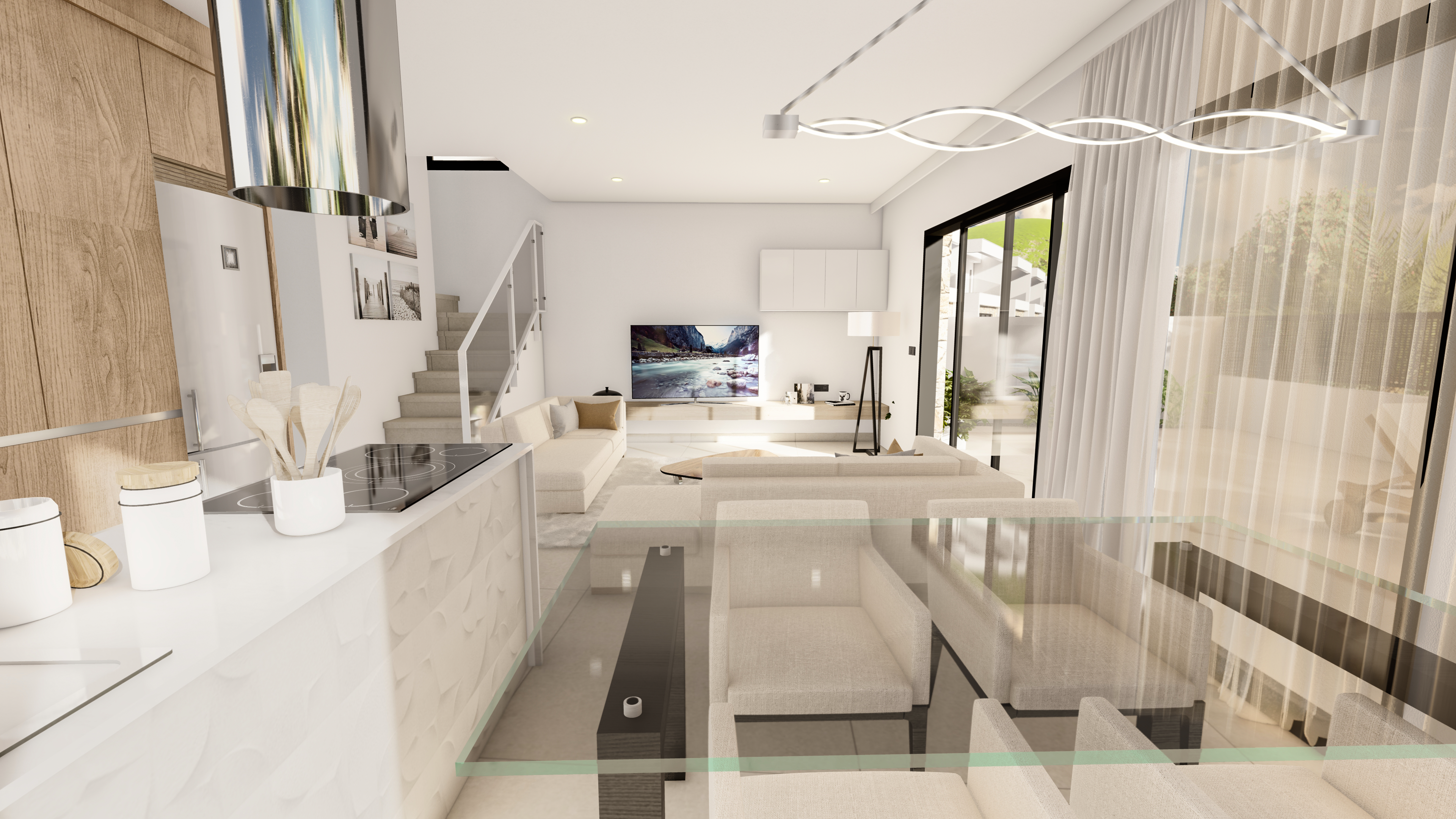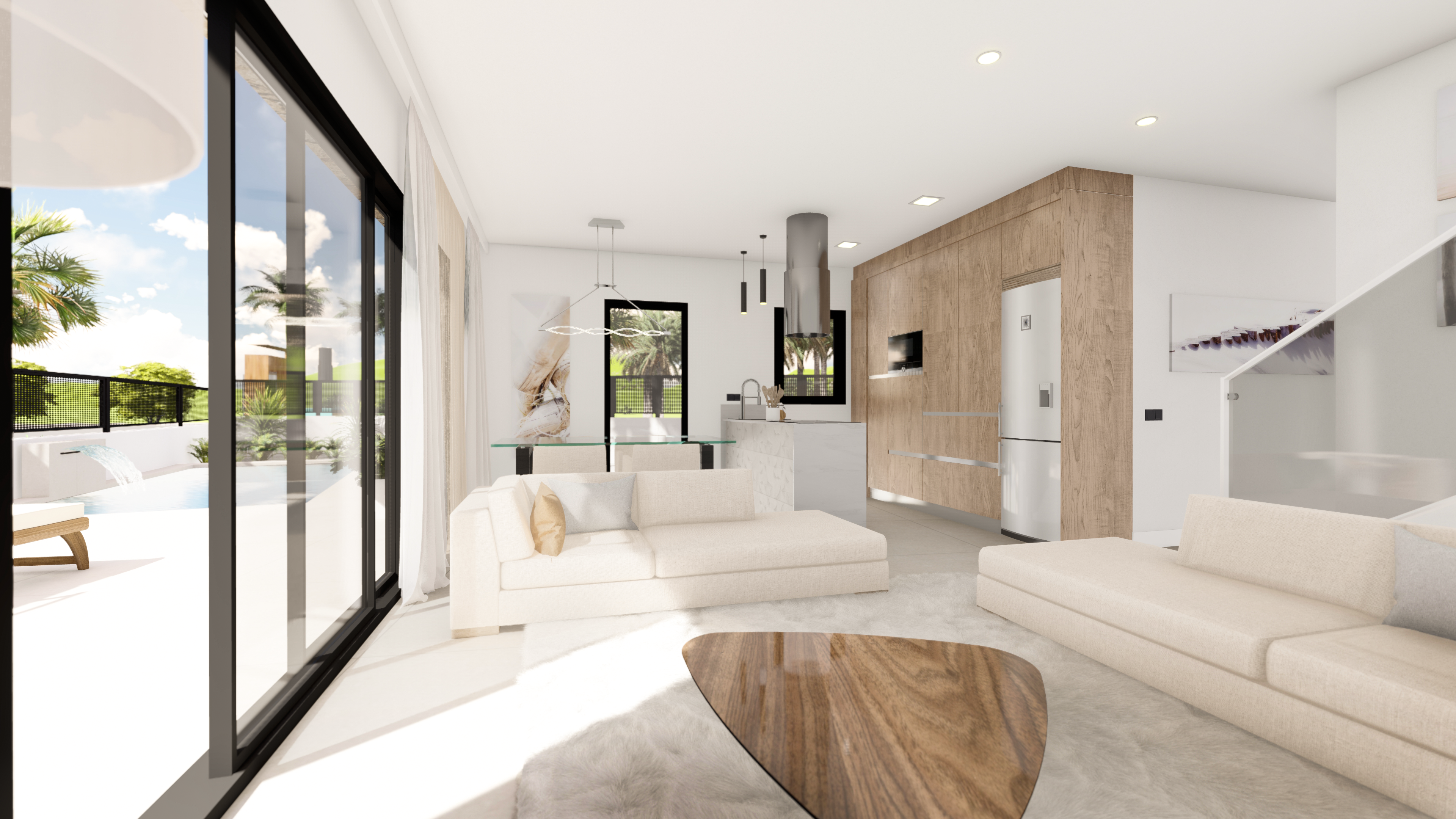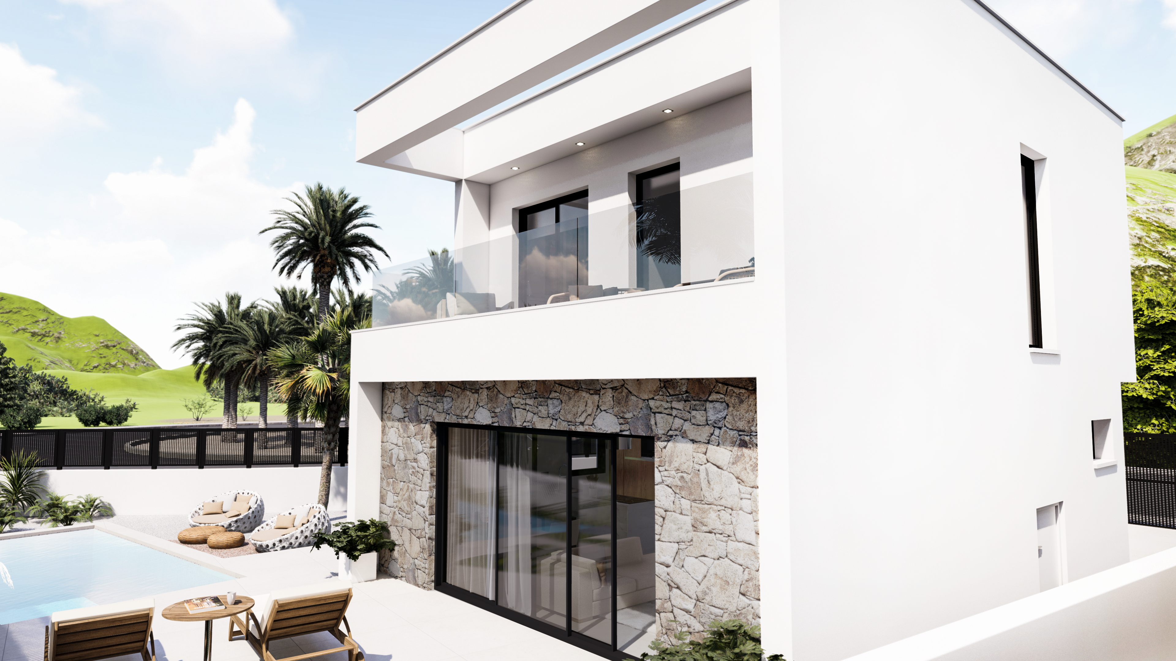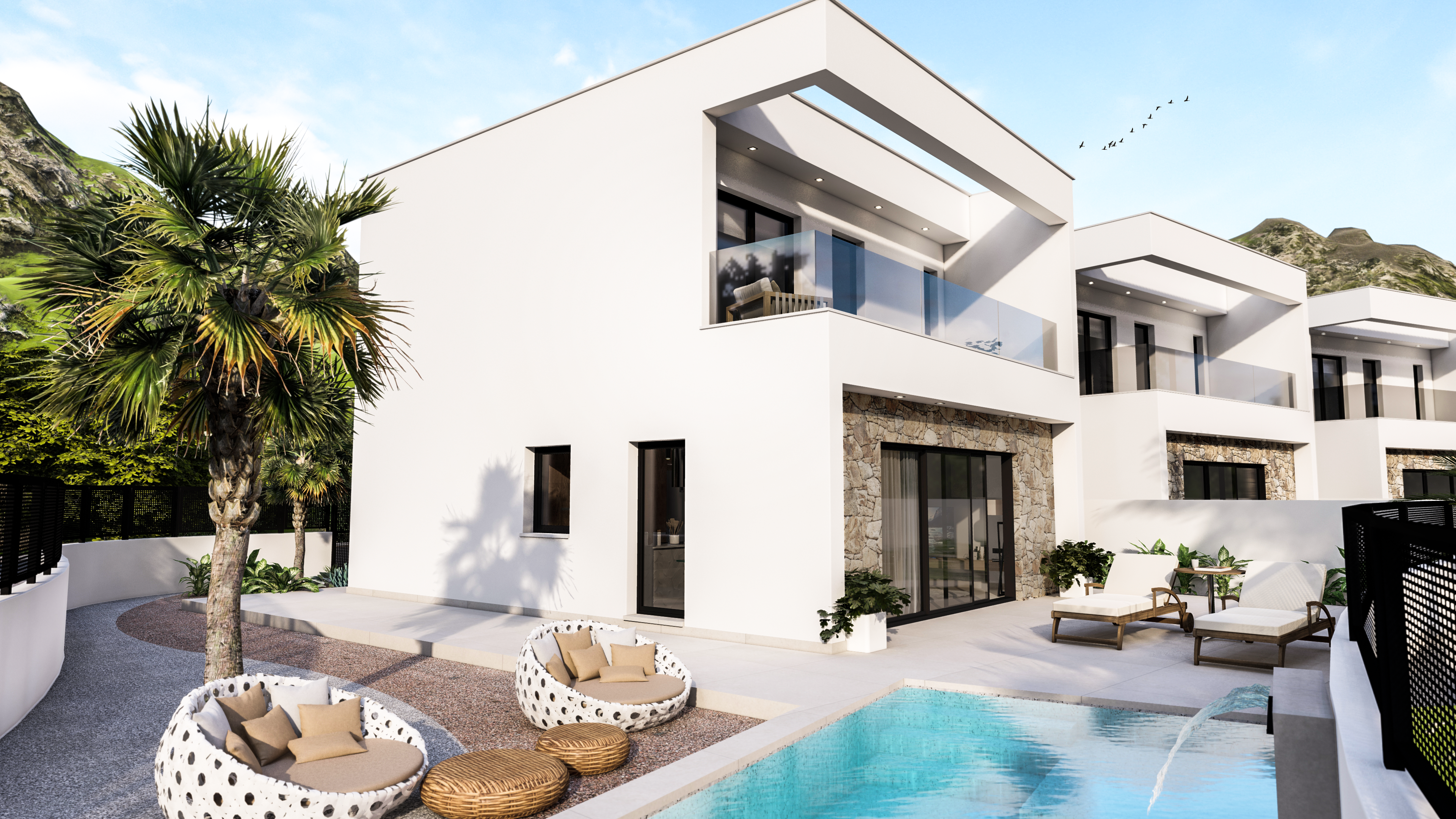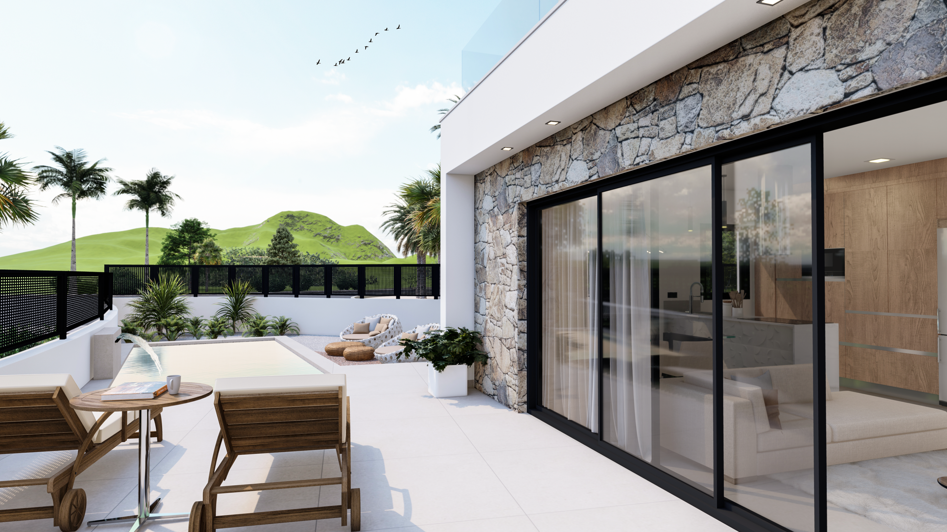 The residential is composed of 14 exclusive villas of 3 bedrooms combining modern design, quality and functionality. The location offers amazing views to the pitch and putt golf of Isla del Fraile urbanization and to green spaces and mountains that surround the area. A Villa consists of one large living room, a furnished kitchen, 3 bathrooms and terrace. Each villa has its independent plot with terrace, garden and pool and parking space.