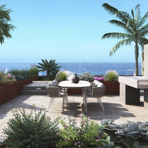 Terraces at various heights creating cozy environments surrounded by vegetation and endless sea views.