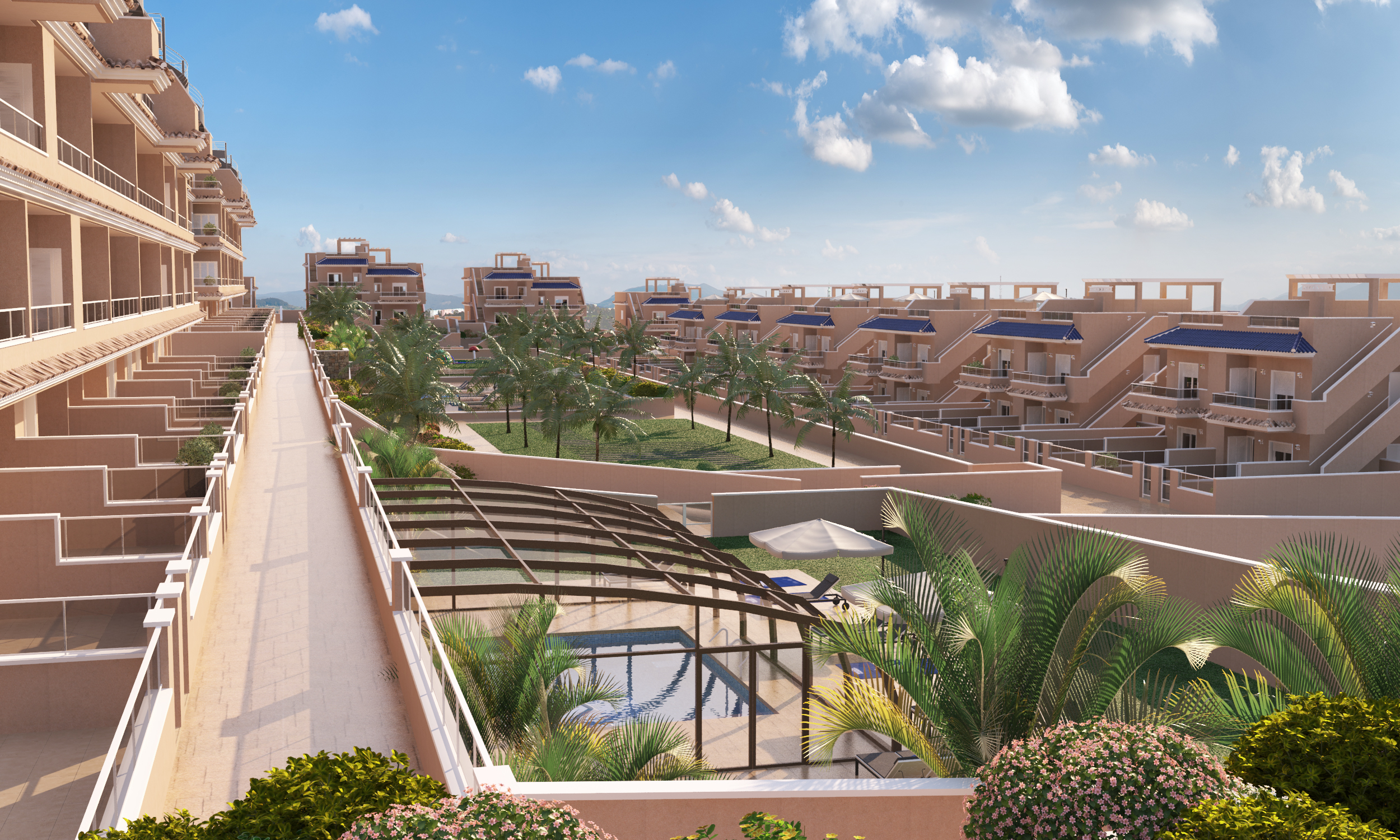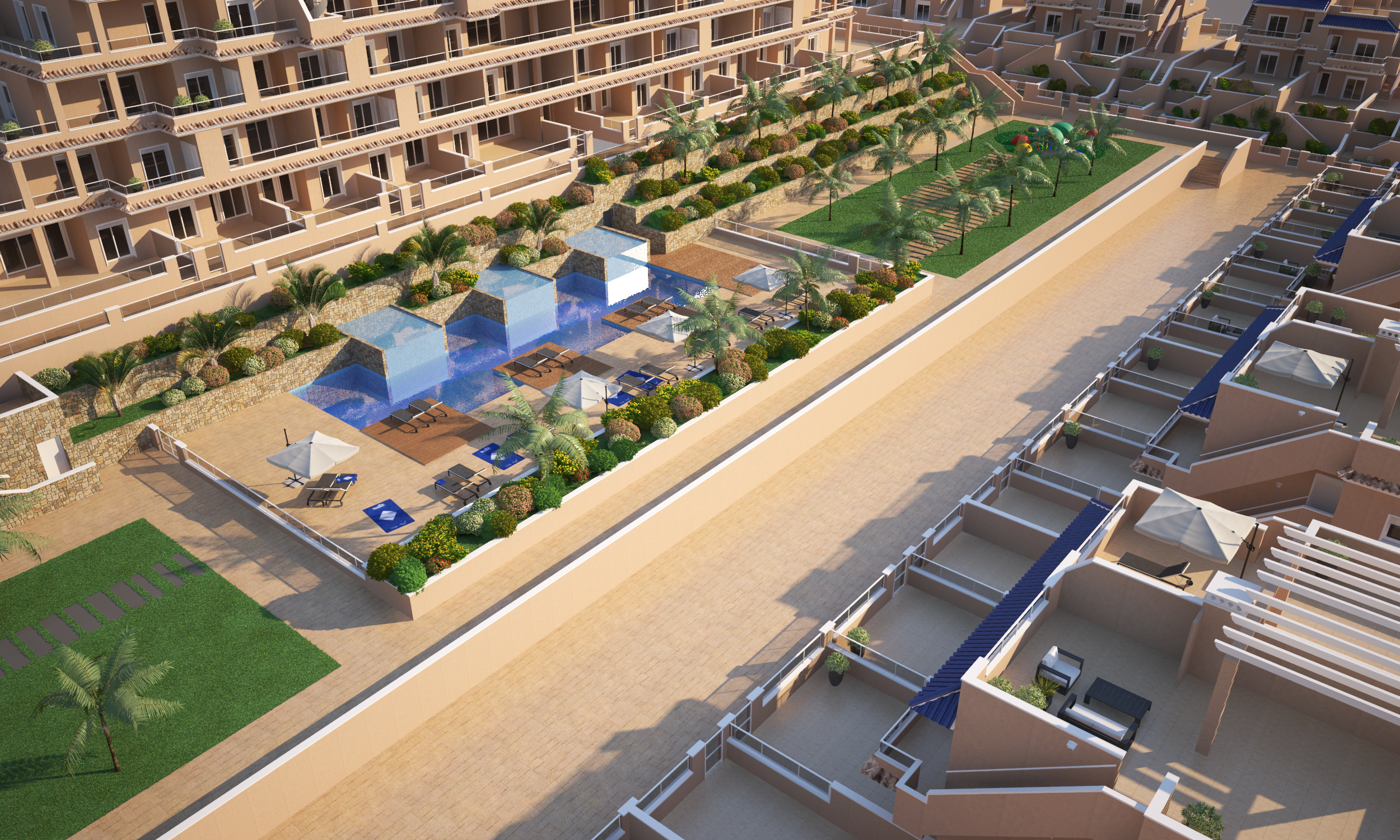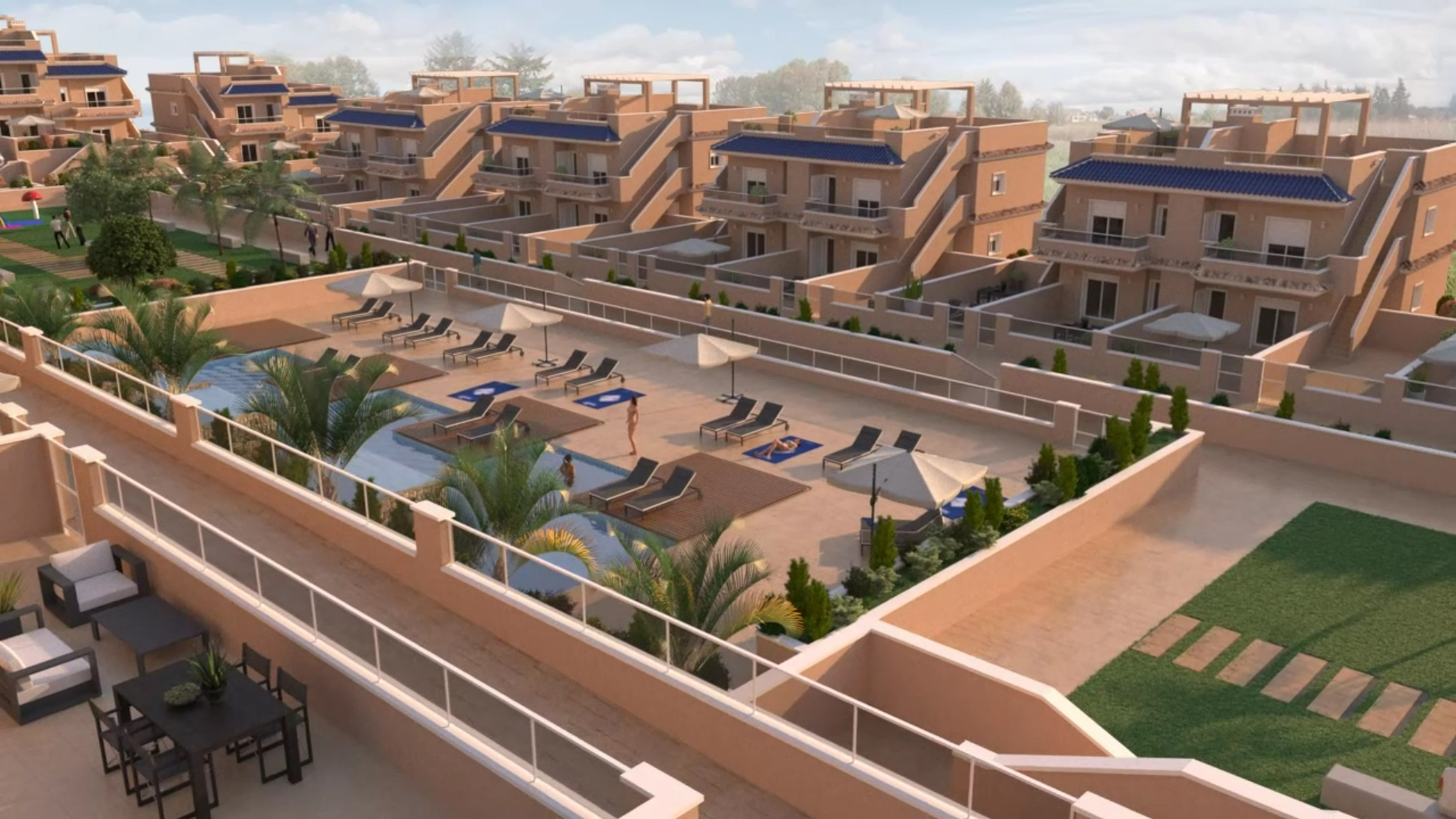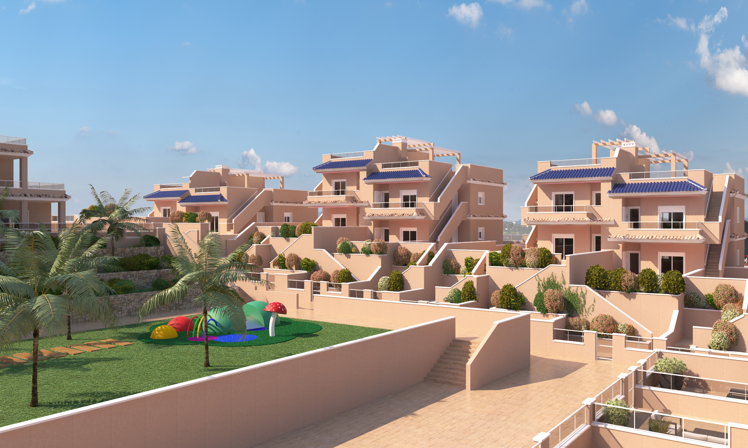- 38 Bungalows 3 bedroom ground floor apartment with large terraces upstairs with terrace or balcony and private solarium.