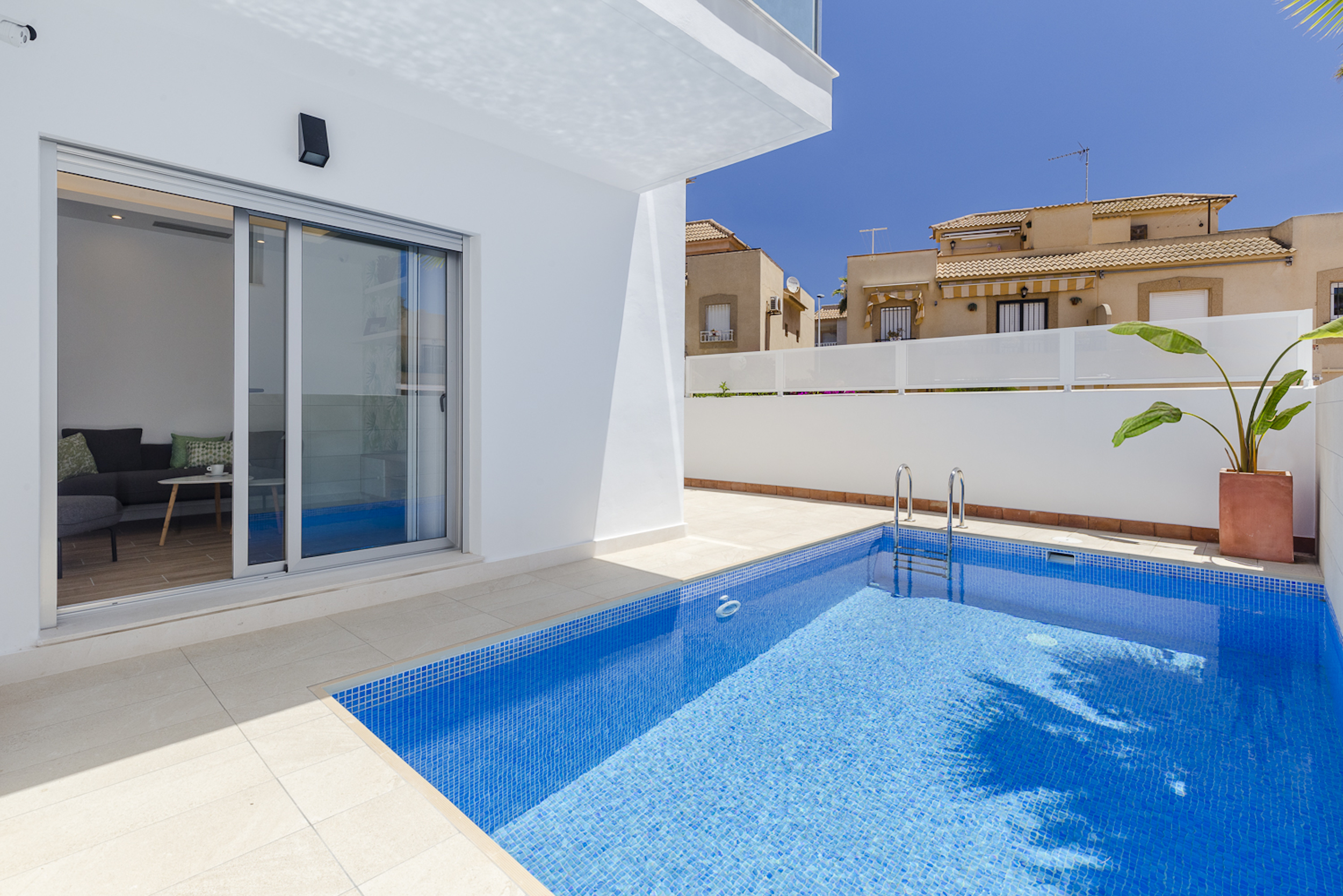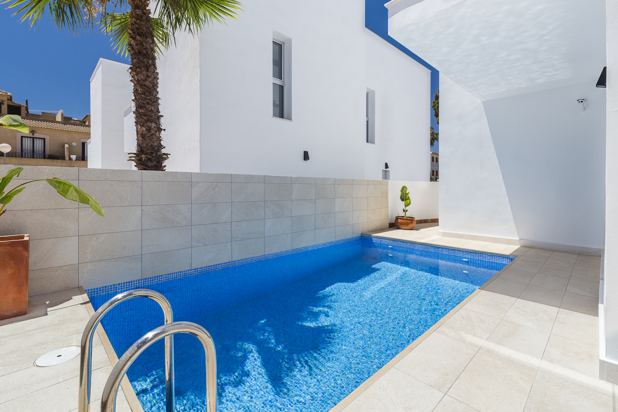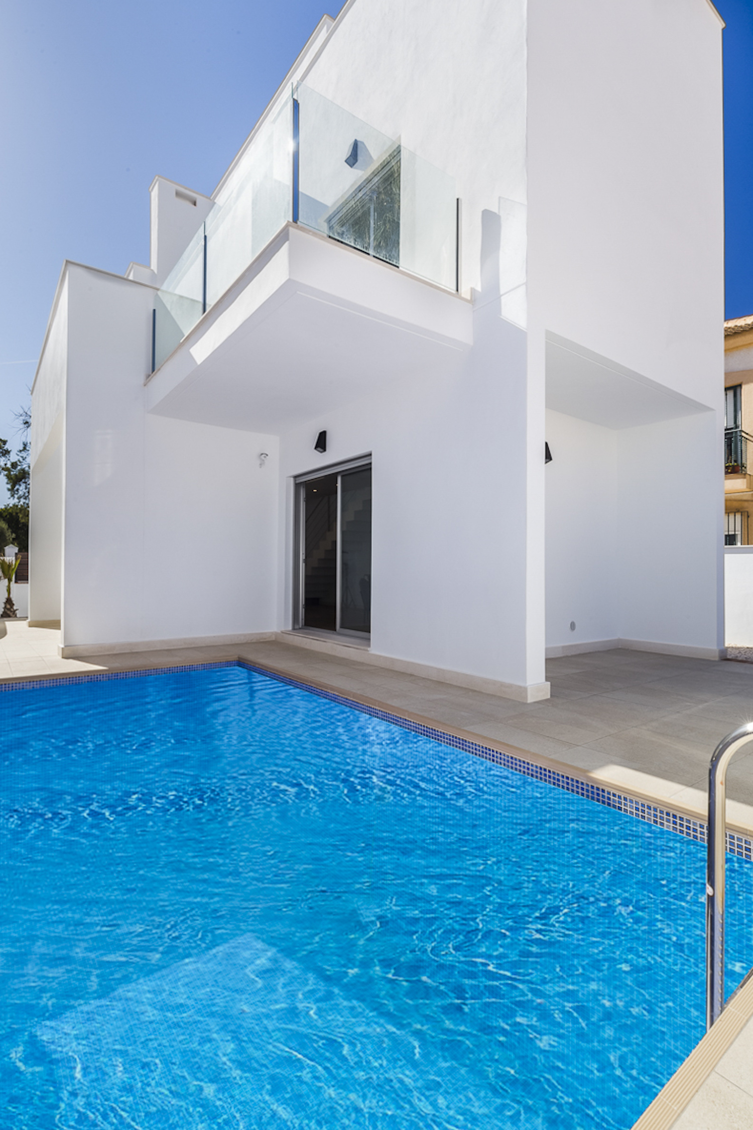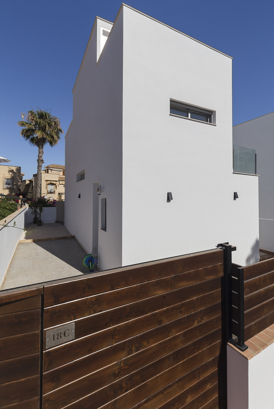 This 3 detached luxury villas project has been designed by Plania in a 600 m2 south face plot. These 120 m2 built stunning villas have 2 floors, 3 bedrooms, 3 bathrooms, solarium, private swimming pool and parking. They are located in “La Rosaleda” a privileged area of Torrevieja seaside, only one minute from the beach.