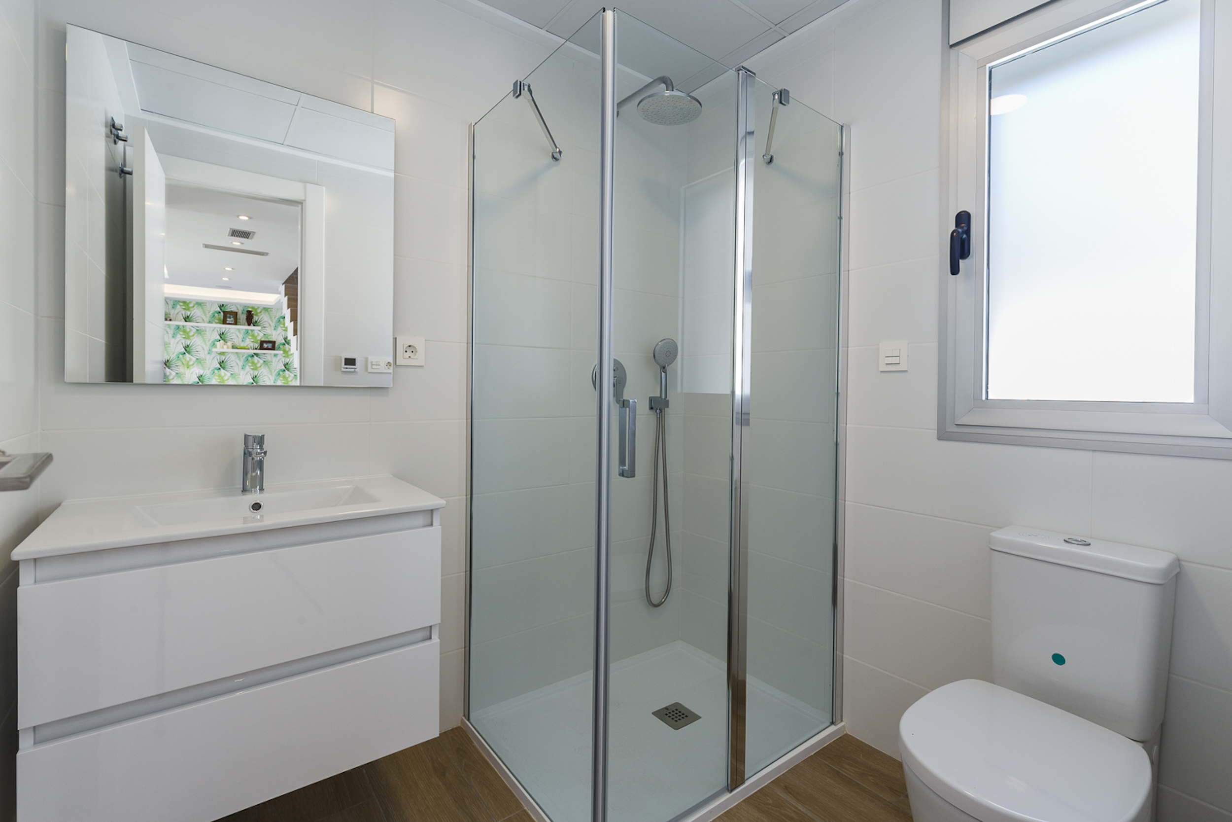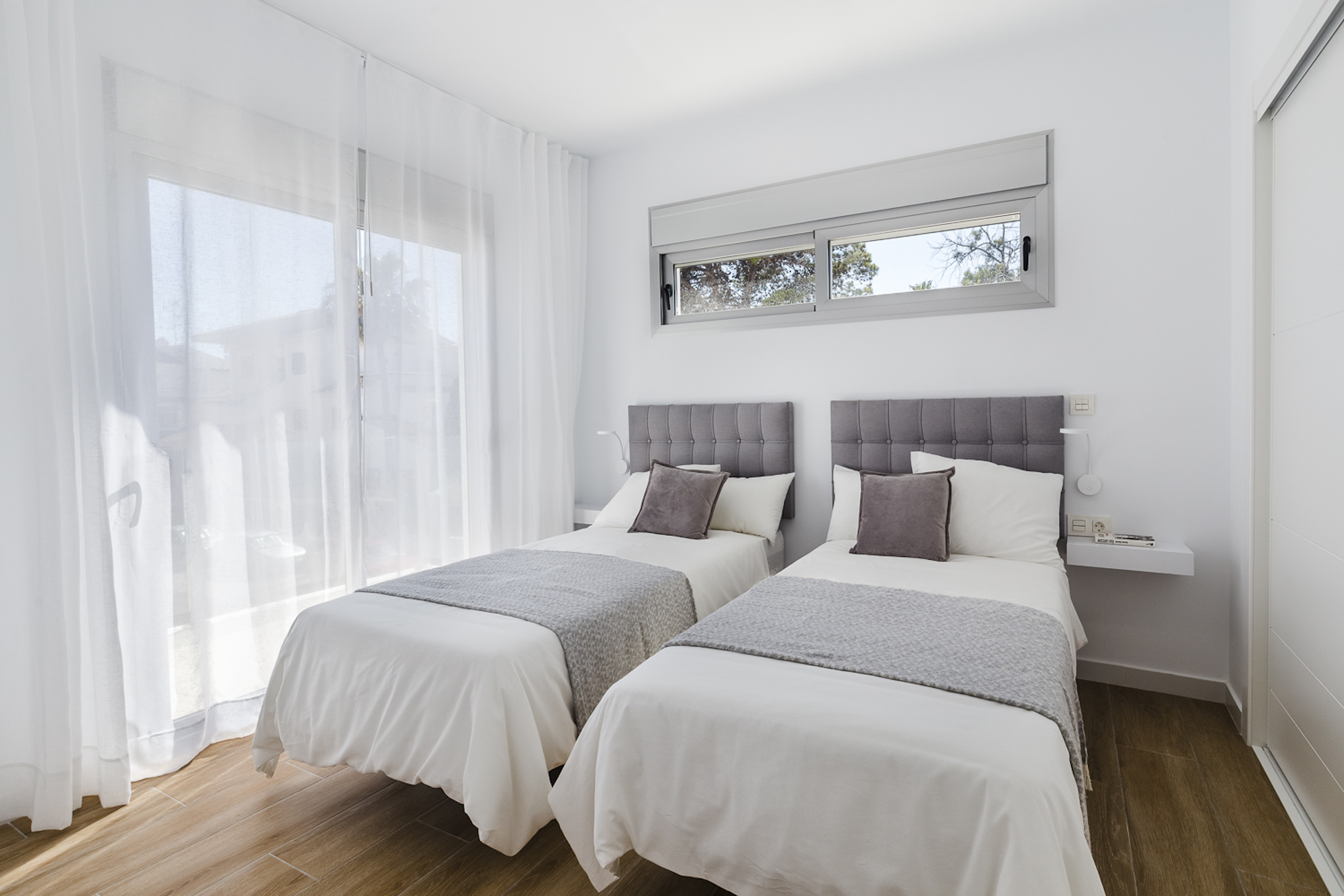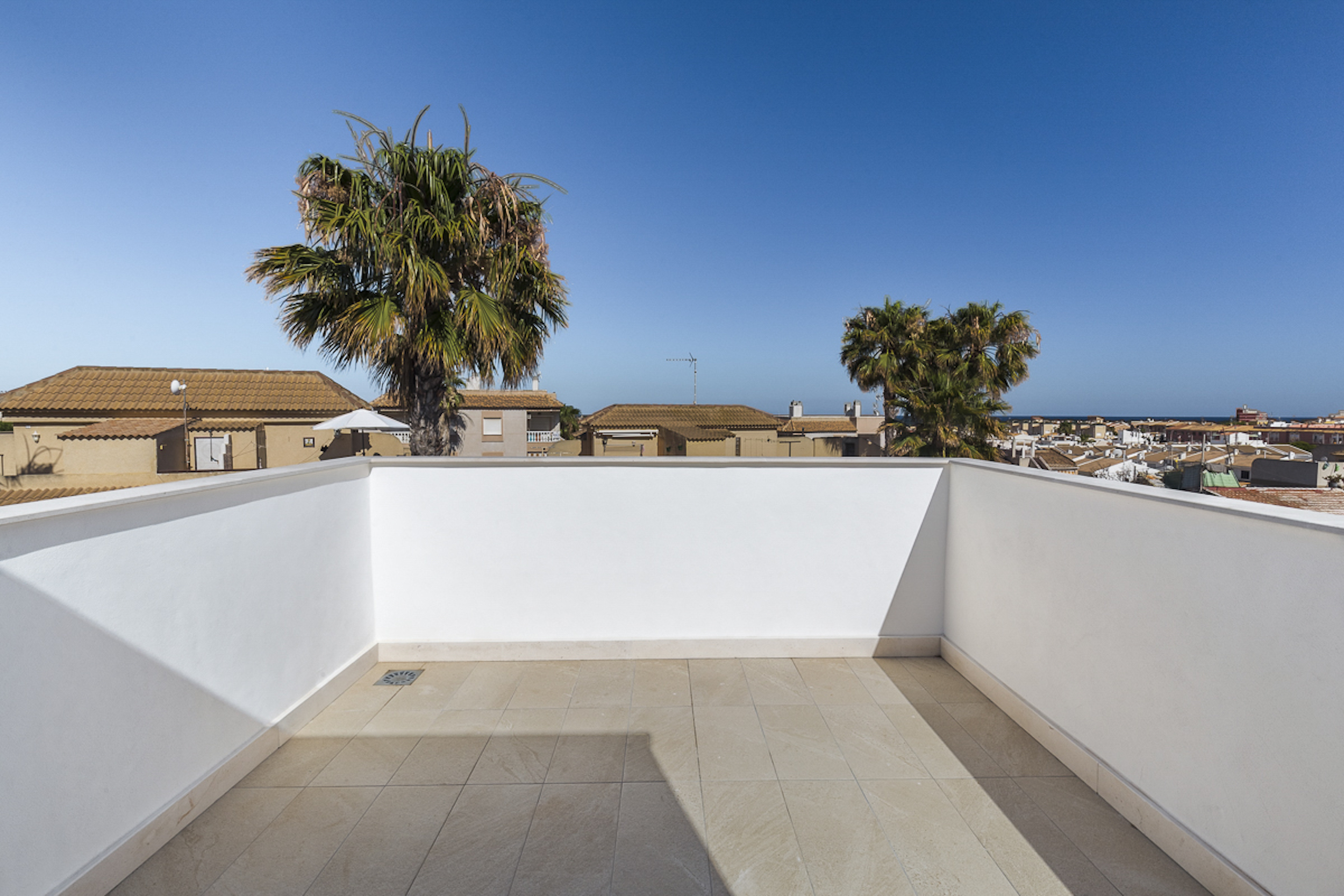 This 3 detached luxury villas project has been designed by Plania in a 600 m2 south face plot. These 120 m2 built stunning villas have 2 floors, 3 bedrooms, 3 bathrooms, solarium, private swimming pool and parking. They are located in “La Rosaleda” a privileged area of Torrevieja seaside, only one minute from the beach.