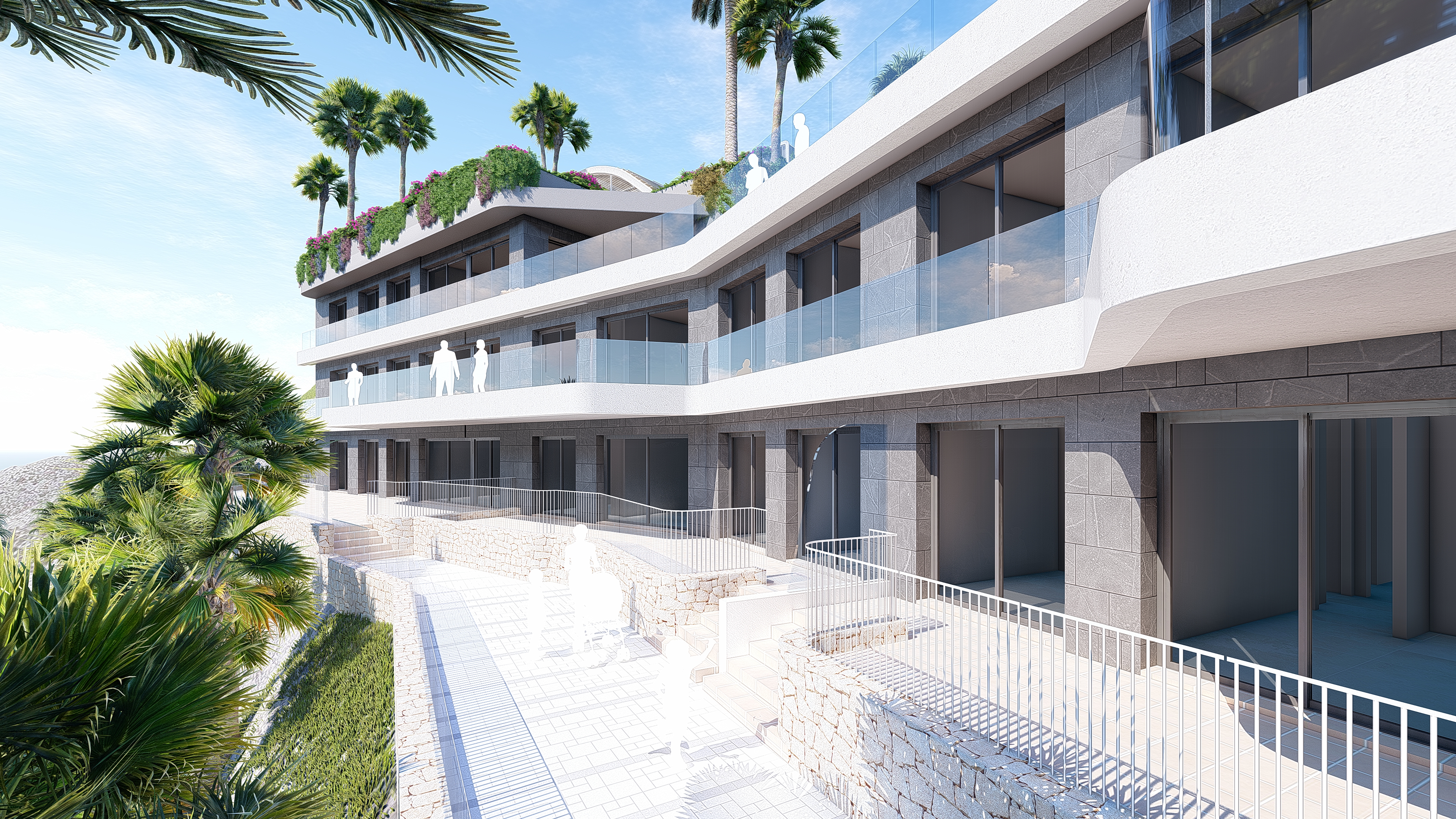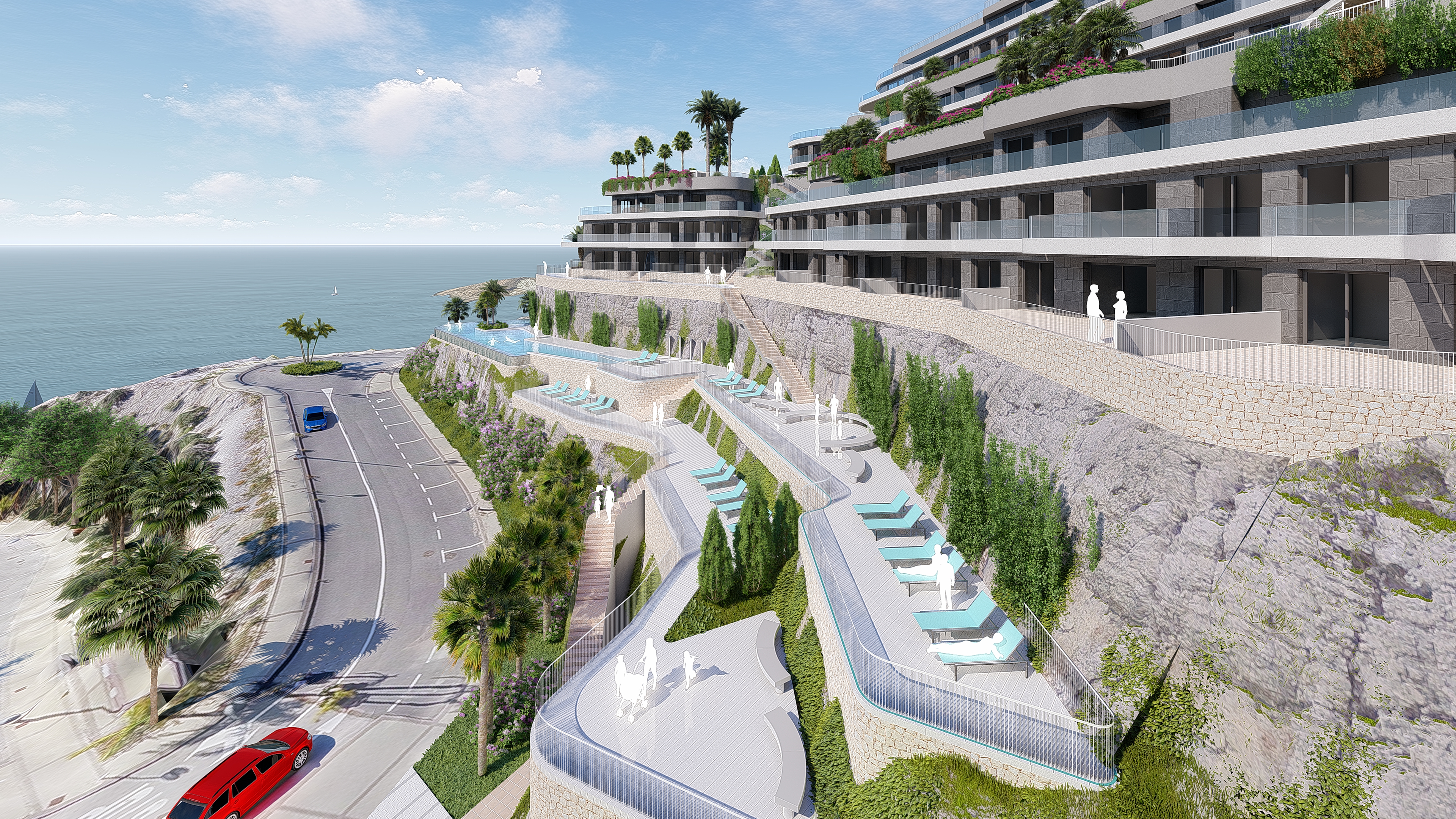 Its design and architecture blends in with the beauty of the natural surroundings where it is located, respecting and enriching it. Thanks to being high up, the homes have been designed to make the most of the natural light, with spectacular views of the Mediterranean Sea from their large terraces. The noble materials, the use of the mountain’s morphology and the huge amount of vegetation create the perfect harmony between the homes and their natural surroundings.