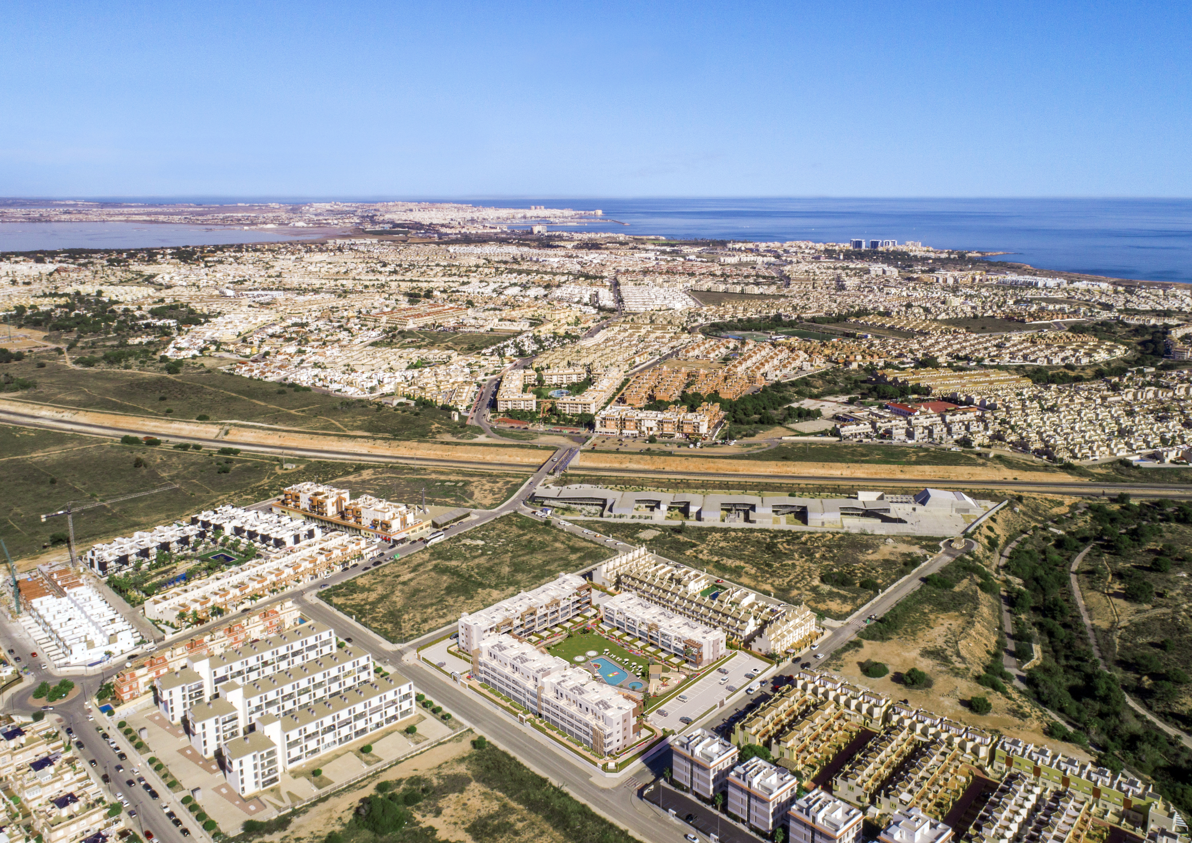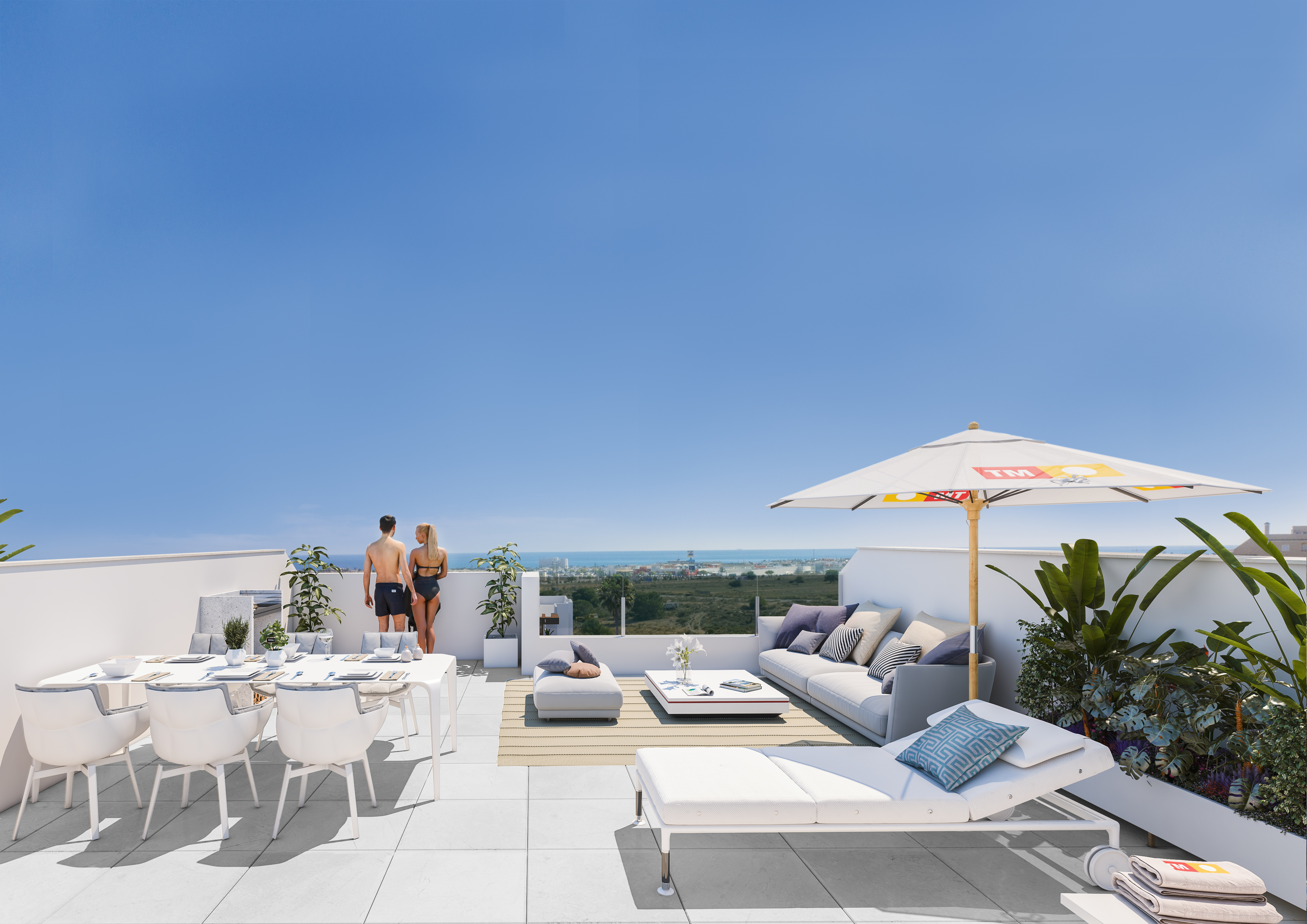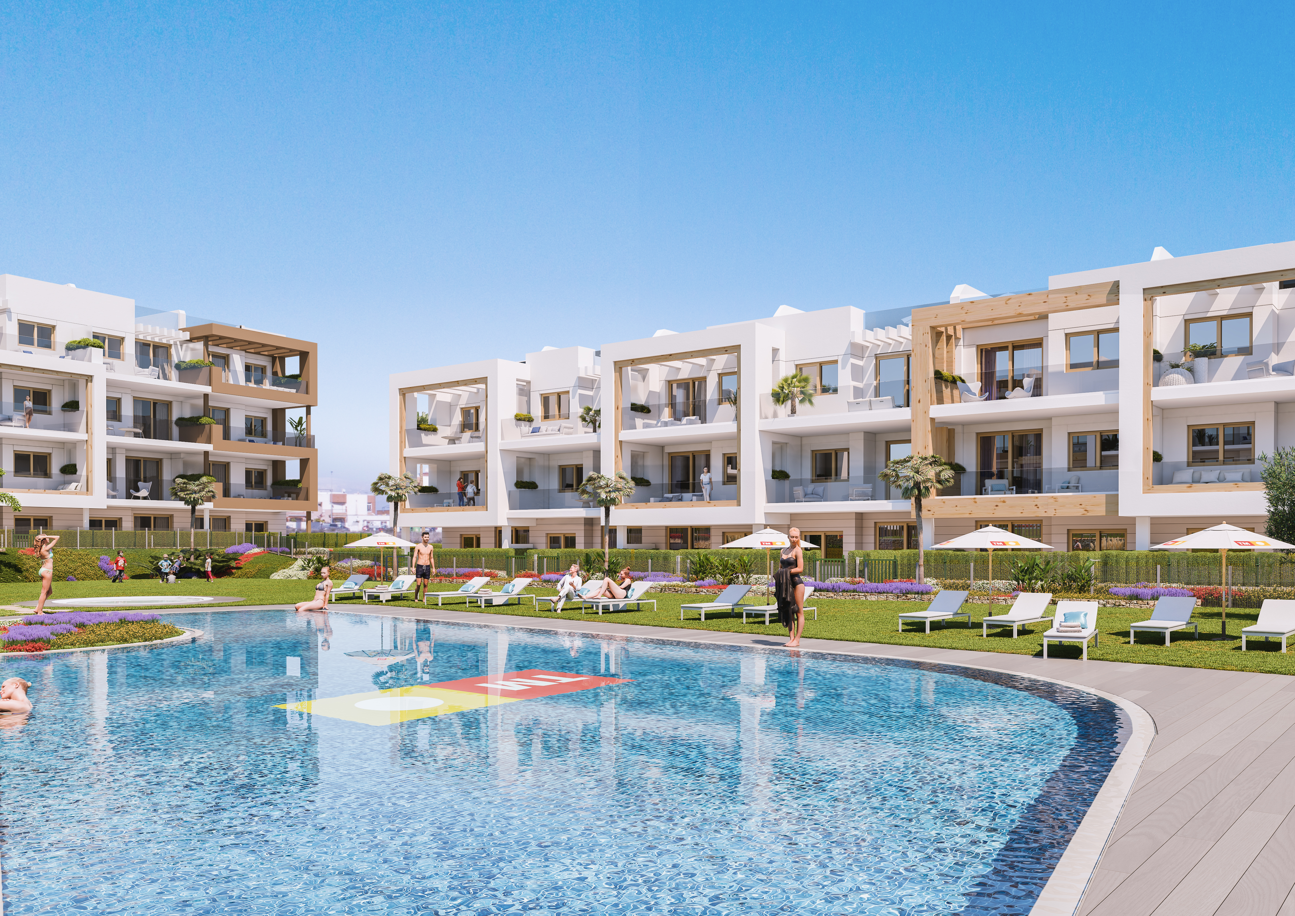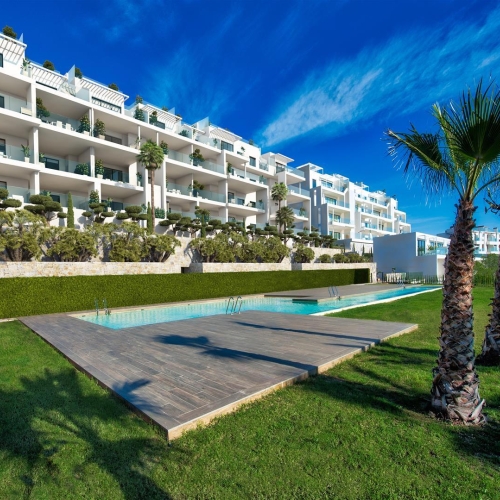 Large cubic terraces dominate this complex, with easy access to the nearby beach. Its modern apartments encircle a large swimming pool for adults, adjoining the kids pool.