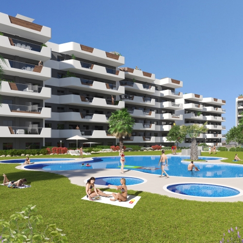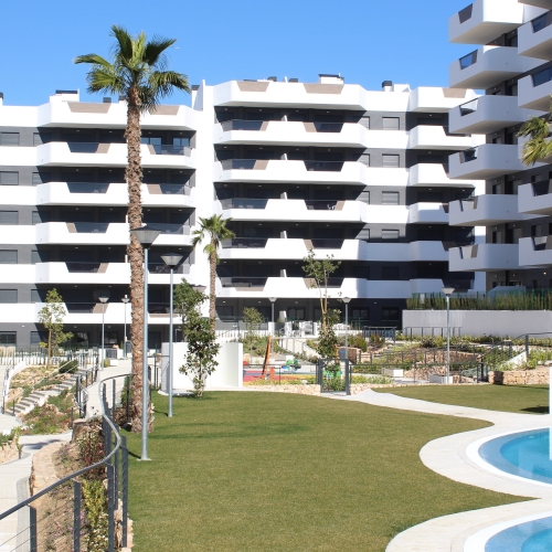 This is a new residential complex just a few minutes’ walk from the beach and a few minutes away from Alicante Airport. The extensive terraces of the apartments looks out onto landscaped gardens, swimming pools, jacuzzis and a poolside terrace with grass lawns and trees. The kids will have a blast in their own pool and play area, complete with swings, slides and seesaw, all within the secured perimeter of the complex. Enjoy the freedom to sunbathe for however long you want with complete peace of mind. There are also parking lots for bicycles, as well as storage rooms to keep your belongings, creating more space in your home.