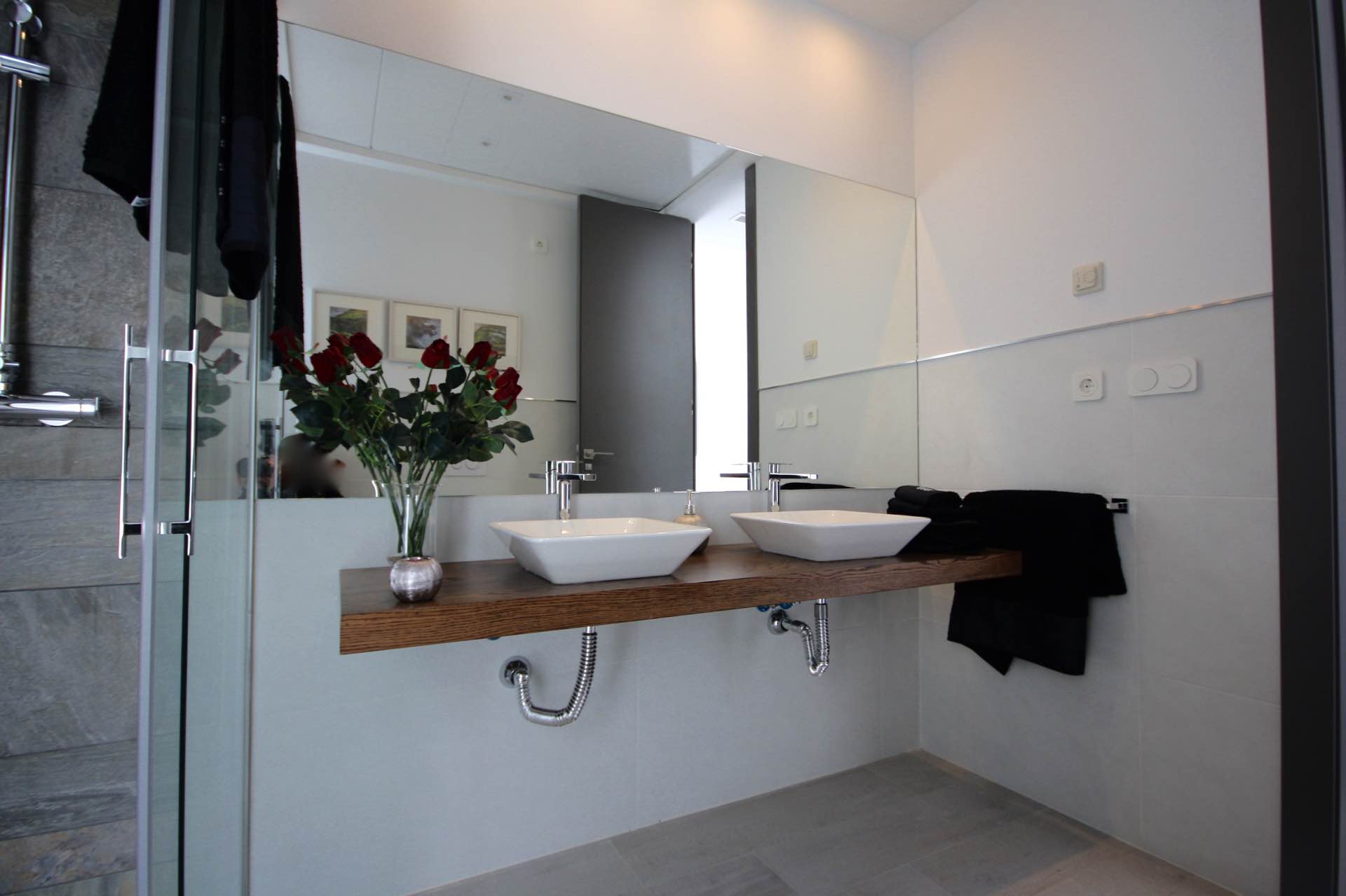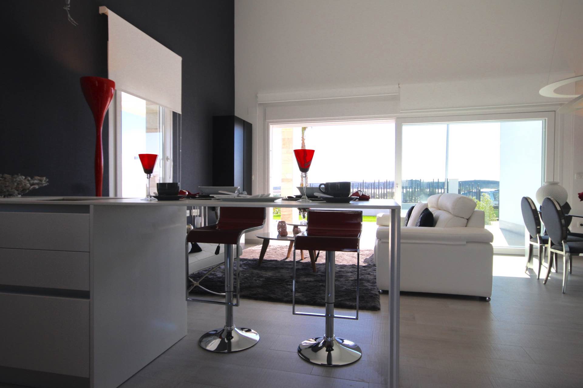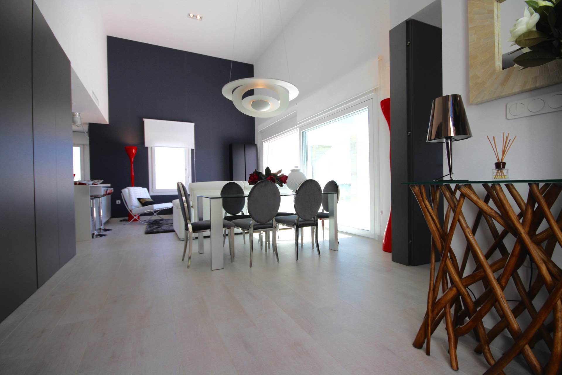 The architecture is modern contemporary style on the exterior, with the interior made with first class materials. The high ceiling windows and big windows towards the terrace gives the spacious living room and open kitchen lots of natural light. The villa has a private parking space. The south facing terrace gives you sun from dusk till dawn.