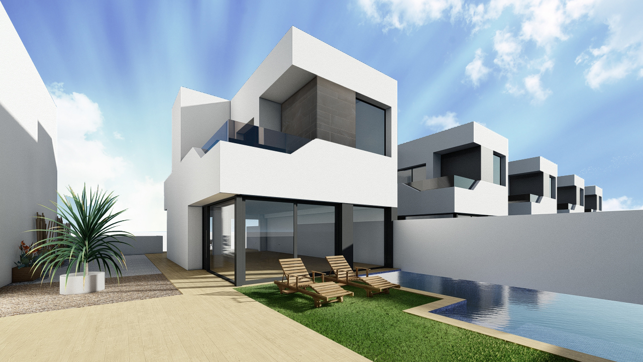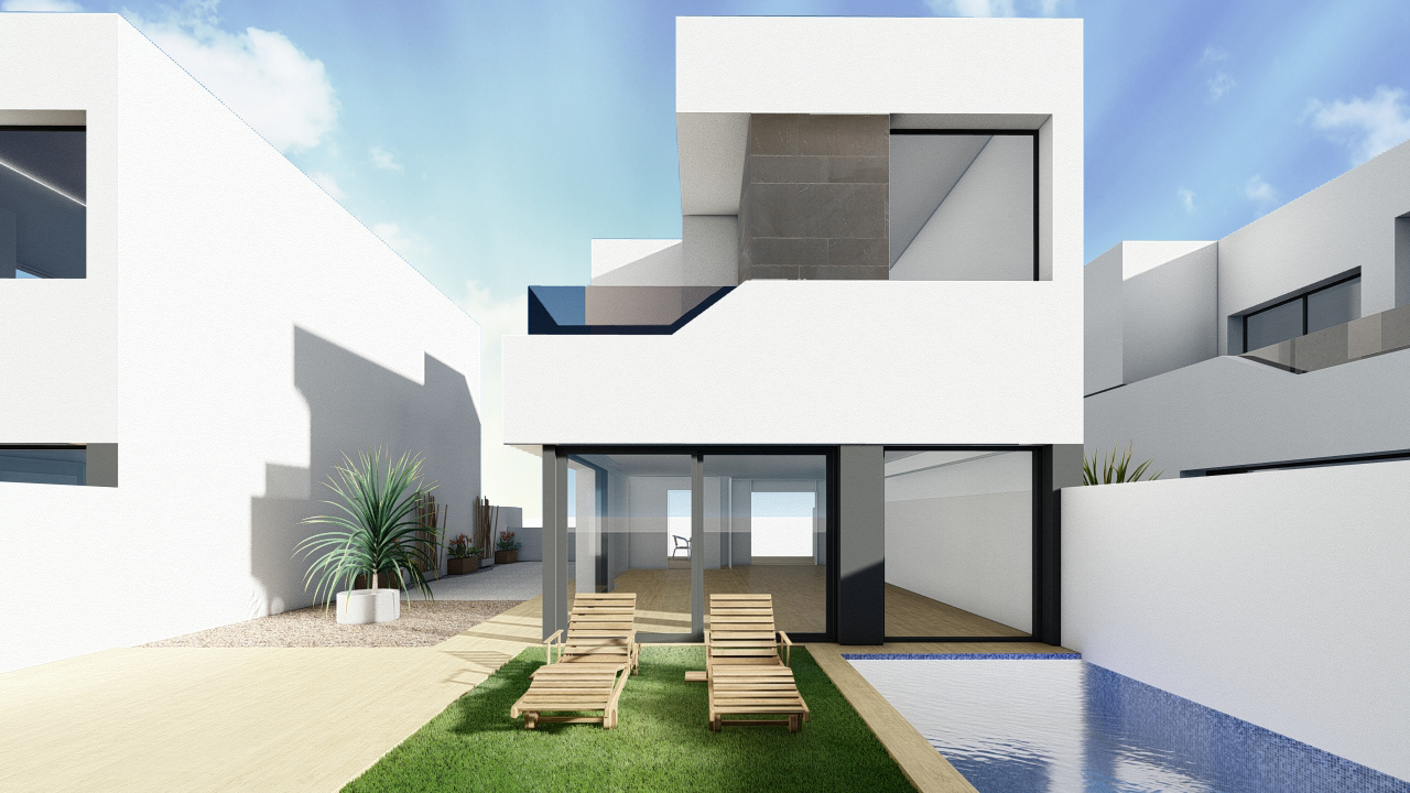 Modern style villas with living area, open kitchen fully furnished, 3 bedrooms, one of them with the possibility of being an office, 2 bathrooms, and a large basement where you can materialize any desired space according to the needs of each client. Private plot with private car access to a private street until the garages of the houses, 2 terraces, one facing south and the other facing nord, private pool and Mediterranean garden with amazing views.