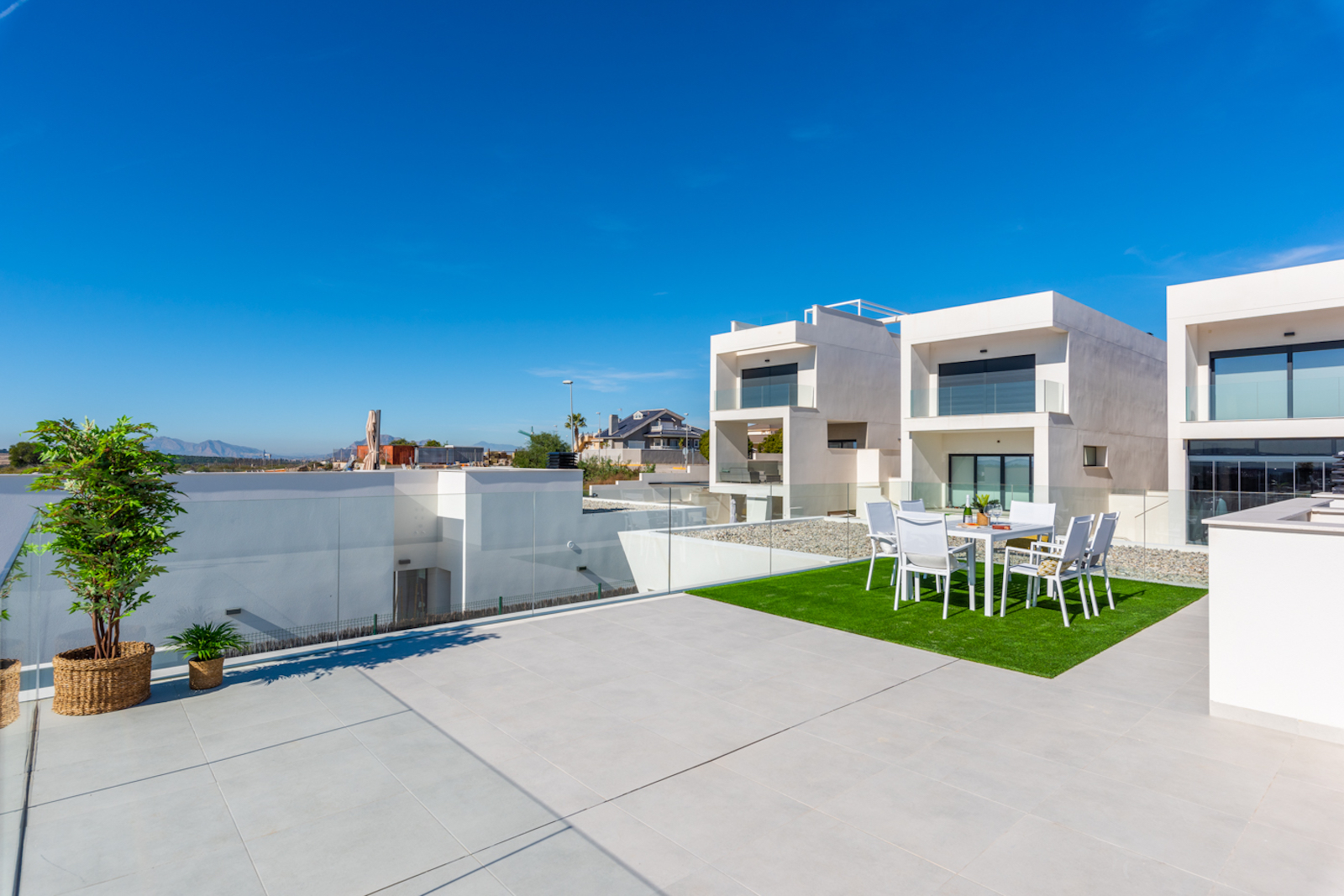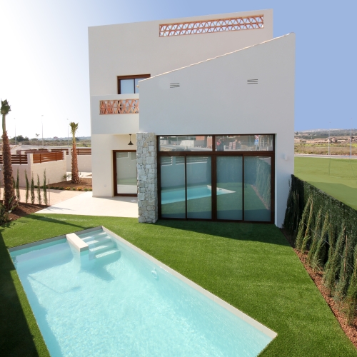 Modern style properties, consisting of a spacious living dining room with open plan kitchen, 3 bedrooms, one with dressing room and 2 bathrooms (one en suite). Each private plot is distributed in terrace, parking area, own swimming pool and Mediterranean style garden, each villa has also a solarium with views.