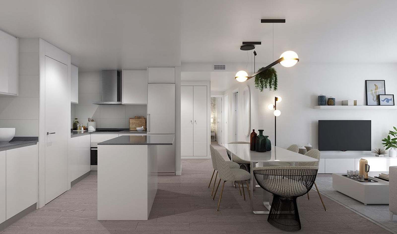 Homes with excellent distribution and modern design with top quality finishes, fitted and equipped kitchen. They have a full ducted air conditioning system in the living room and bedrooms, indoor and outdoor equipment via aerothermal system and clean technology. There is also the possibility of choosing between several proposals for finishes with no added cost..