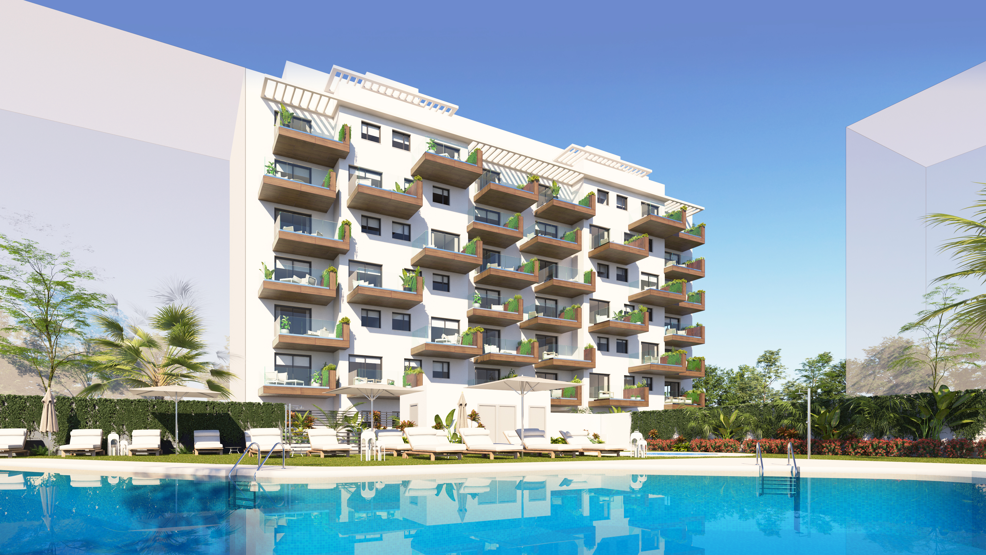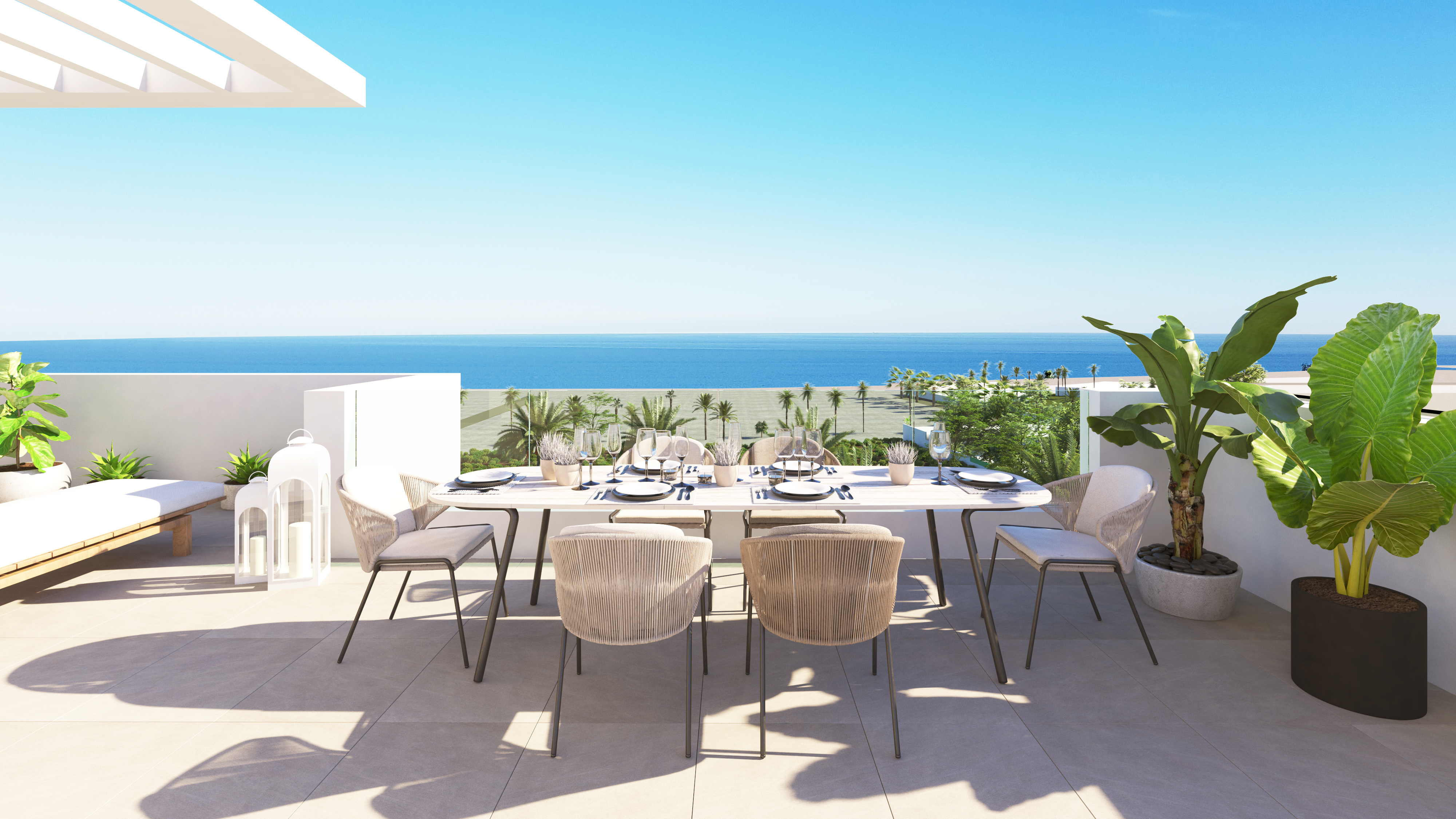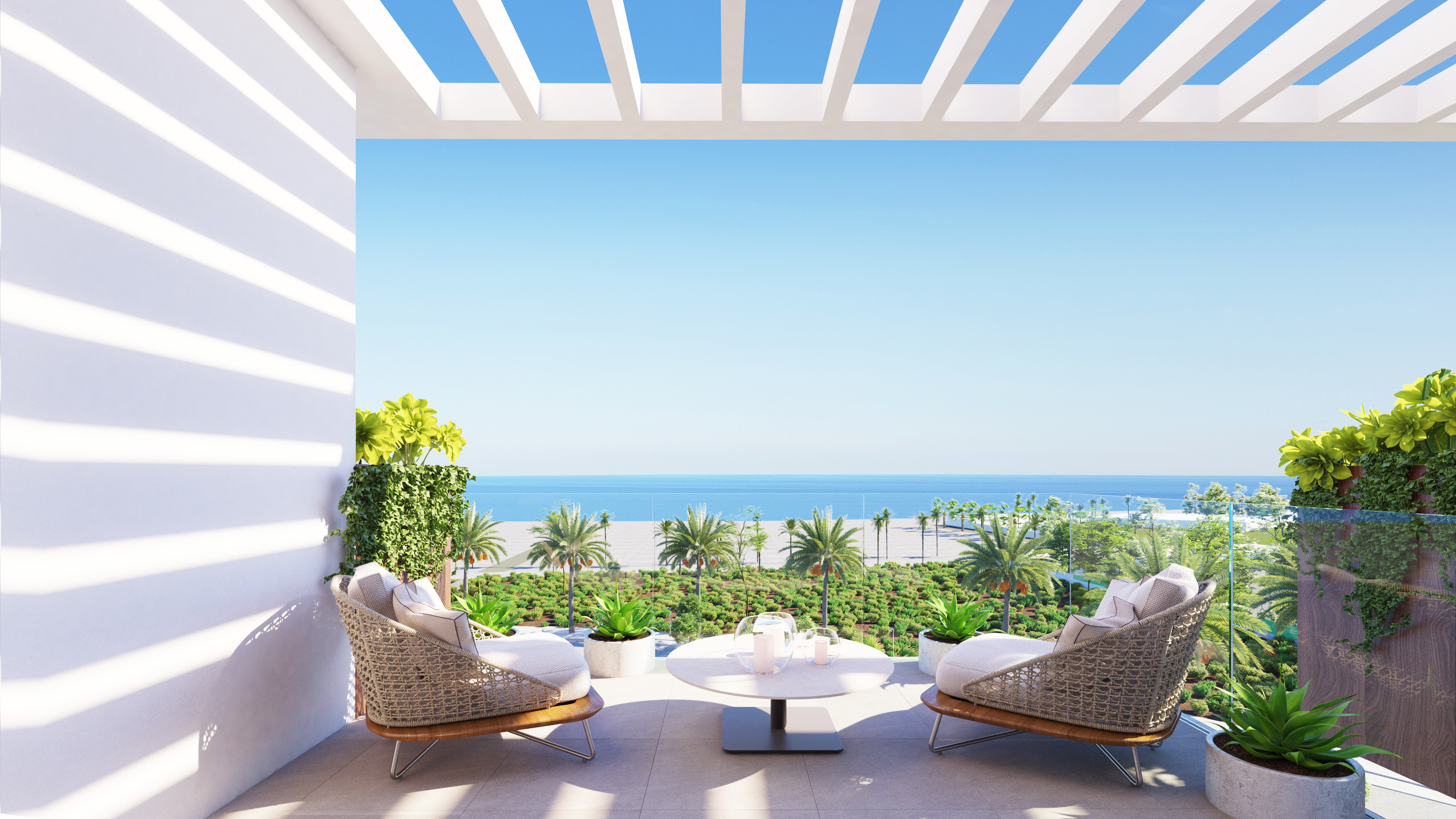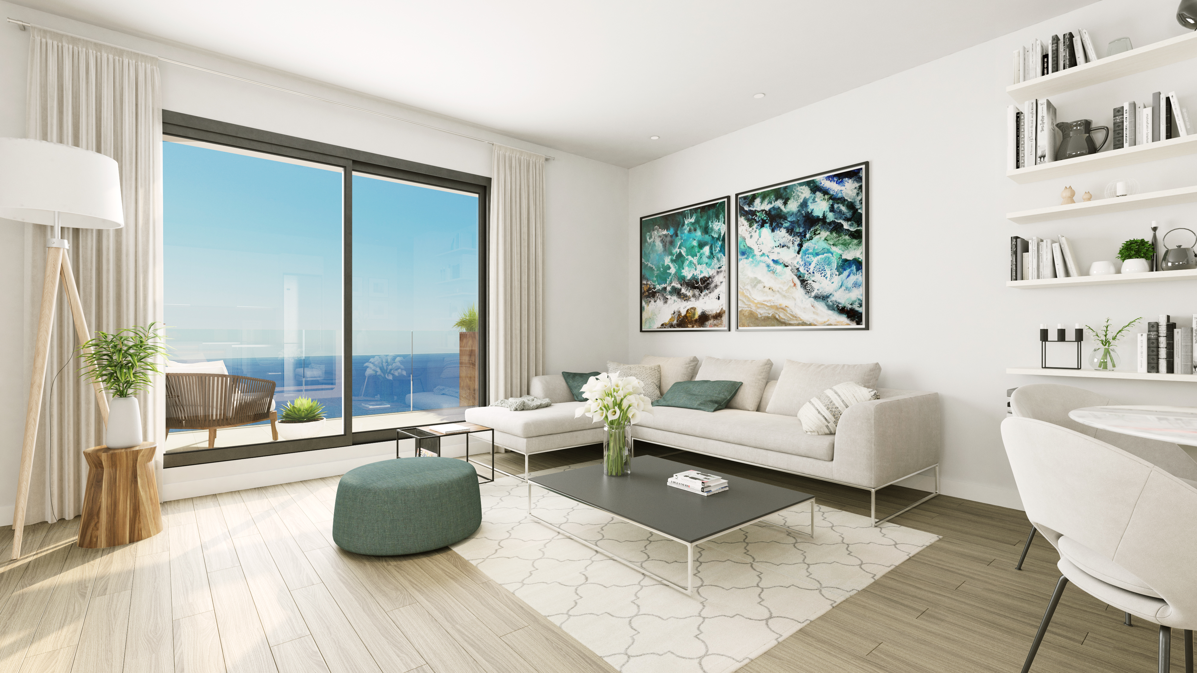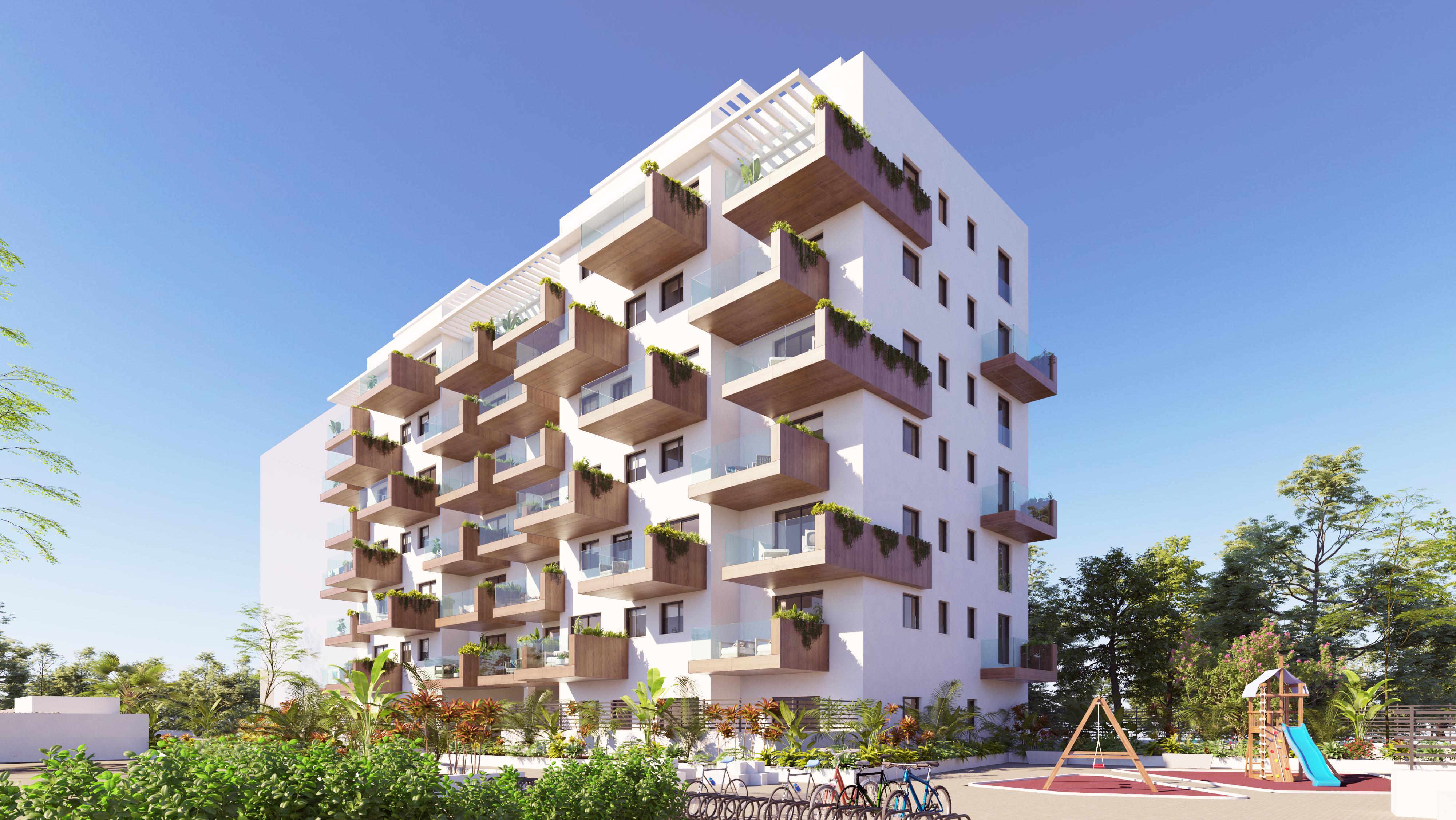 42 homes with 2 and 3 bedrooms: ground floors with garden, floor flats, and penthouses. All of them are south-facing and have wide terraces with sea views.