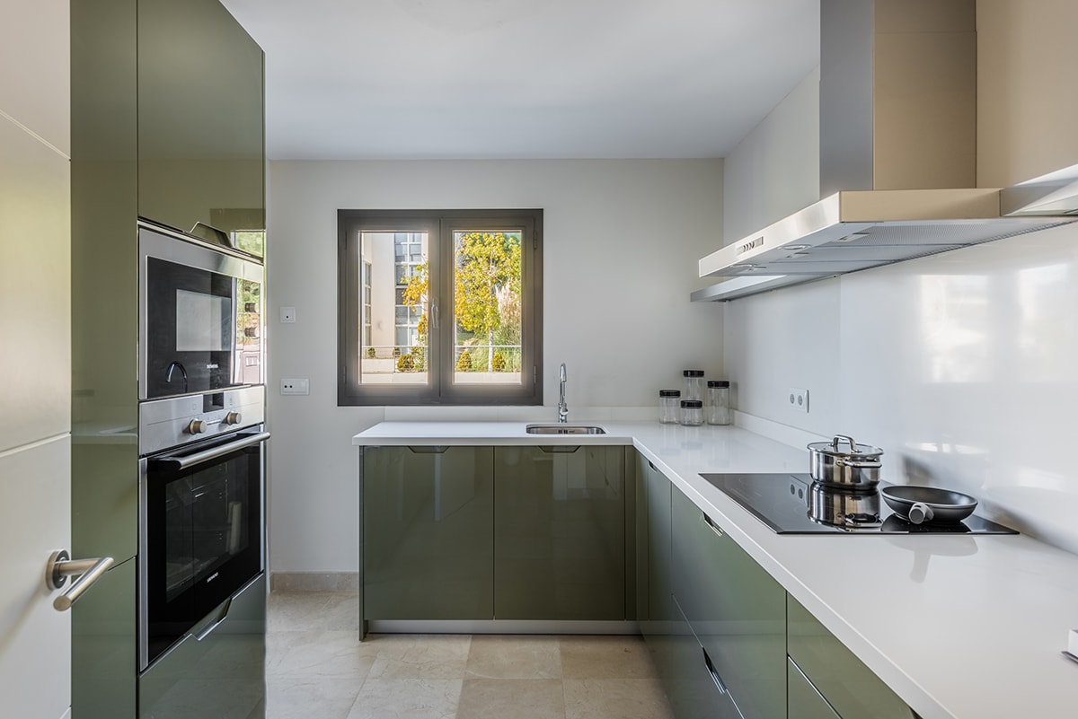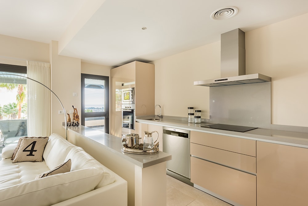 These smart stylish apartments offer the perfect combination of contemporary design, comfort and high quality finishes. Double aspect windows and large patio doors allow natural light to bathe the living room whilst providing access to an impressive private terrace (penthouses boast 2 terraces/ solariums and ground floor apartments have a private garden). Each terrace is edged with an attractive wood and glass wall designed to be aesthetically appealing and also to take advantage of the spectacular, golf and in some cases sea views.