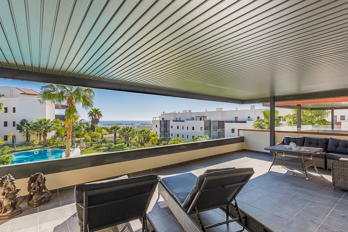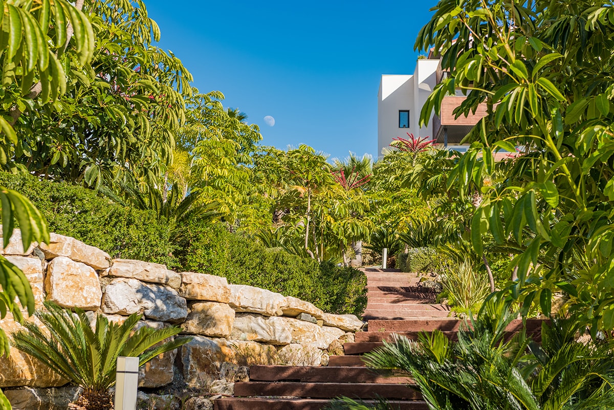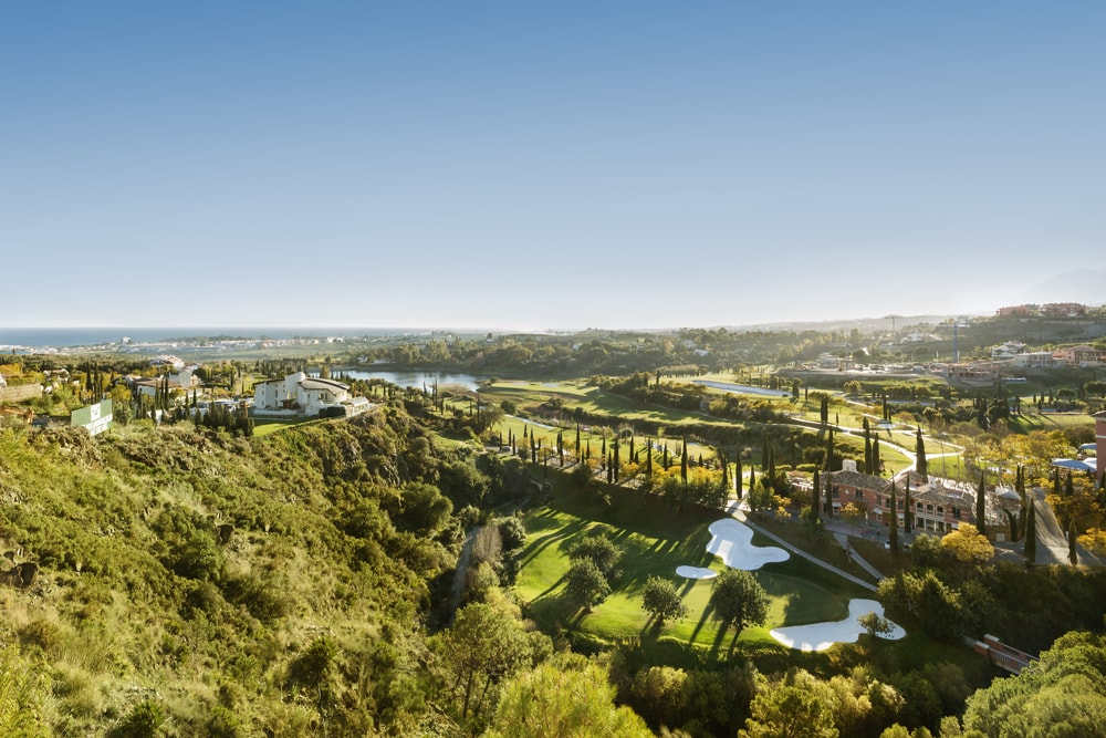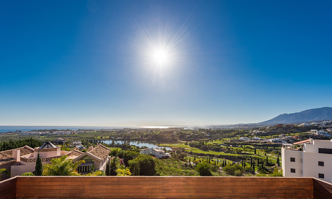 The architecture marries contemporary elements like glass railings and slate grey patio tiles with traditional European design such as wood cladding. Extensive outdoor space virtually doubles the living areas and provides those all-important majestic panoramic golf, mountain and sea views. A neutral palette and pale marble tile floors enhance the sense of light and space, providing the perfect backdrop of stylish accents such as dark wood bathroom vanity units and window frames