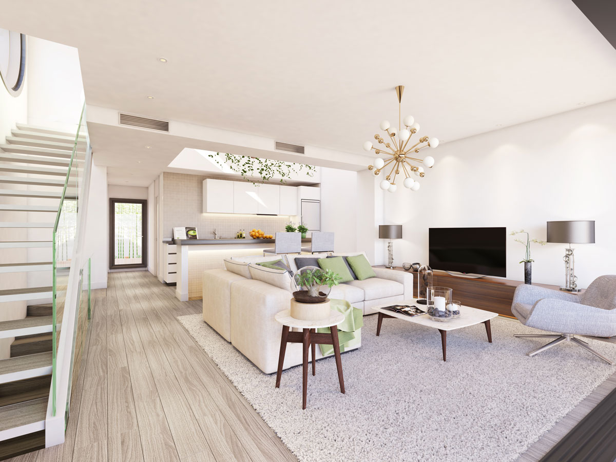 Notable features include a large basement, 2 parking spaces, and two private terraces to ensure sun morning and afternoon. The 4 bedroom units boast a modern sunlight above the open plan kitchen, with glass walls on the first floor maximizing interior natural light.