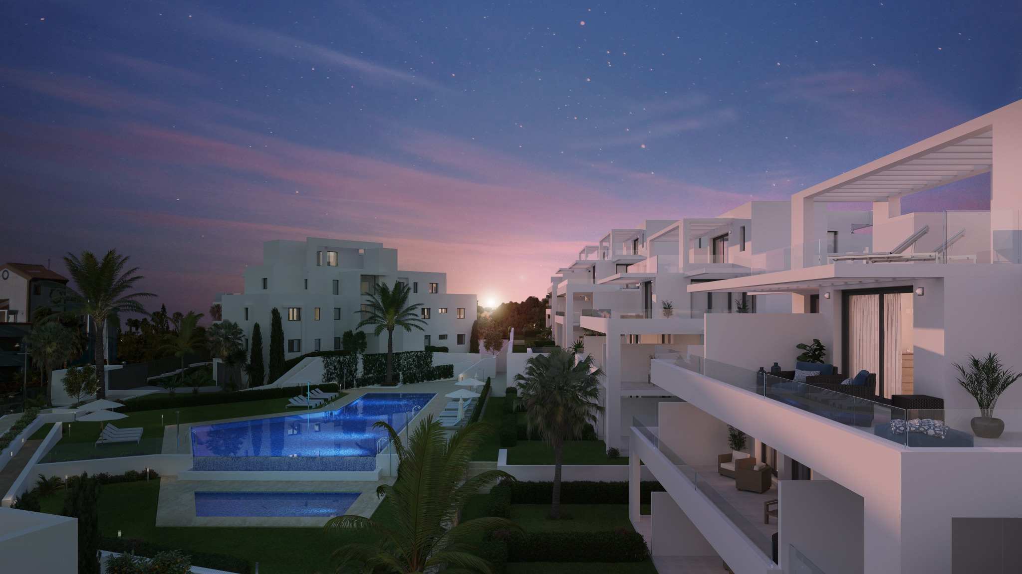 CORTIJO DEL GOLF consists of 64 apartments of modern and exclusive design, divided into 8 blocks. The development has 16 apartments of 3 bedrooms, 32 apartments with 2 bedrooms, 8 penthouses with 2 bedrooms and 8 duplex penthouses of 3 bedrooms. The 3-bedroom apartments have a constructed area of 113,92 m², with terraces with a surface area of 36,28 m², and gardens, which are located on the ground floor, ranging from 39,22 m² to 151,83 m². The 2-bedroom apartments have an average built area of 99,63 m², with terraces with a surface area of 37,29 m², and gardens, which are located on the ground floor, ranging from 35,10 m² to 104,20 m². The 2 bedroom penthouse has a constructed area of 94,82 m², with surface terraces of 96,14 m². The 3 bedroom penthouse has a constructed area of 142,93 m², with terraces with a surface area of 146,13 m². Exclusivity, quality and contemporary design architecture in a natural environment. All apartments are bright, with kitchen integrated in the living room and fully equipped and furnished with Siemens Appliances, air conditioning, alarm system installed, smoke detector, etc.