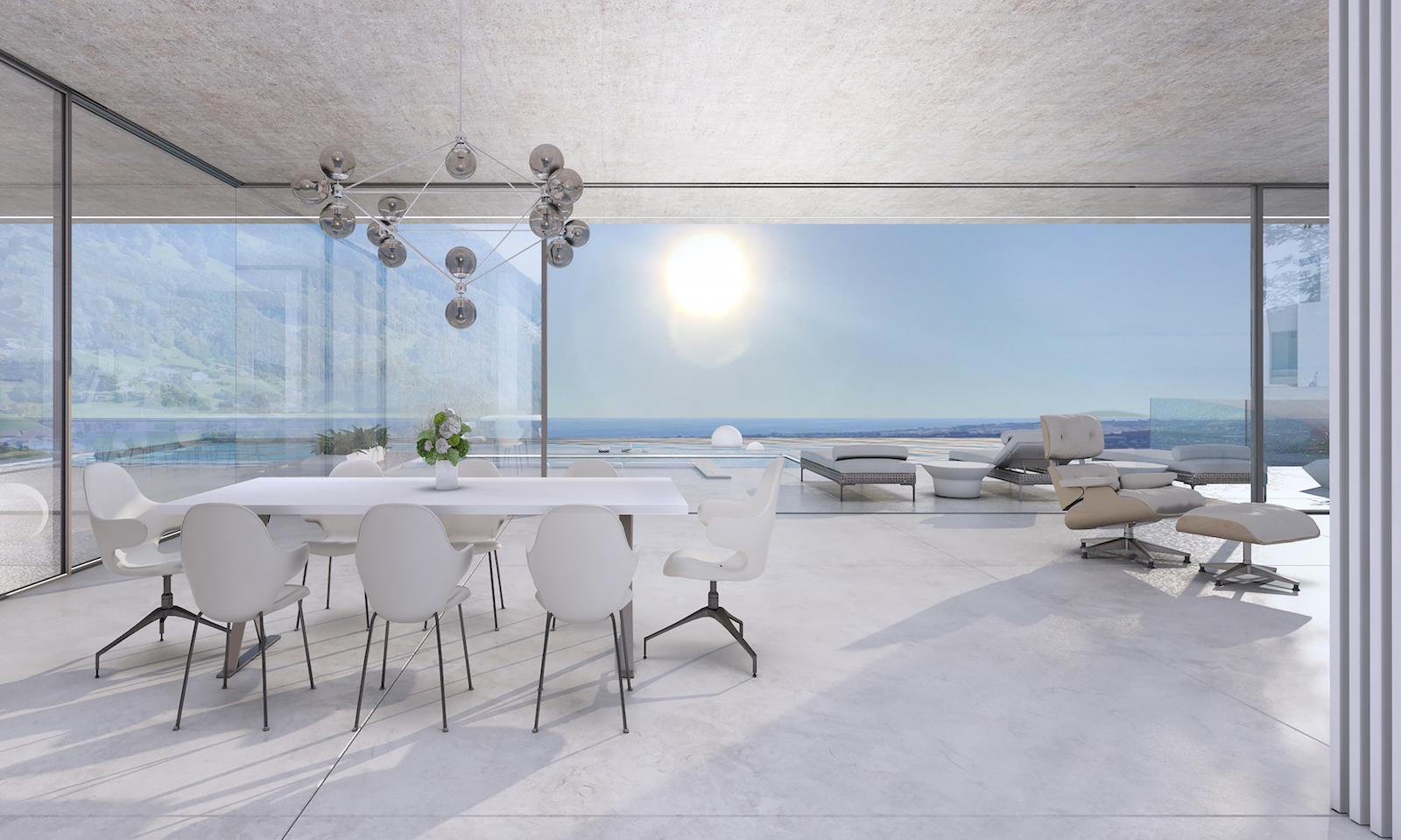 The sensation of harmony is intensified by using minimalistic window frames that are embedded into the walls. The sliding panels are hidden into the walls, hence opening the house towards the outdoor.