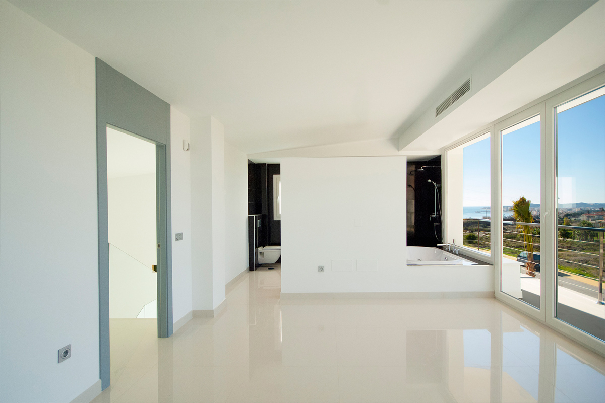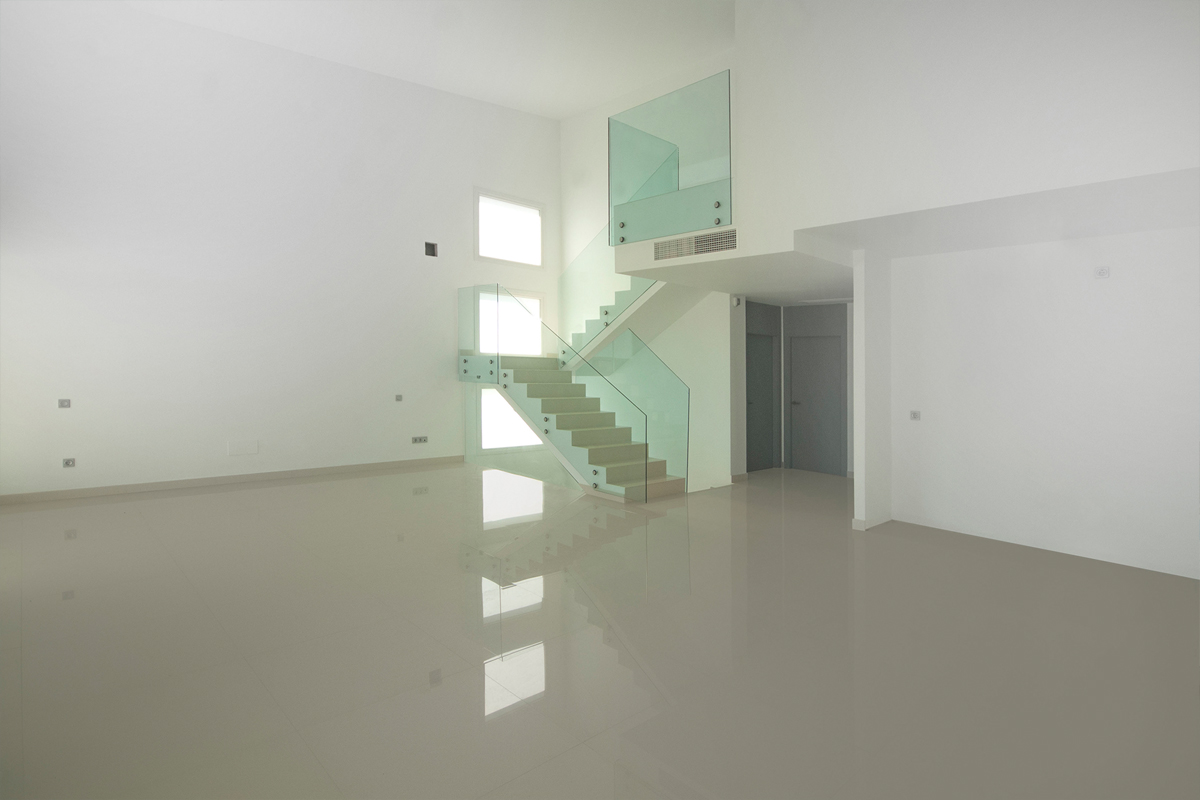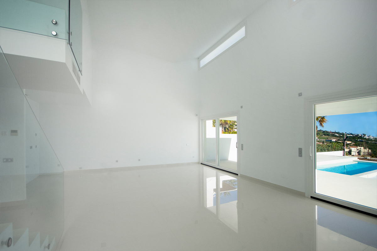 1st FLOOR: Entrance through a walkway up to the front door, Distributor, Guest toilet, open kitchen with island, high and low furniture, Living room with double height dining room, large windows with exit to the terrace occupying the entire south and west facade, Covered and Uncovered Terrace, Garden and Pool access and BBQ.