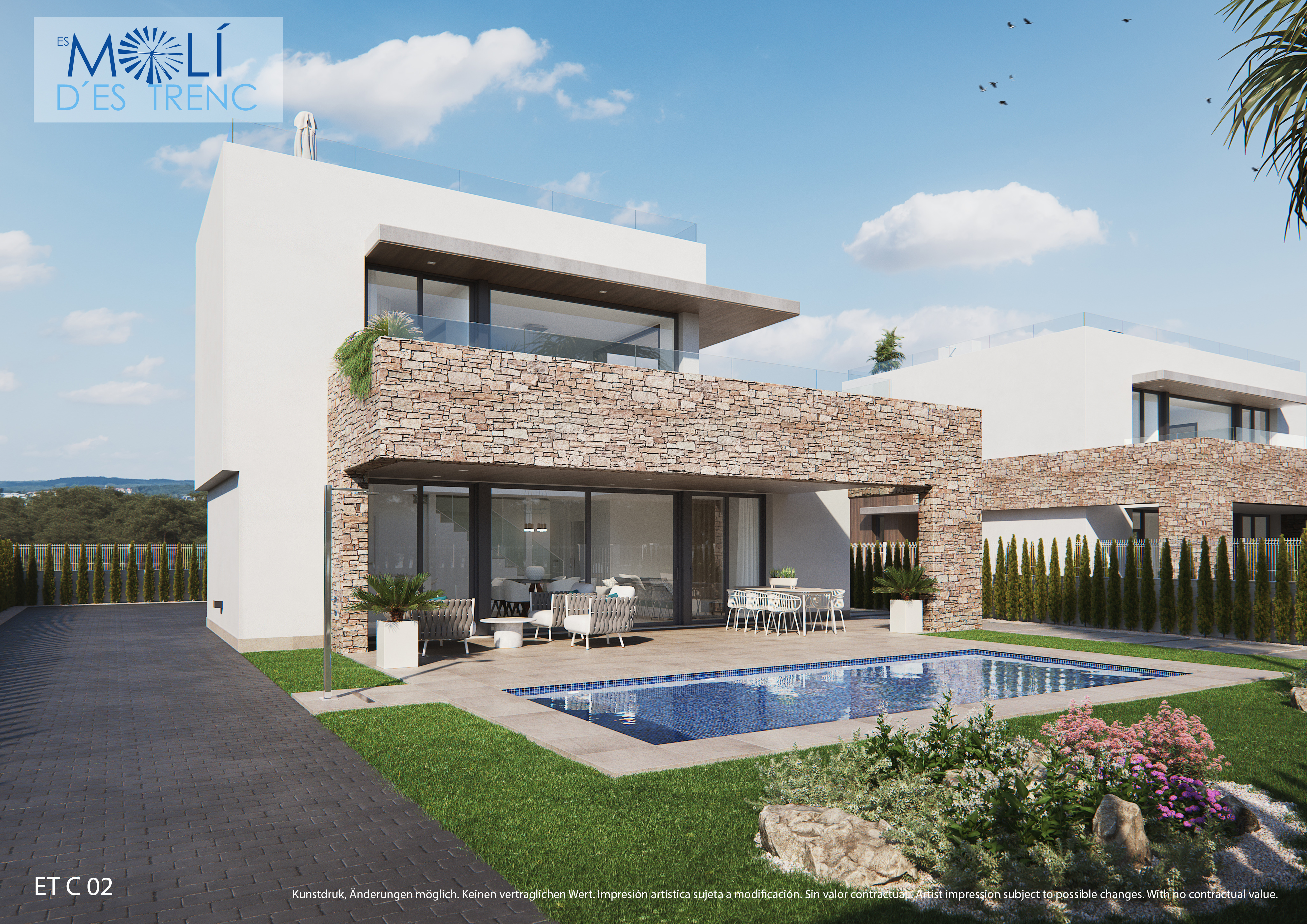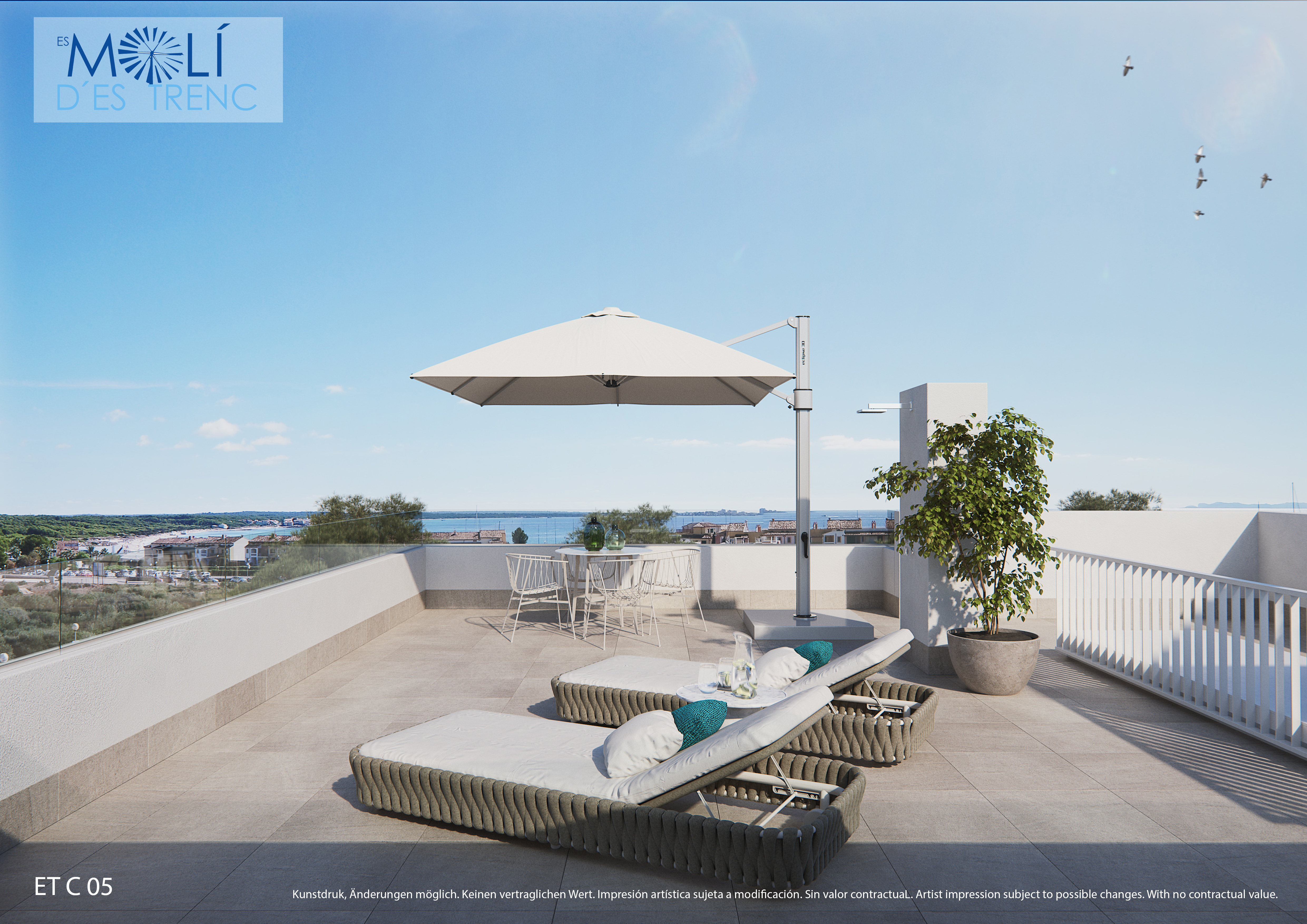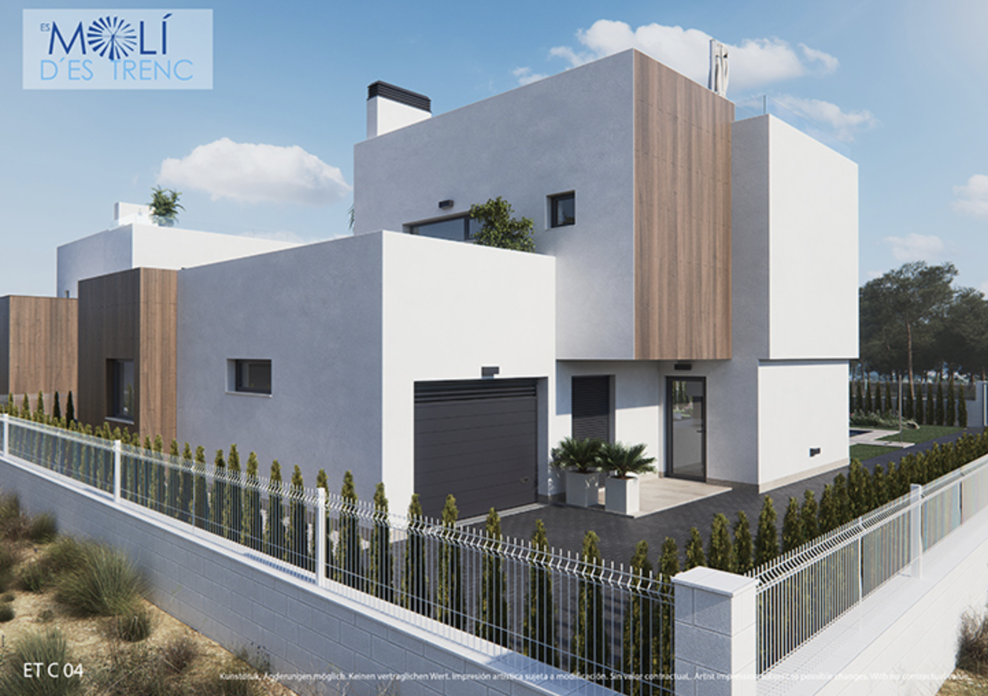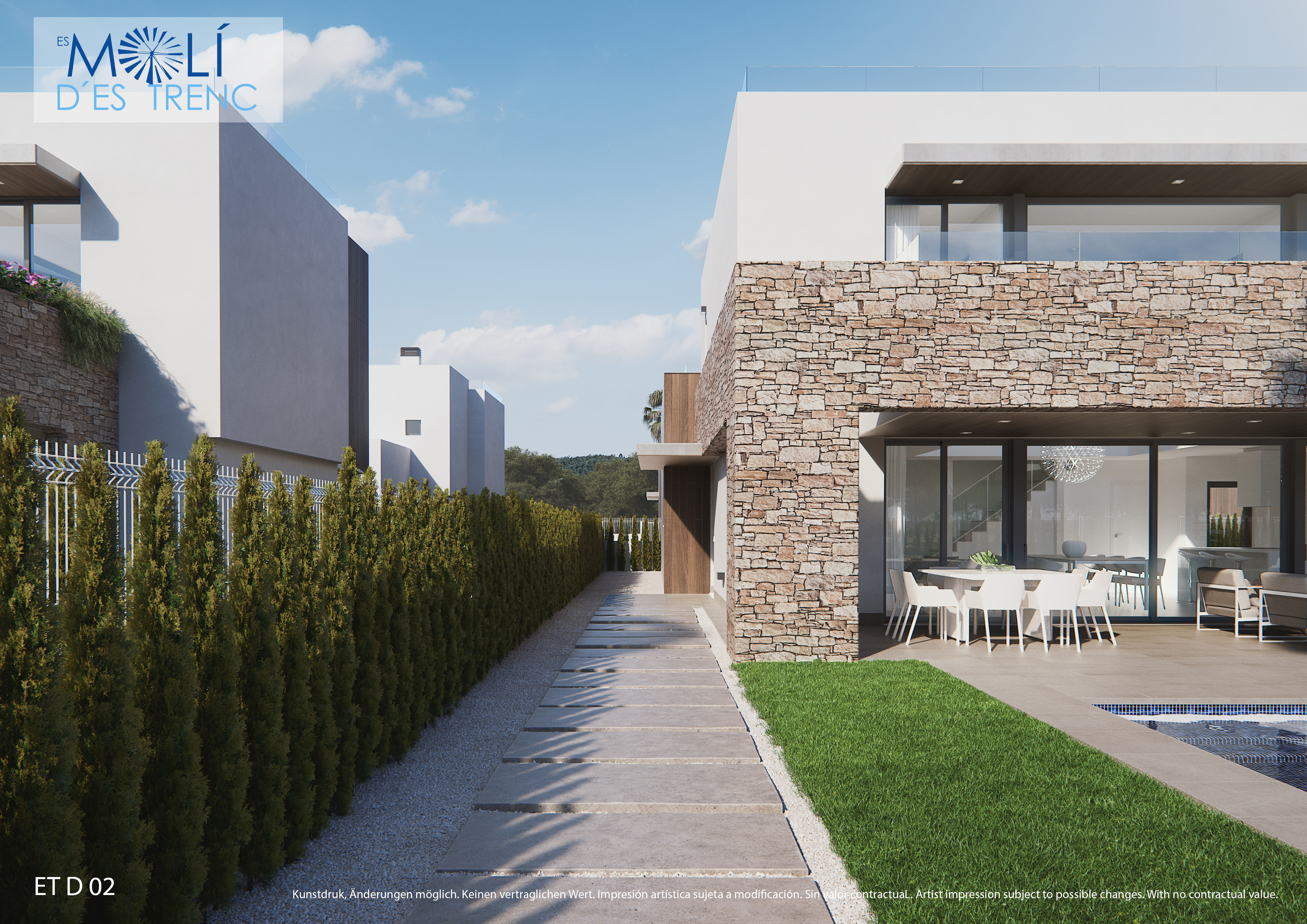 Es Molí d’es Trenc is a residential complex comprising 11 detached villas with 2, 3 or 4 bedrooms located in the town of Sa Rápita in Majorca. All homes have independent accesses, with their own garden area and private pool, as well as a closed parking area and terraces on which to enjoy the beautiful Majorcan weather and year-round sunshine. As a special feature of the project, inside the estate is a traditional water extraction mill (Molí) up for restoration and giving its name to the project.