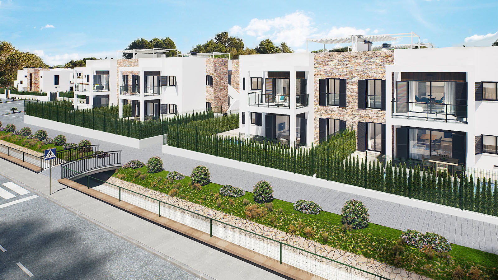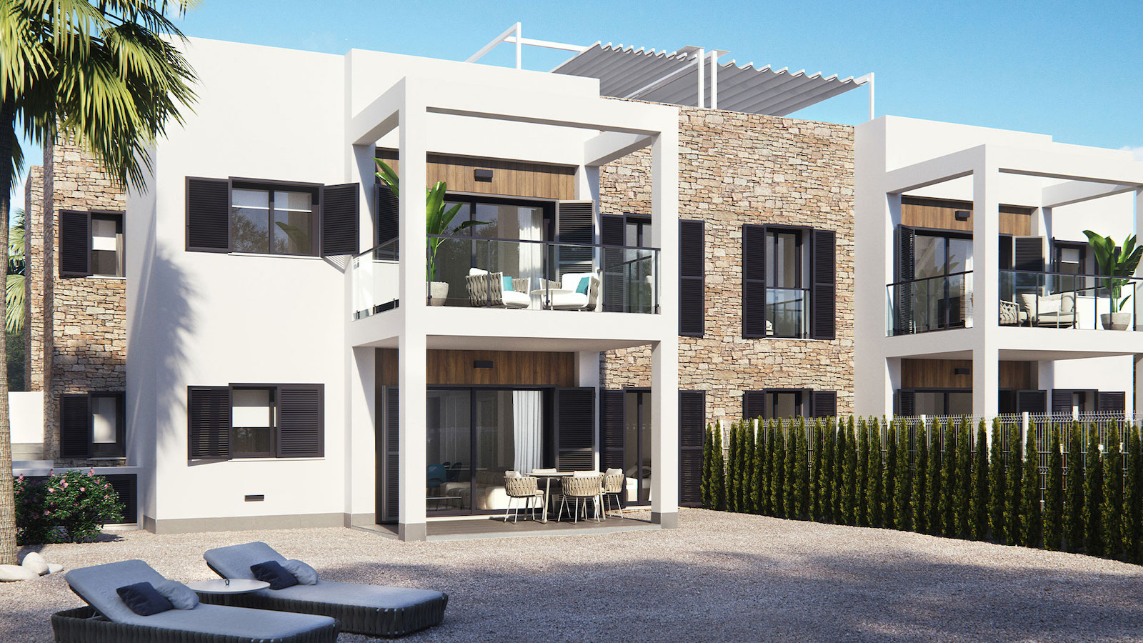 The development comprises 8 bungalows of 2 bedrooms and 2 bathrooms. Ground floor properties with terrace and large private garden in an area with 290 square meters. But, if you prefer enjoying a home with solarium, those might be the properties on the first floor, provided by a large terrace with more natural lightning and ventilation.