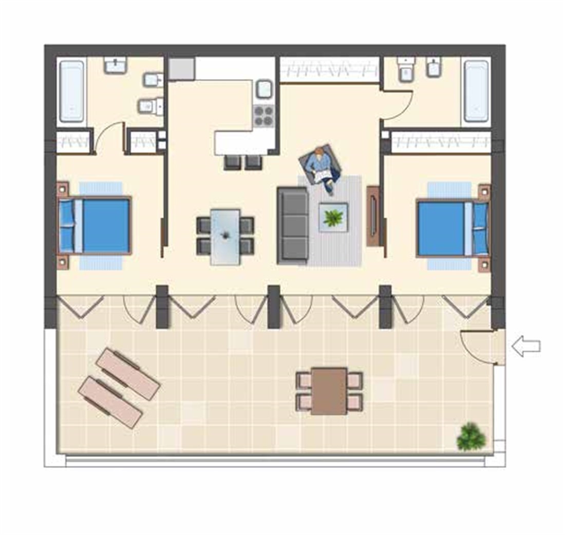 There are 1, 2 and 3 bedrooms apartments available on one or two floors. All of them with the pre-installation of the air conditioning system included.