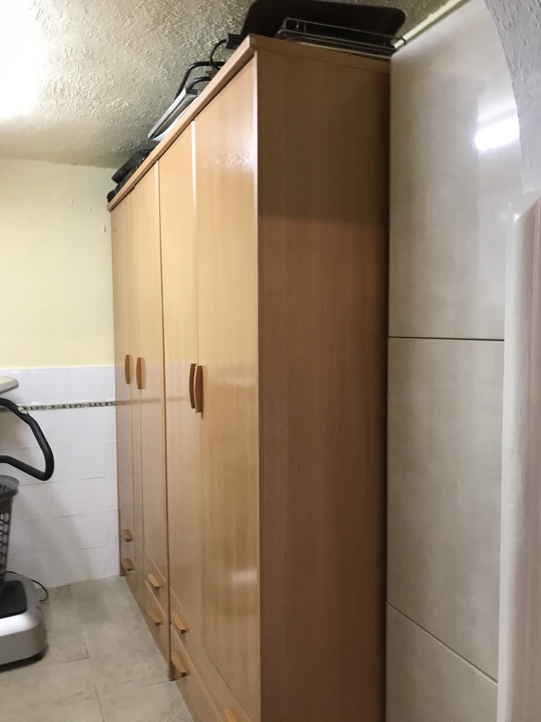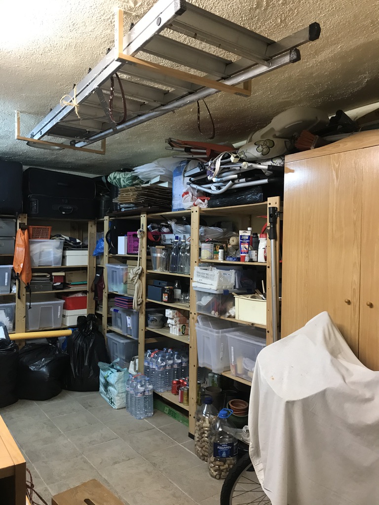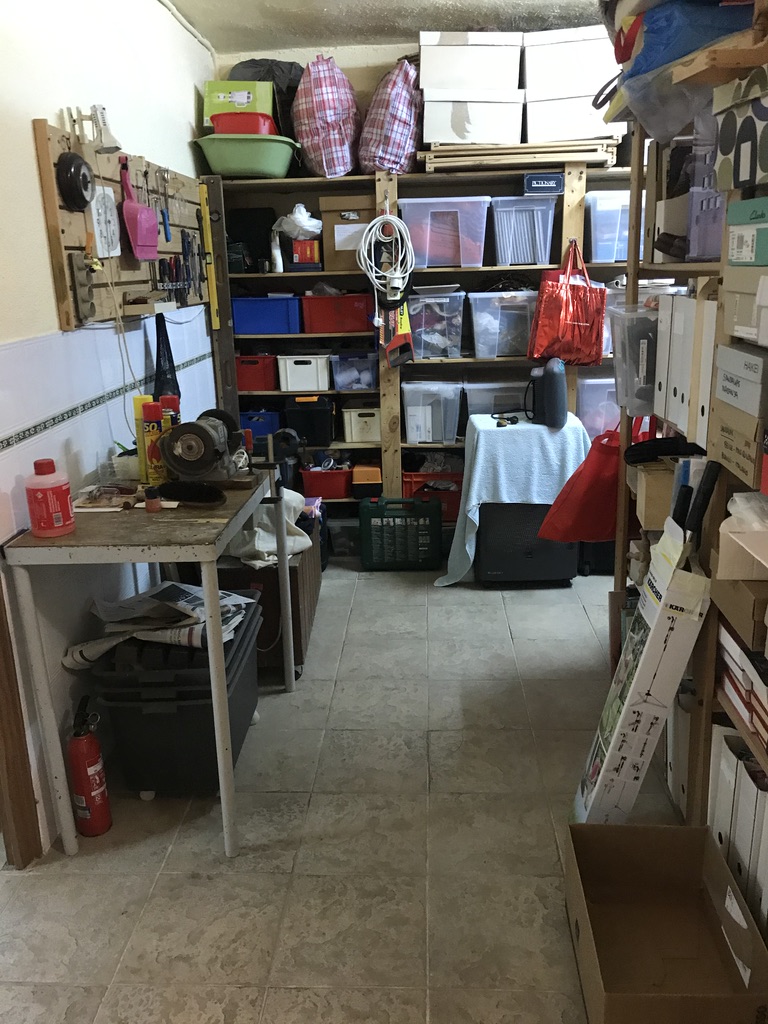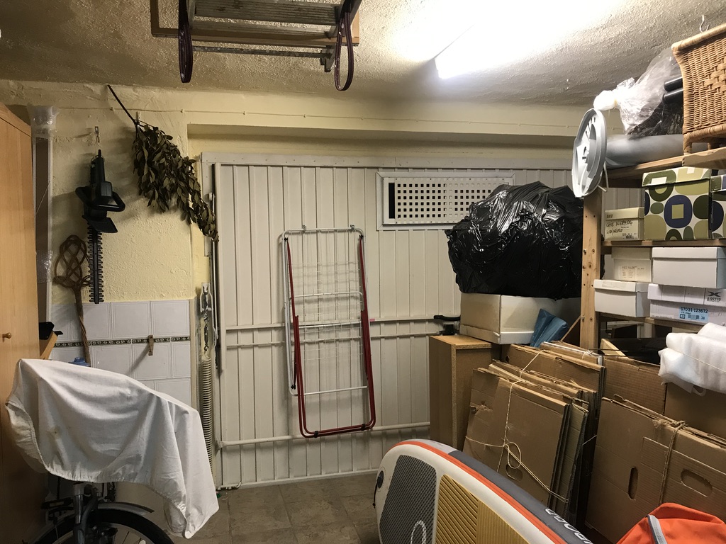 The basement consists of a large room with closets and washer/dryer, a small cellar and a large garage with wall-to-wall shelves.
