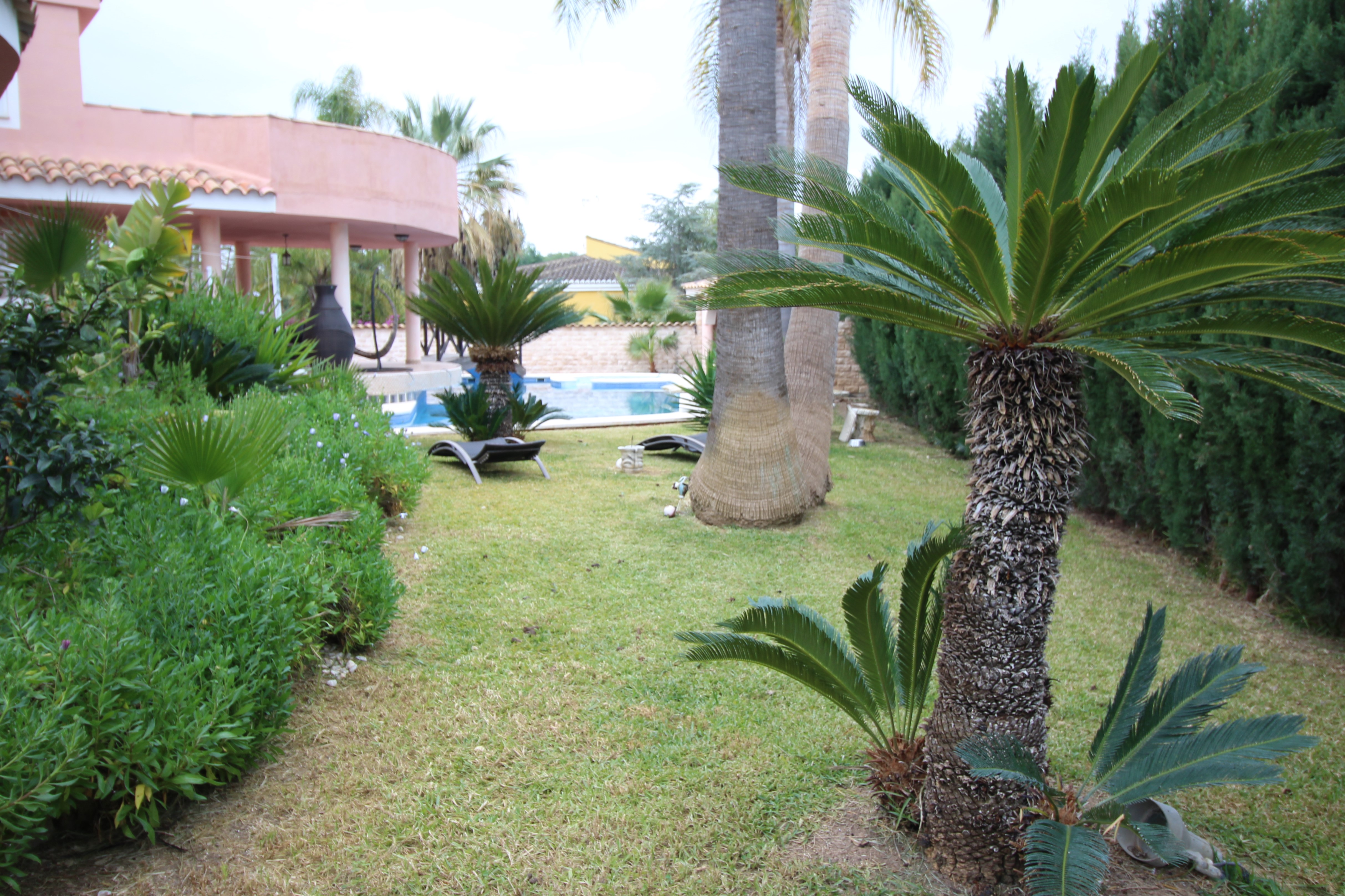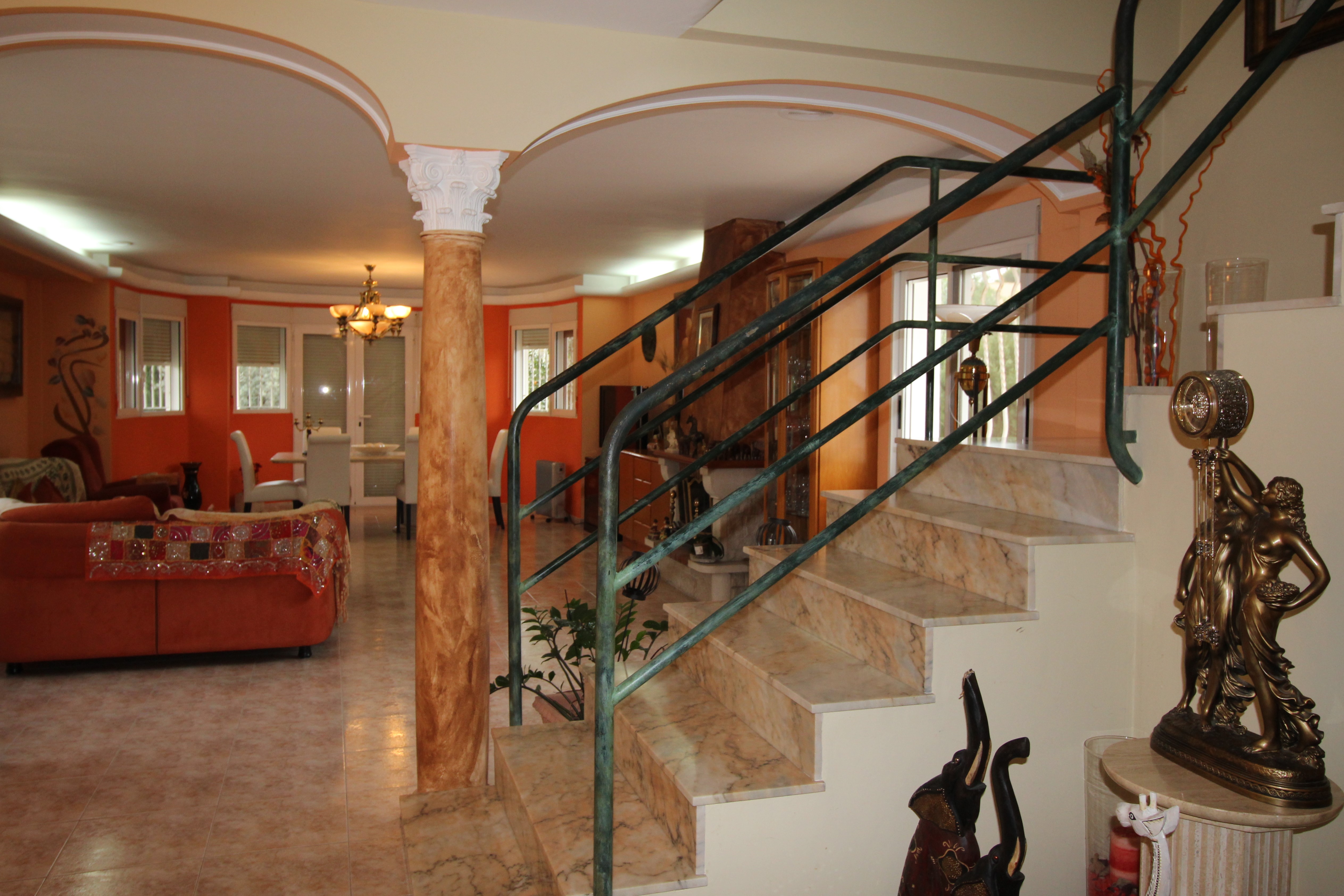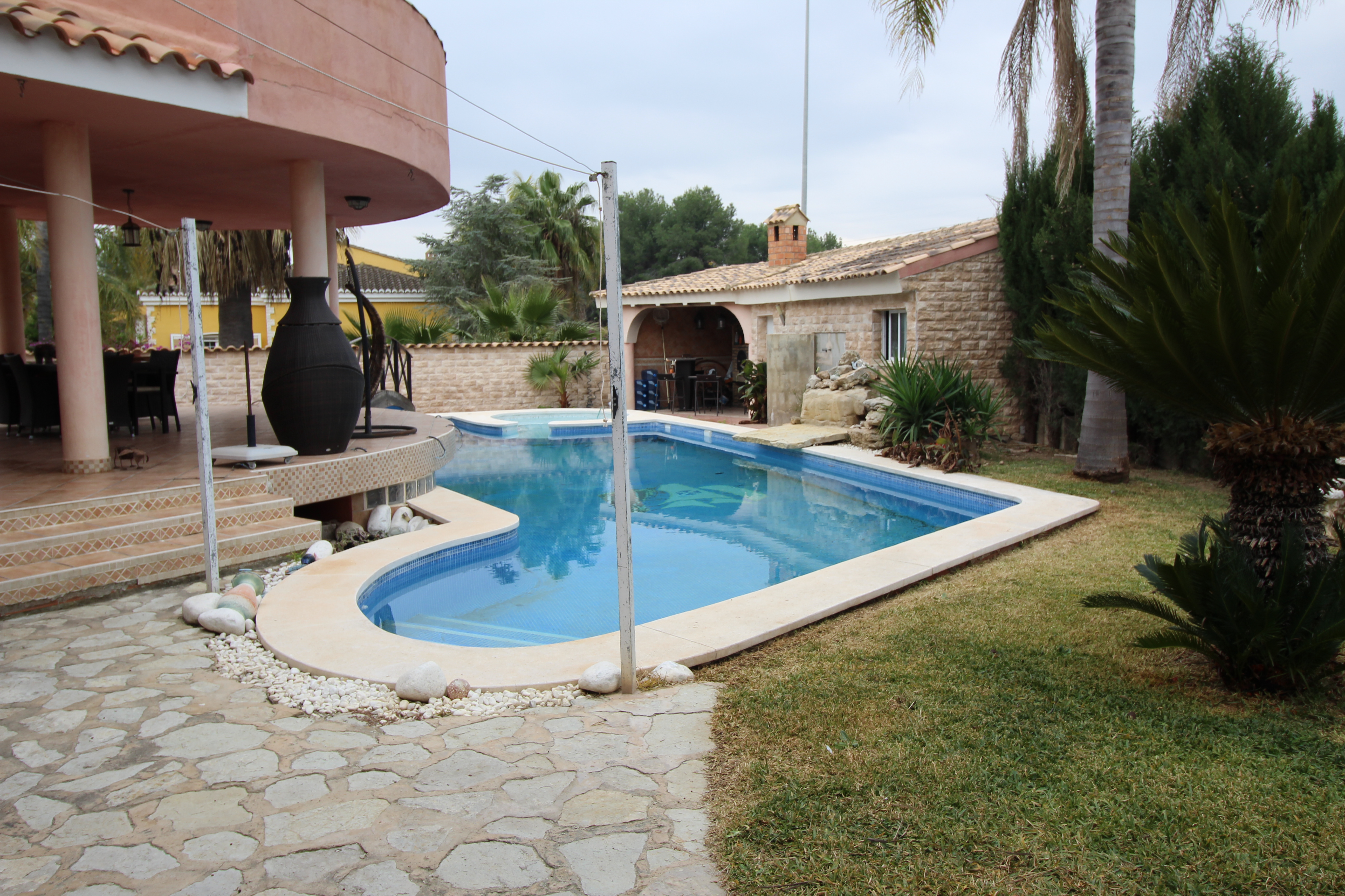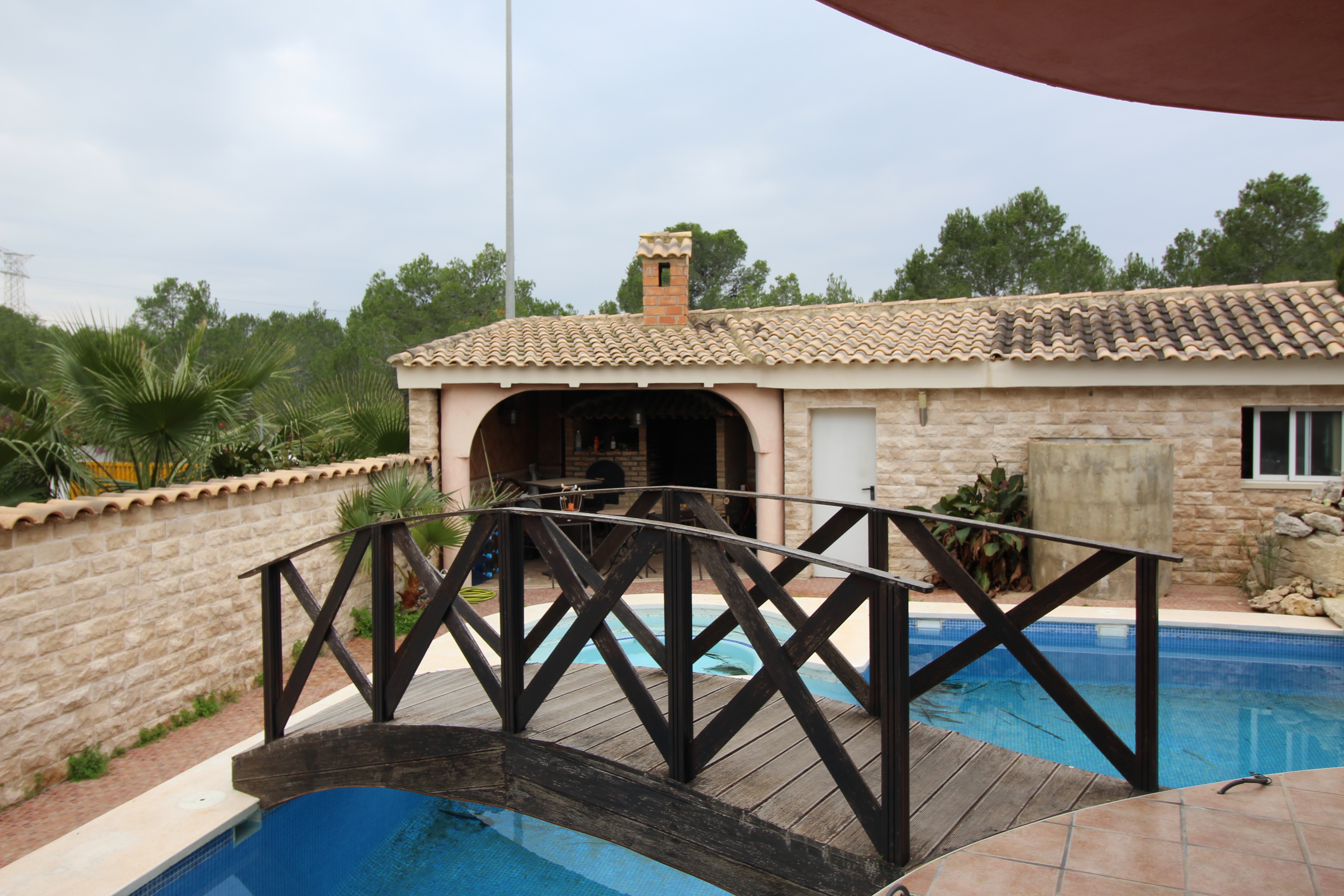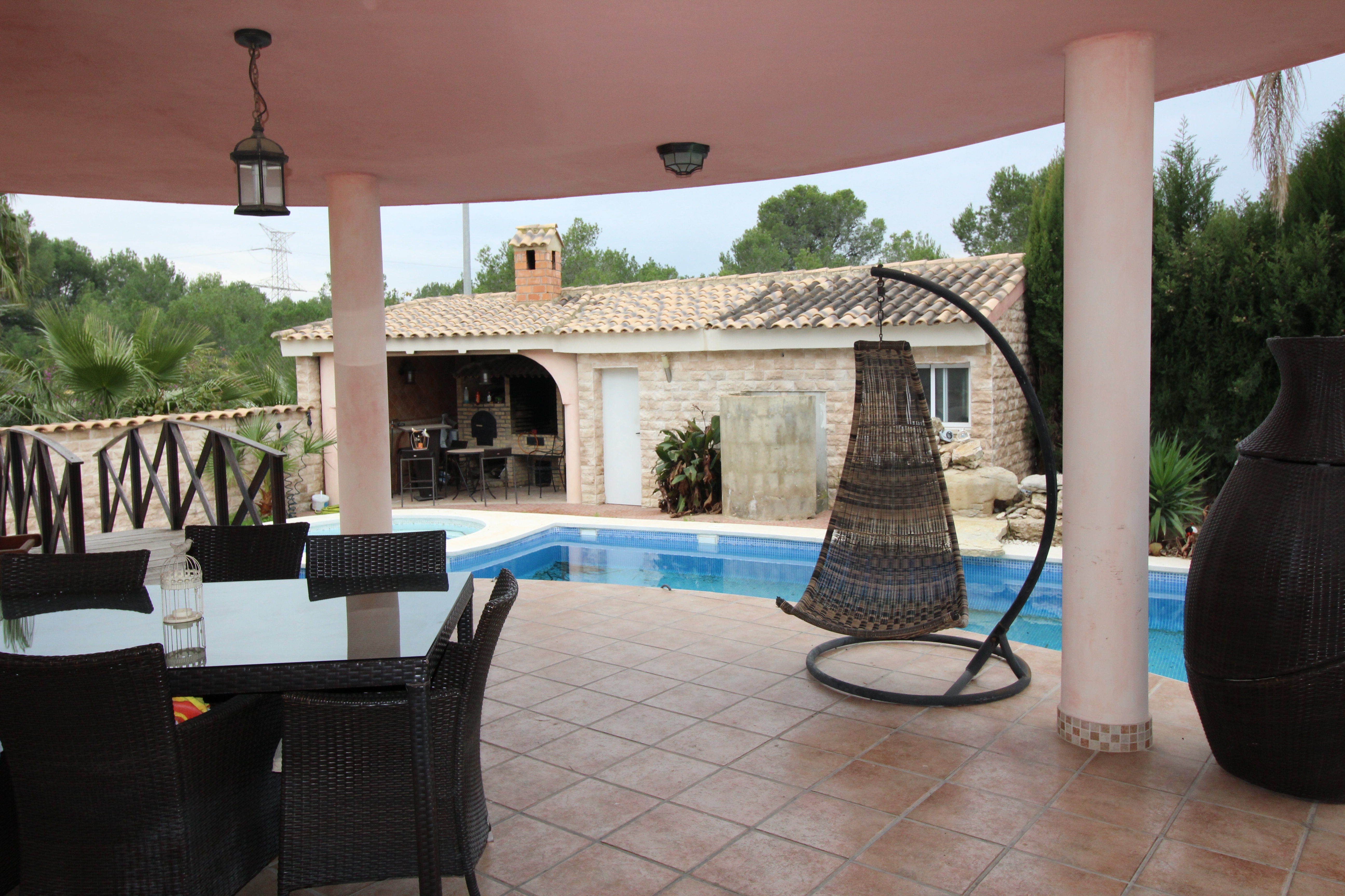 Villa in hills of San Antonio de Benageber. Nice area for the natural park that surrounds it. The garden has 900m2 with palm trees, swimming pool with jacuzzi and waterfall. Paellero, barbecue, Moorish oven. Toilet and outdoor shower.