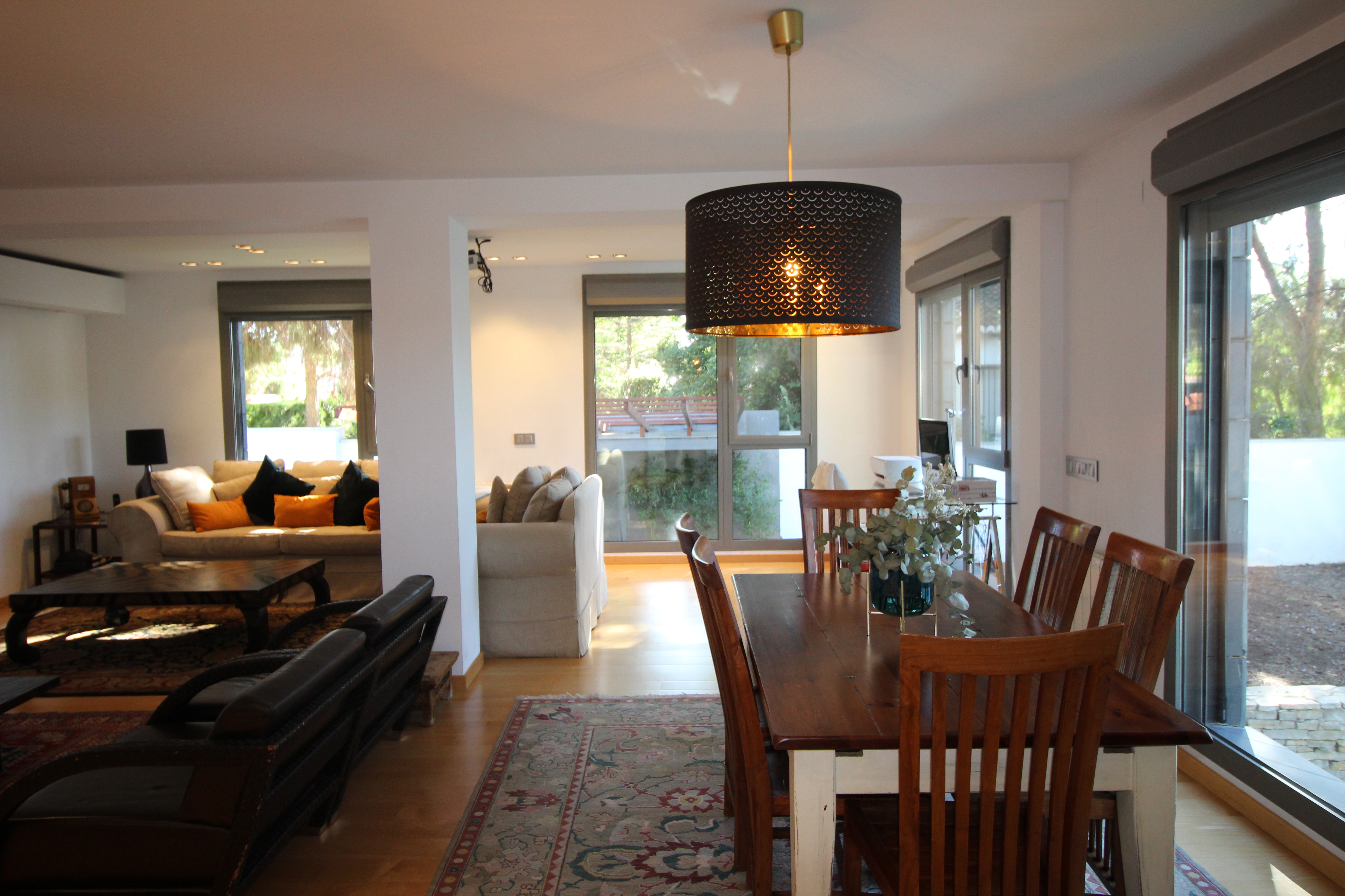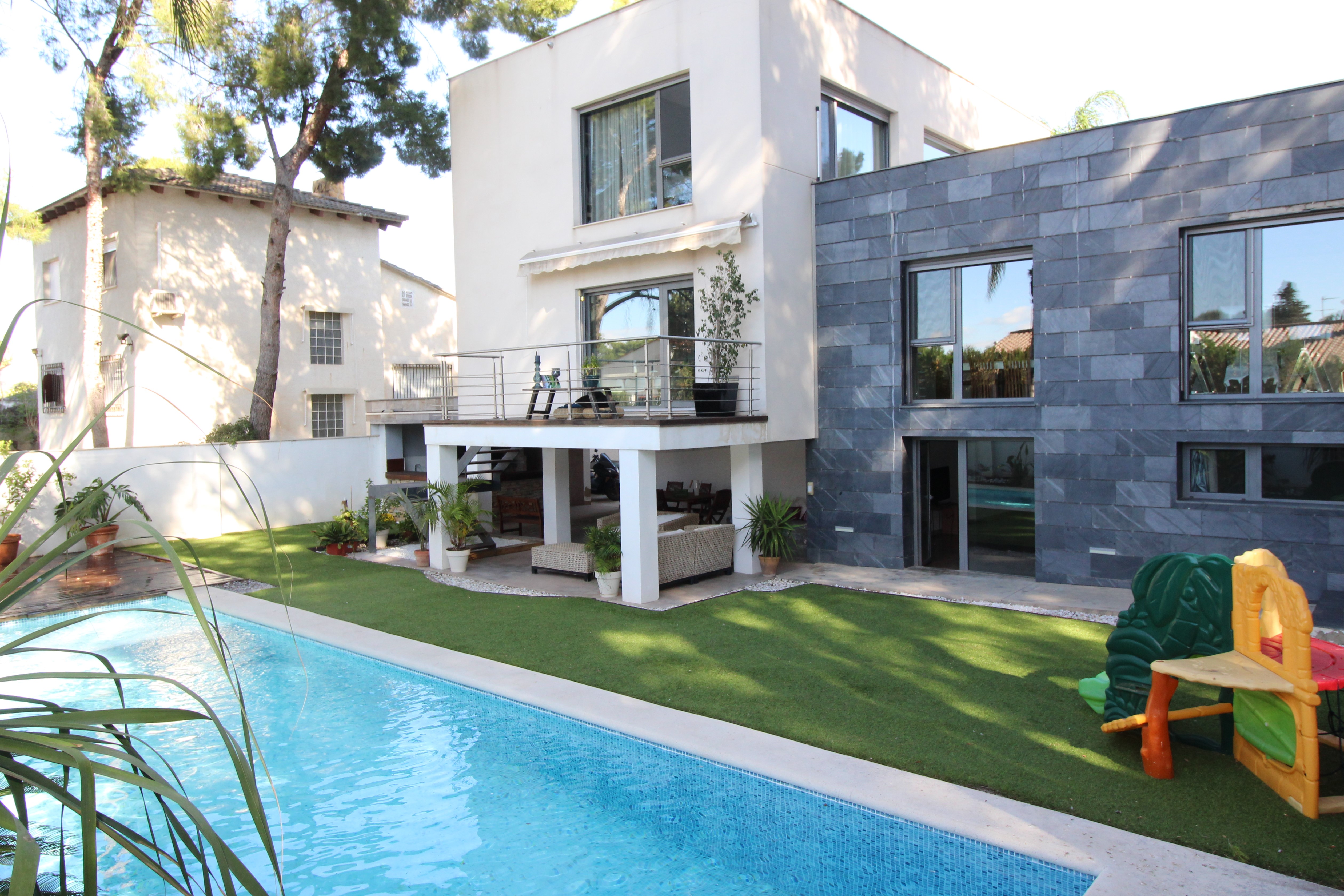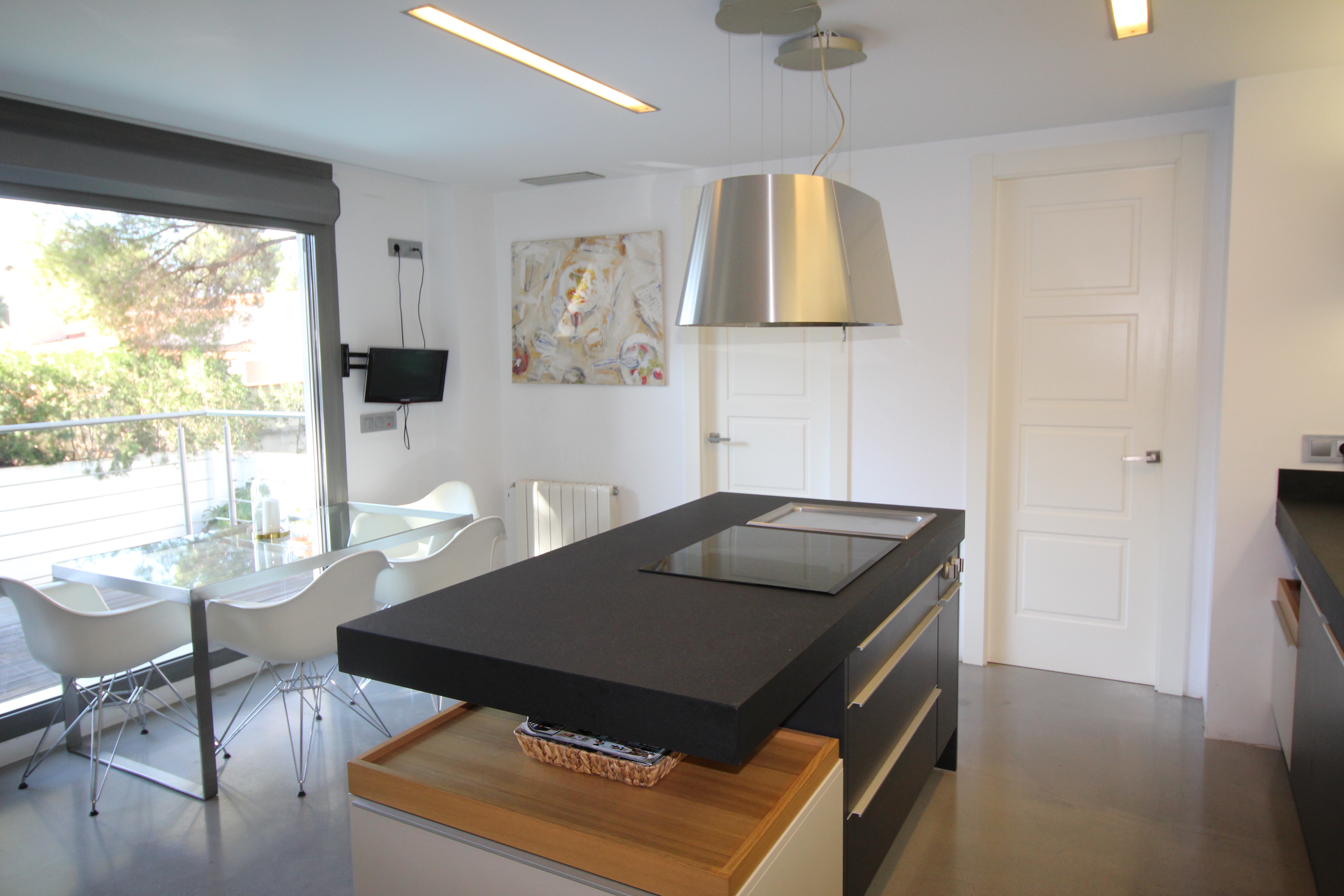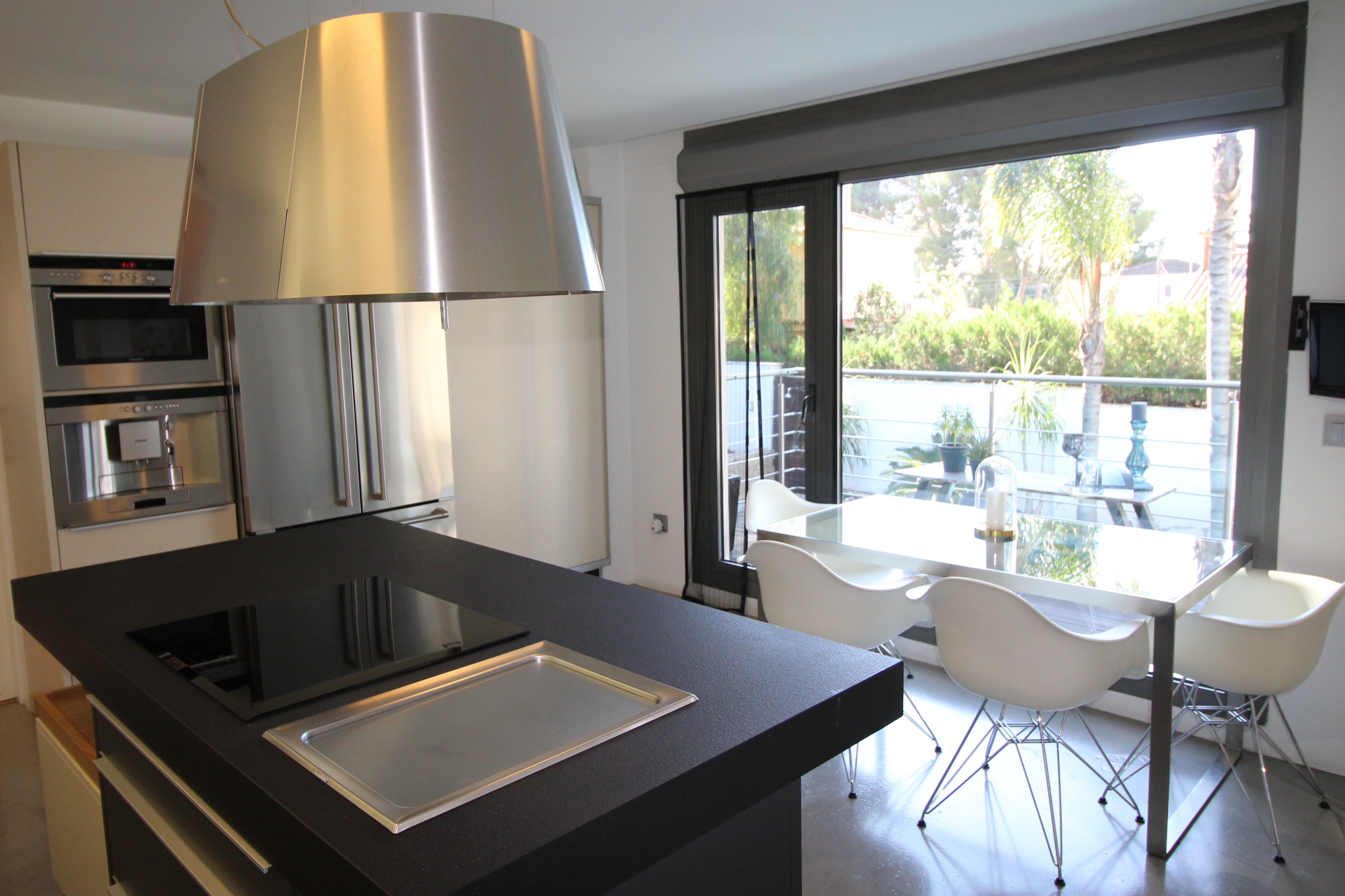 In La Eliana, this magnificent, modern-style luxury villa packed with the latest technology. Lovely bright and spacious. Designer kitchen of the brand Poggenpohl with the highest quality in technology, design and functionality. Invani Philip Starck toilets with a great combination of design and functionality. Electric safety blinds. Double-glazed windows. A villa with many built-in wardrobes. Air conditioning and central gas heating. The floor of the house is micro-cement in the kitchen, parquet made of natural wood inside the house and on the outdoor terraces of teak wood.