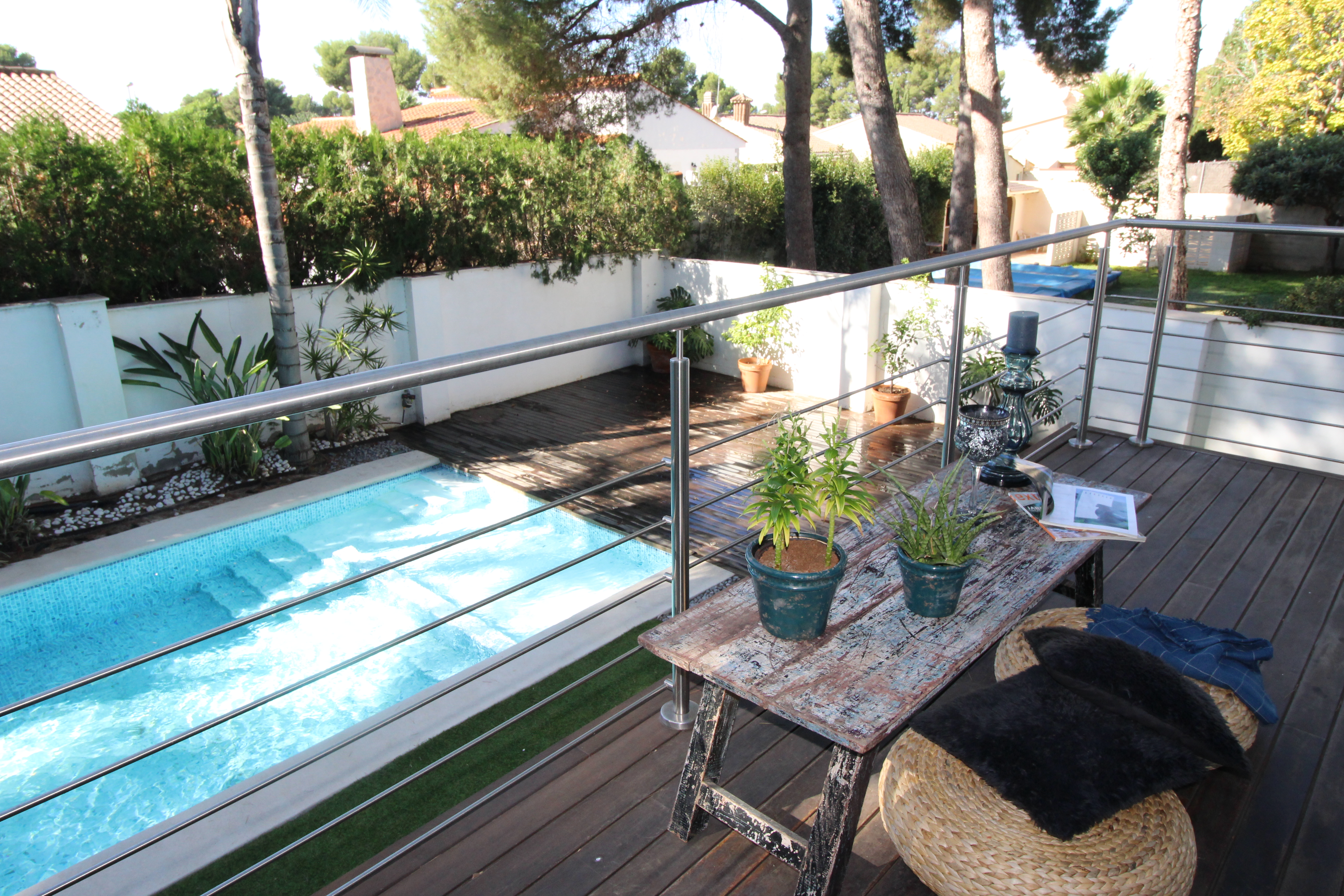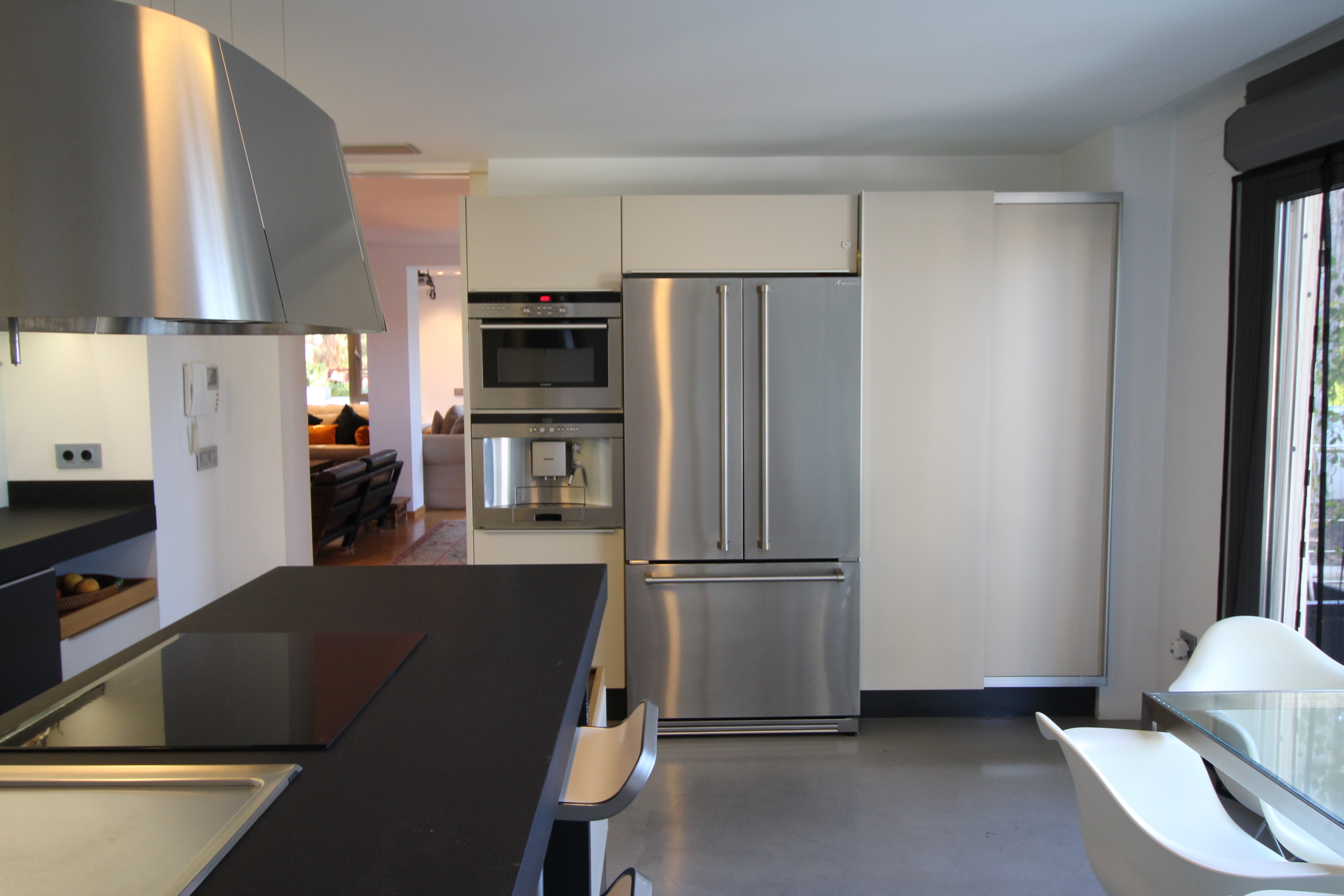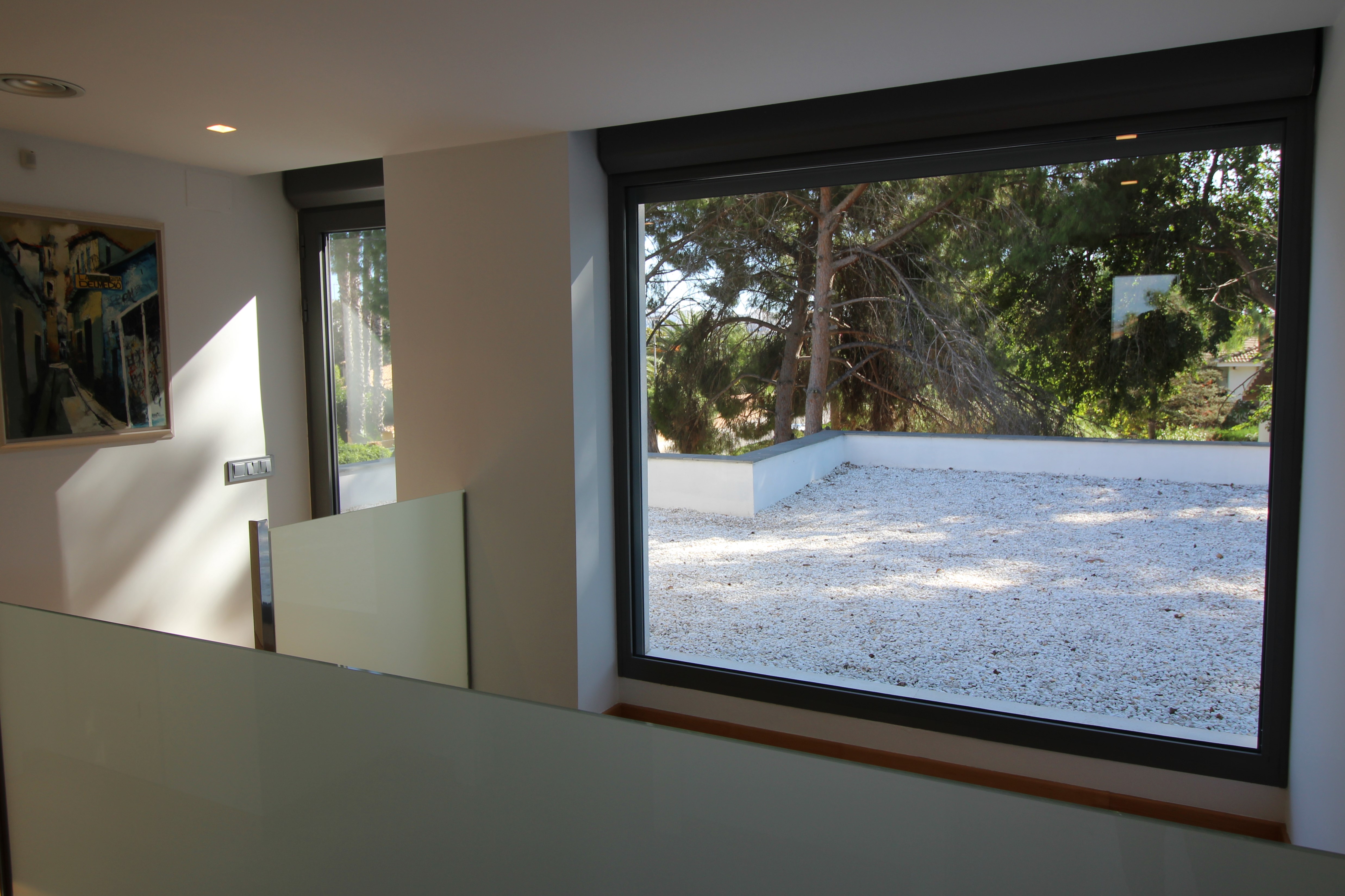 In La Eliana, this magnificent, modern-style luxury villa packed with the latest technology. Lovely bright and spacious. Designer kitchen of the brand Poggenpohl with the highest quality in technology, design and functionality. Invani Philip Starck toilets with a great combination of design and functionality. Electric safety blinds. Double-glazed windows. A villa with many built-in wardrobes. Air conditioning and central gas heating. The floor of the house is micro-cement in the kitchen, parquet made of natural wood inside the house and on the outdoor terraces of teak wood.