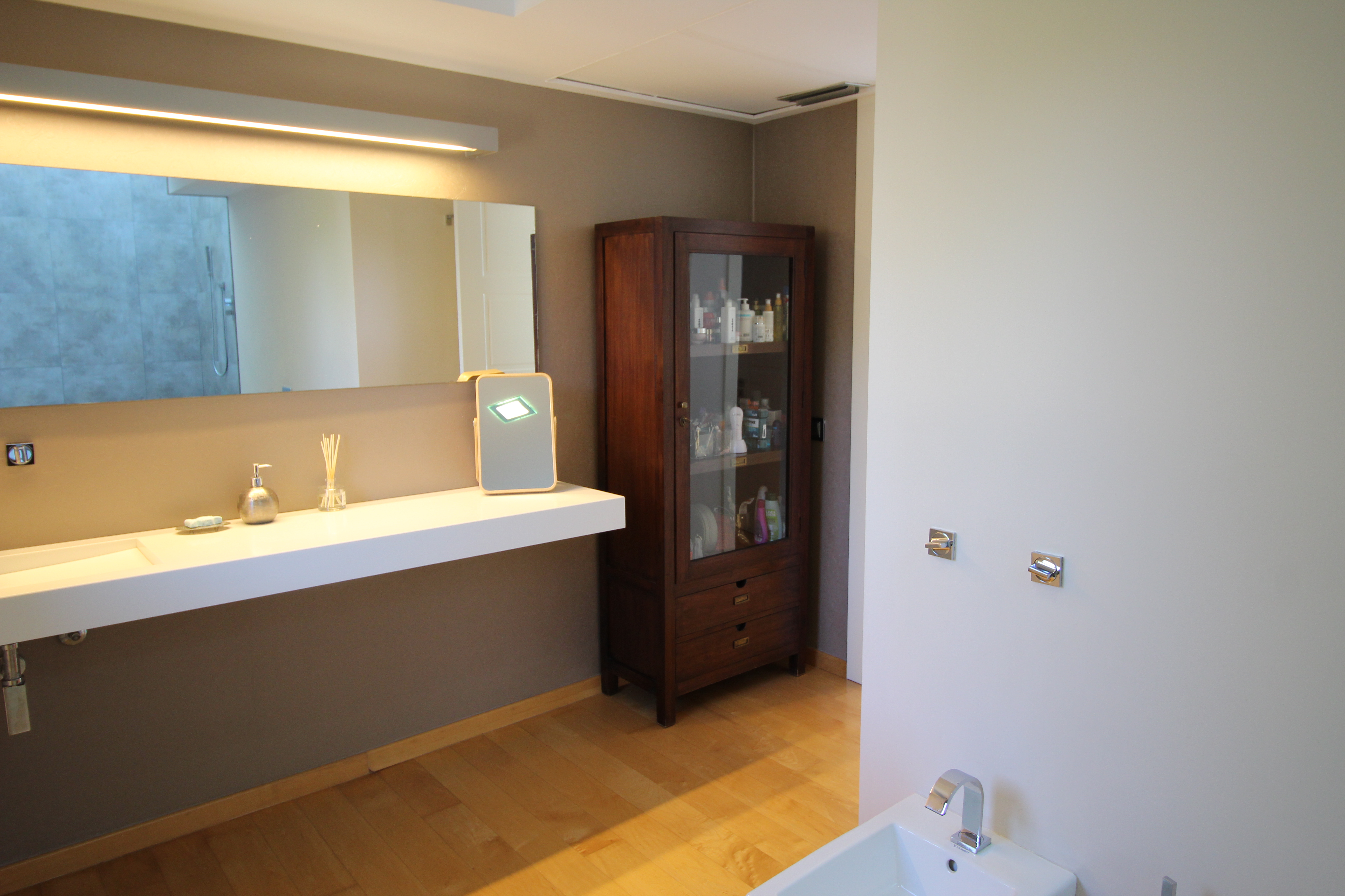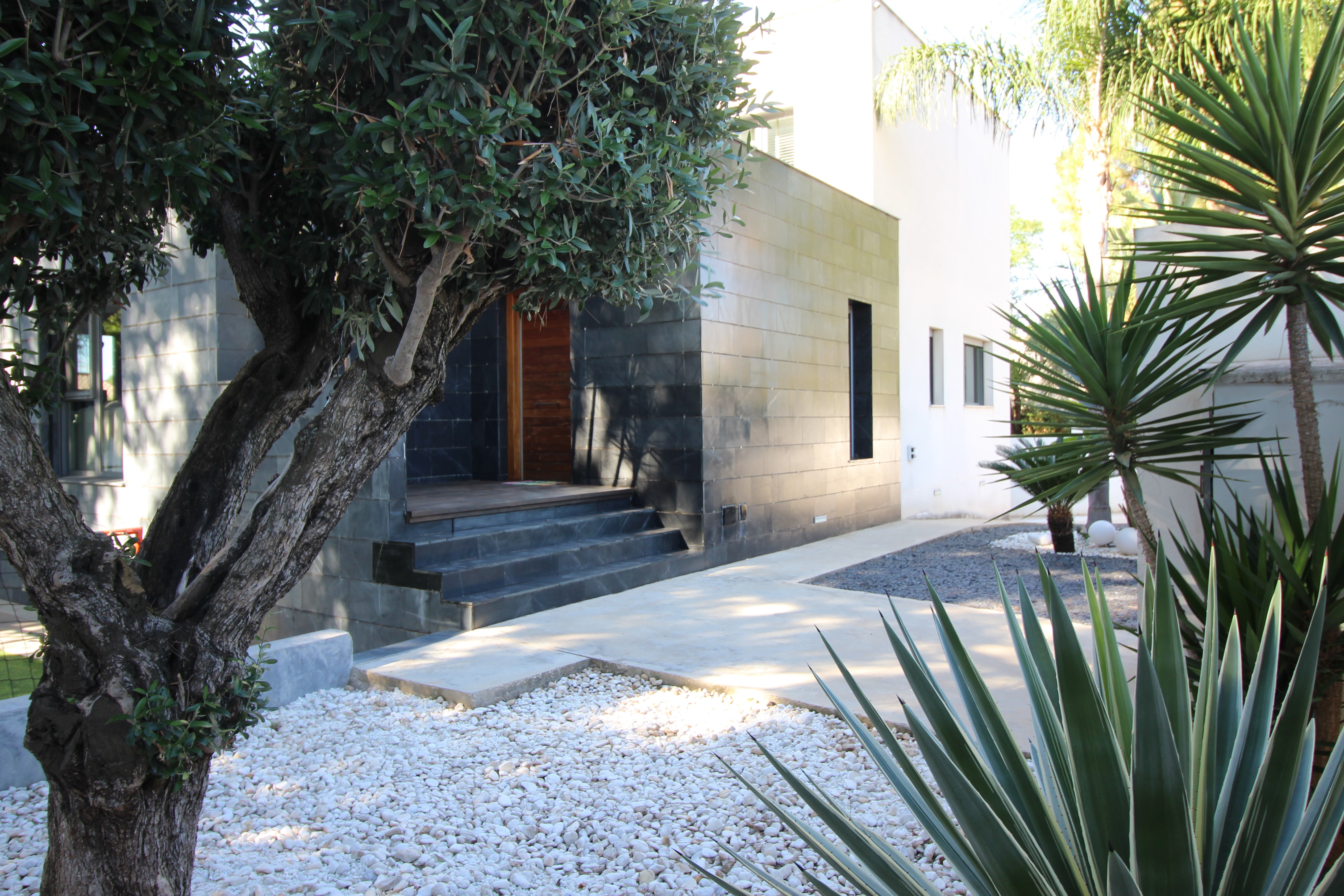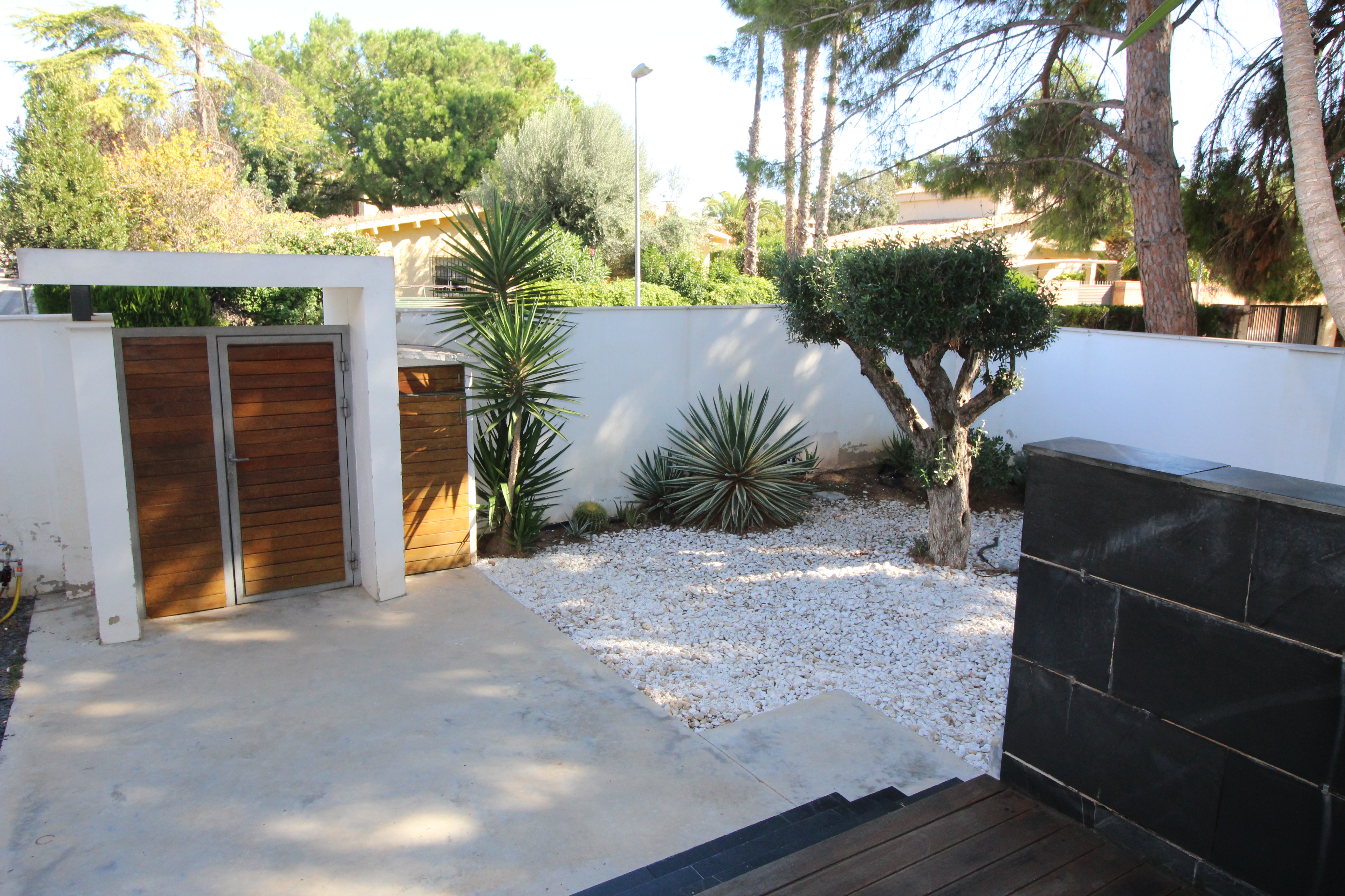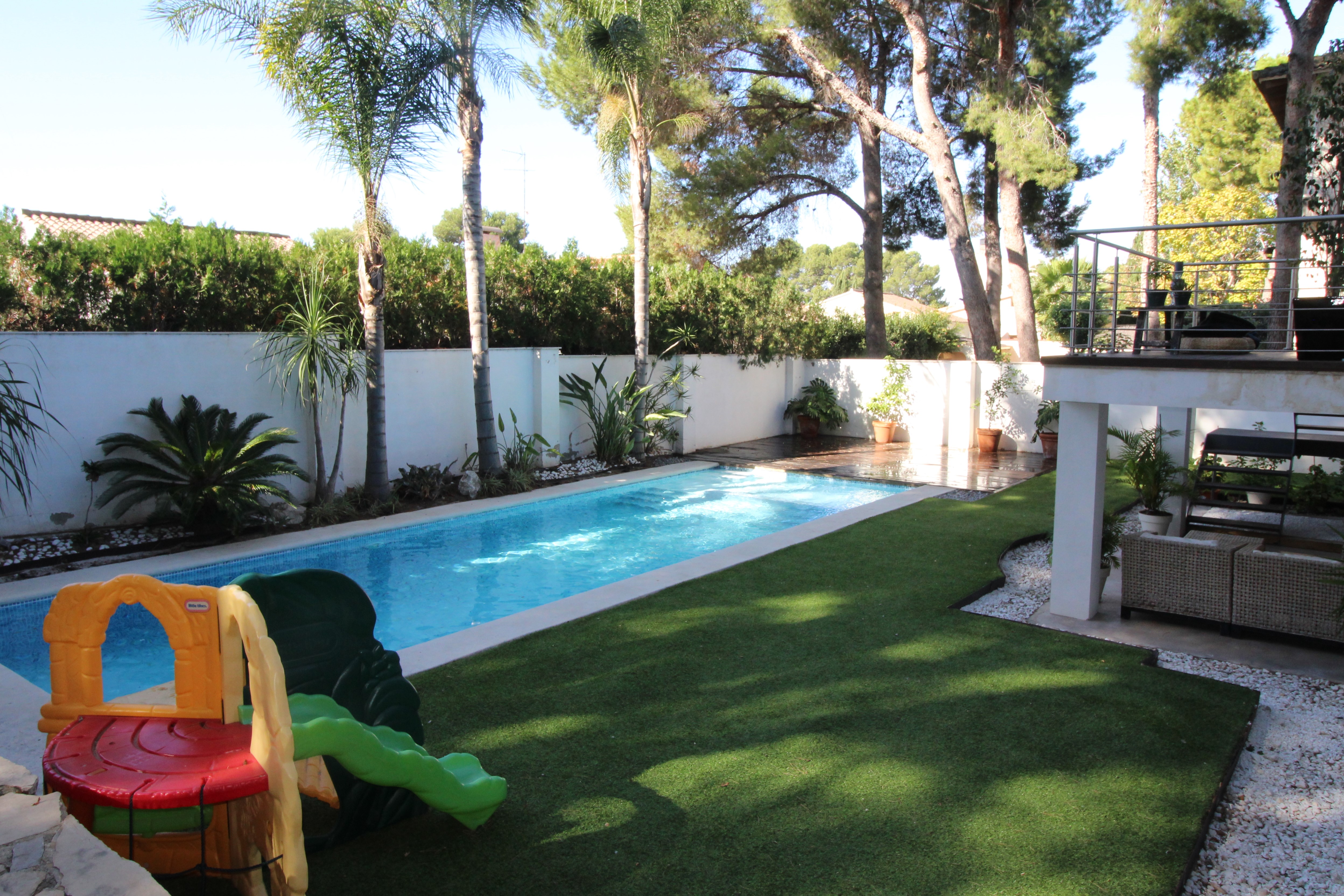 In La Eliana, this magnificent, modern-style luxury villa packed with the latest technology. Lovely bright and spacious. Designer kitchen of the brand Poggenpohl with the highest quality in technology, design and functionality. Invani Philip Starck toilets with a great combination of design and functionality. Electric safety blinds. Double-glazed windows. A villa with many built-in wardrobes. Air conditioning and central gas heating. The floor of the house is micro-cement in the kitchen, parquet made of natural wood inside the house and on the outdoor terraces of teak wood.