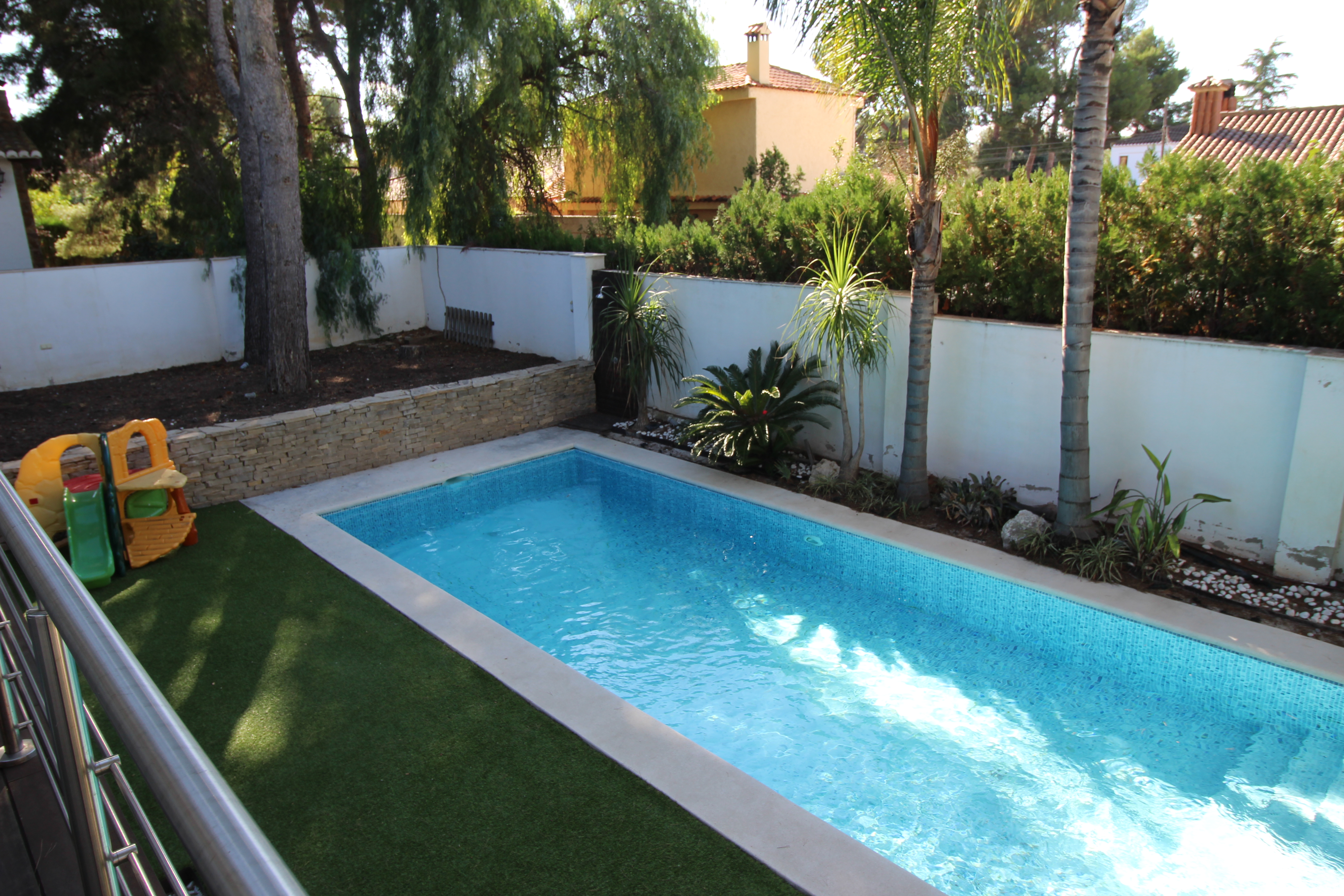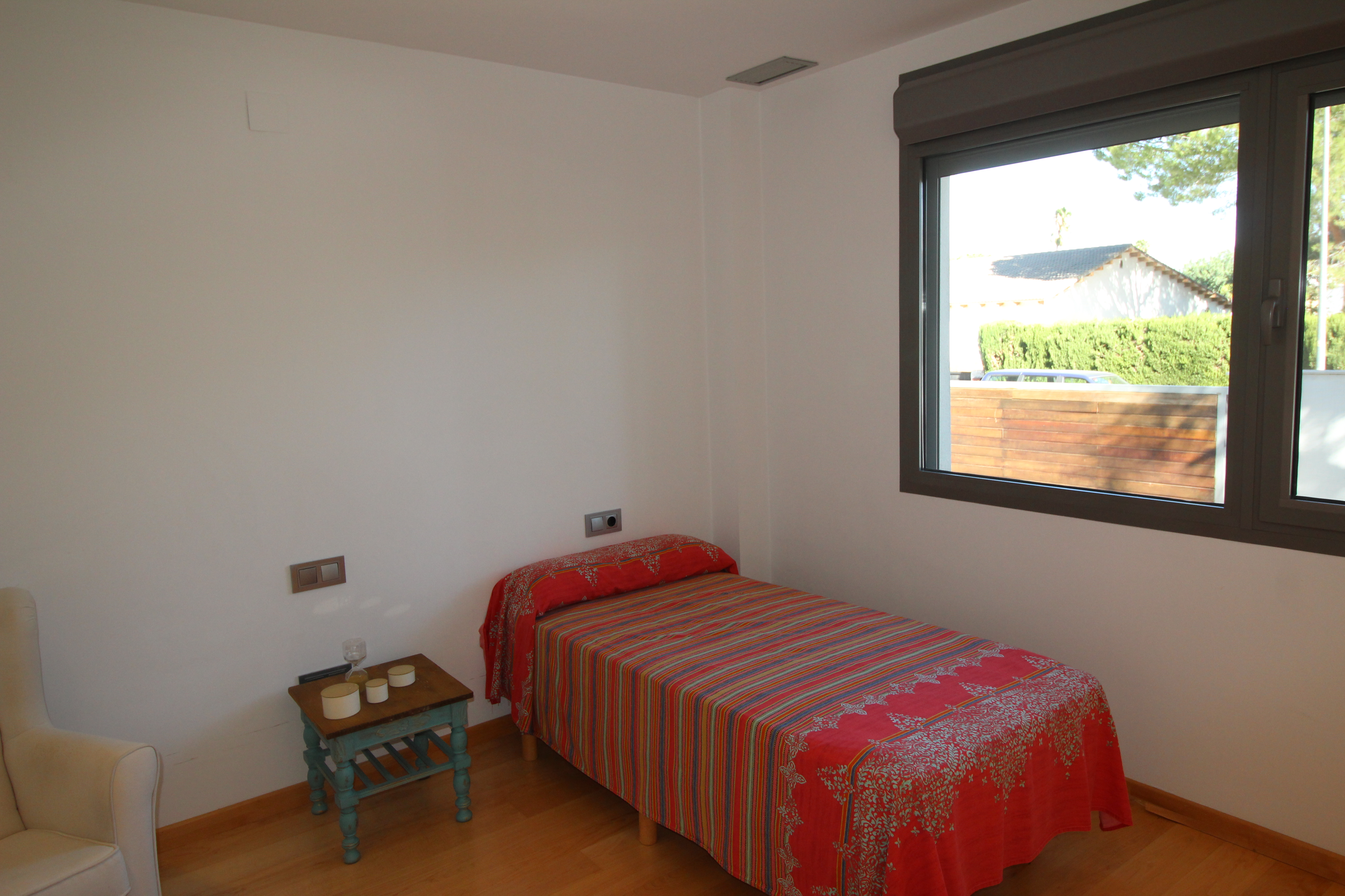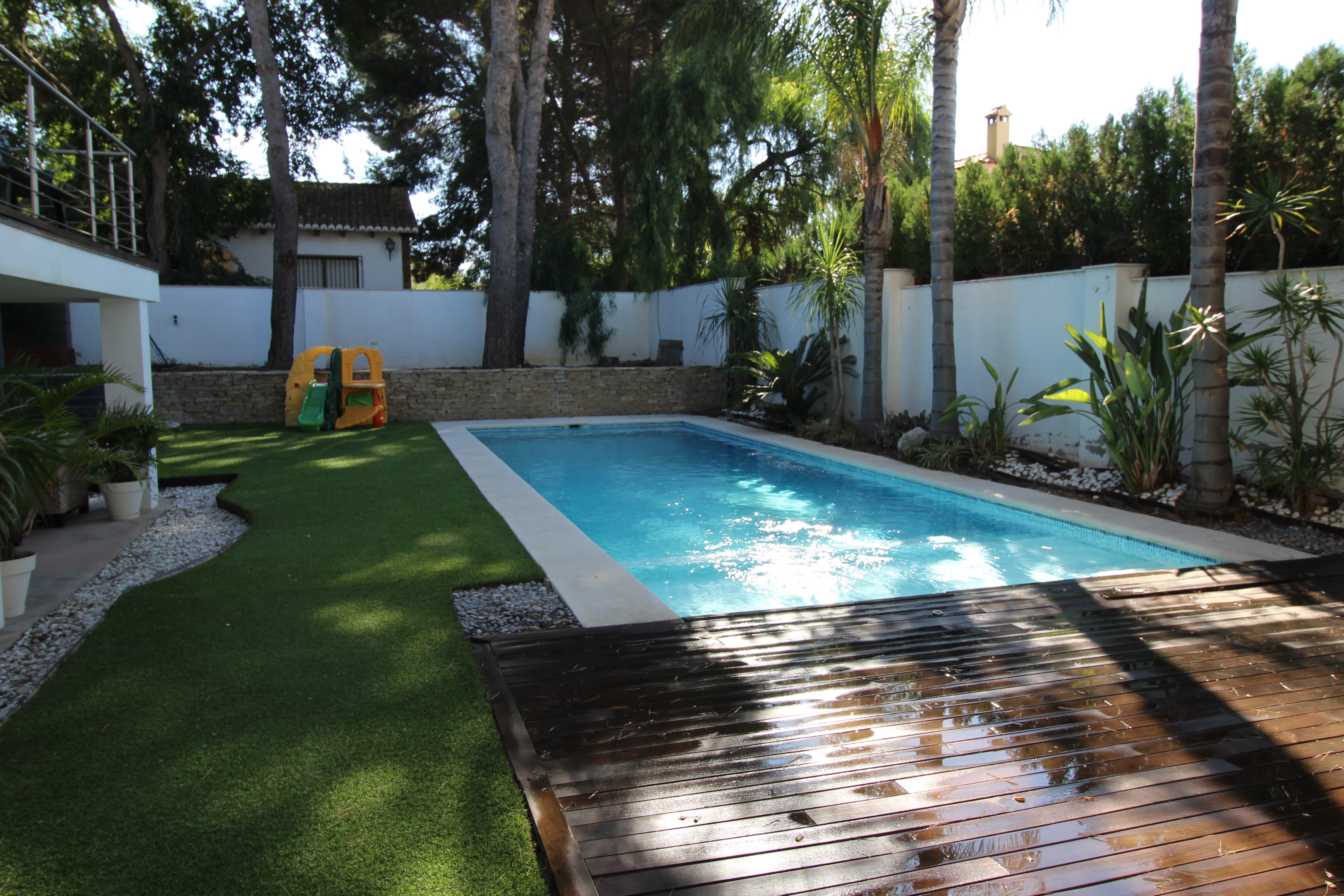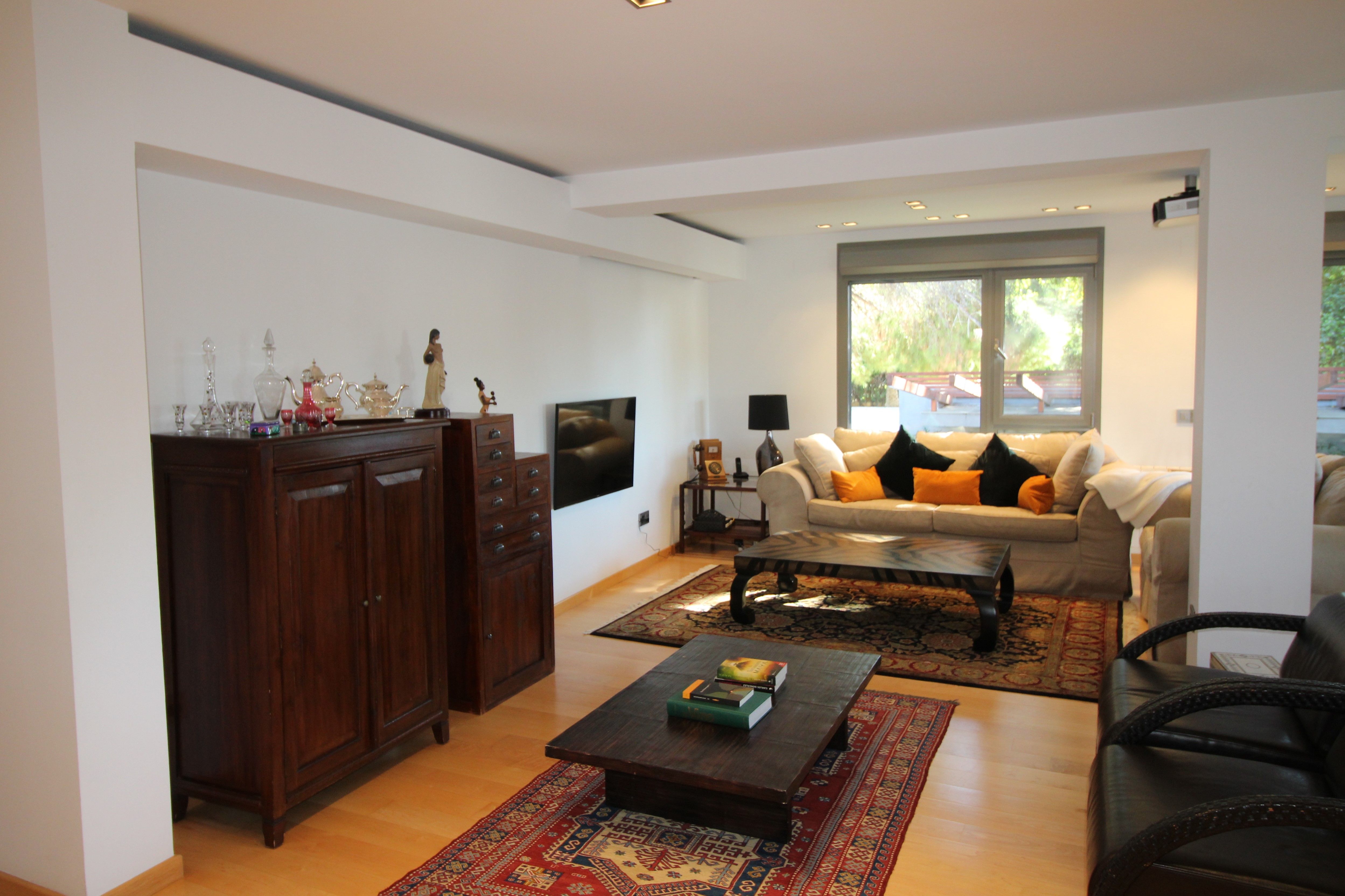 The plot has an area of 860 m2 and the villa itself is of 380 m2. It consists of three levels. On the ground floor we find the living room with views of the garden and pool, the kitchen with access to the terrace and with garden views, two spacious bedrooms and a bathroom.