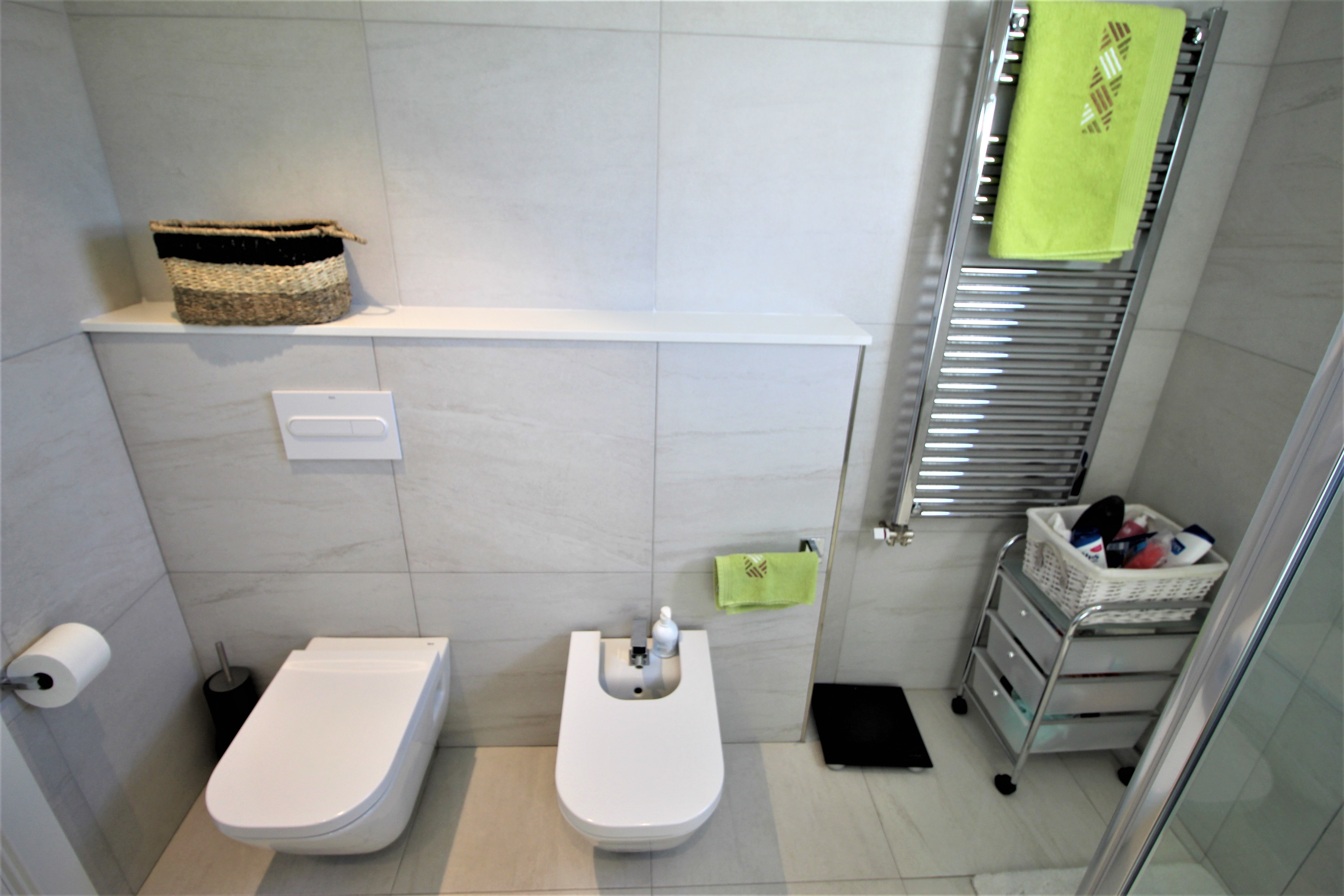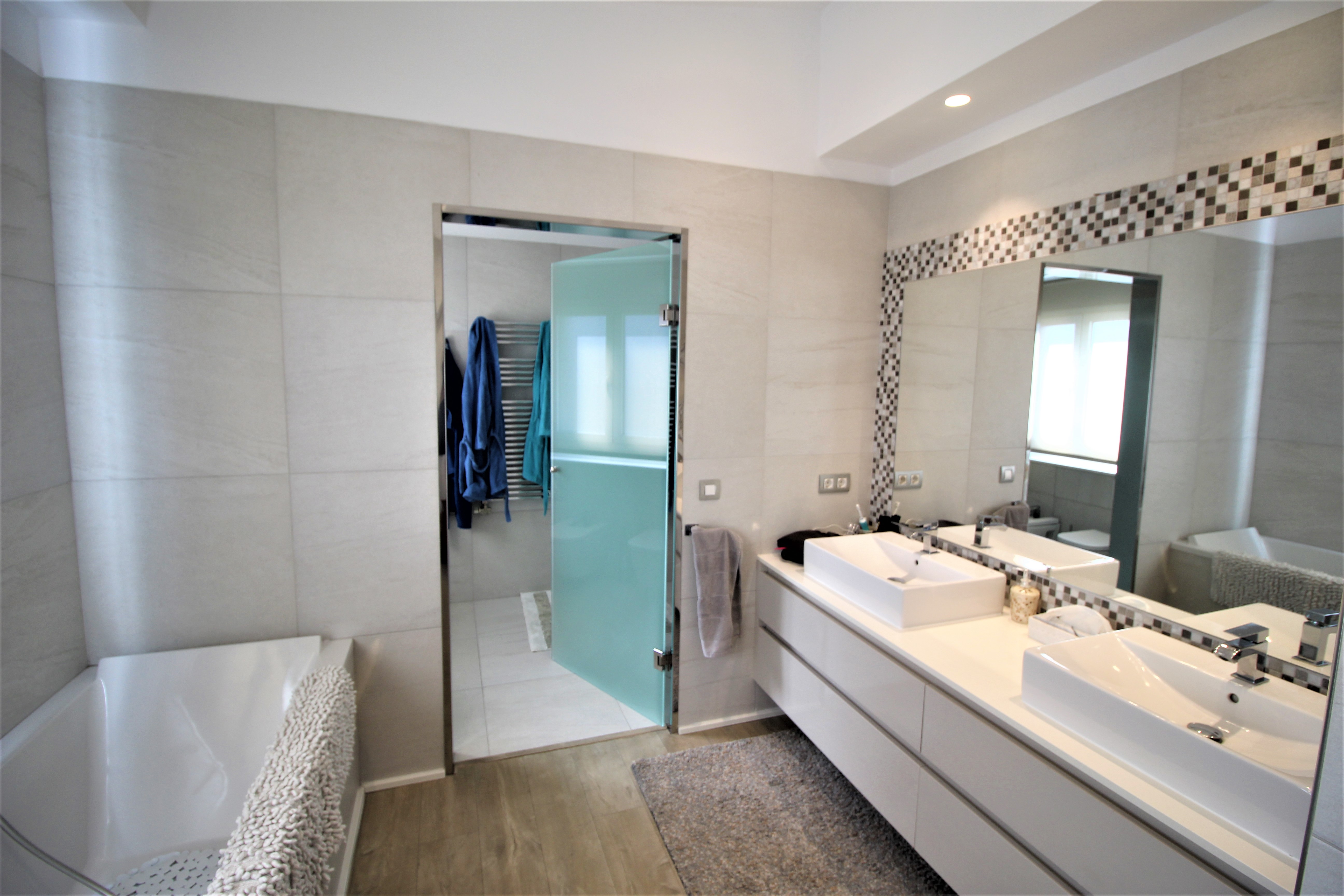 When entering the house there is a good and spacious hallway leading up to the first floor or into the living room and kitchen. The 1st floor is equipped with a total of 3 spacious rooms a bath and toilet as well as a master bedroom with its own bathroom and walk-in dressing room. If we go down to the ground floor, we find a large spacious kitchen and a living room which has direct access to the large terrace which is private and secluded with views of the garden and pool.