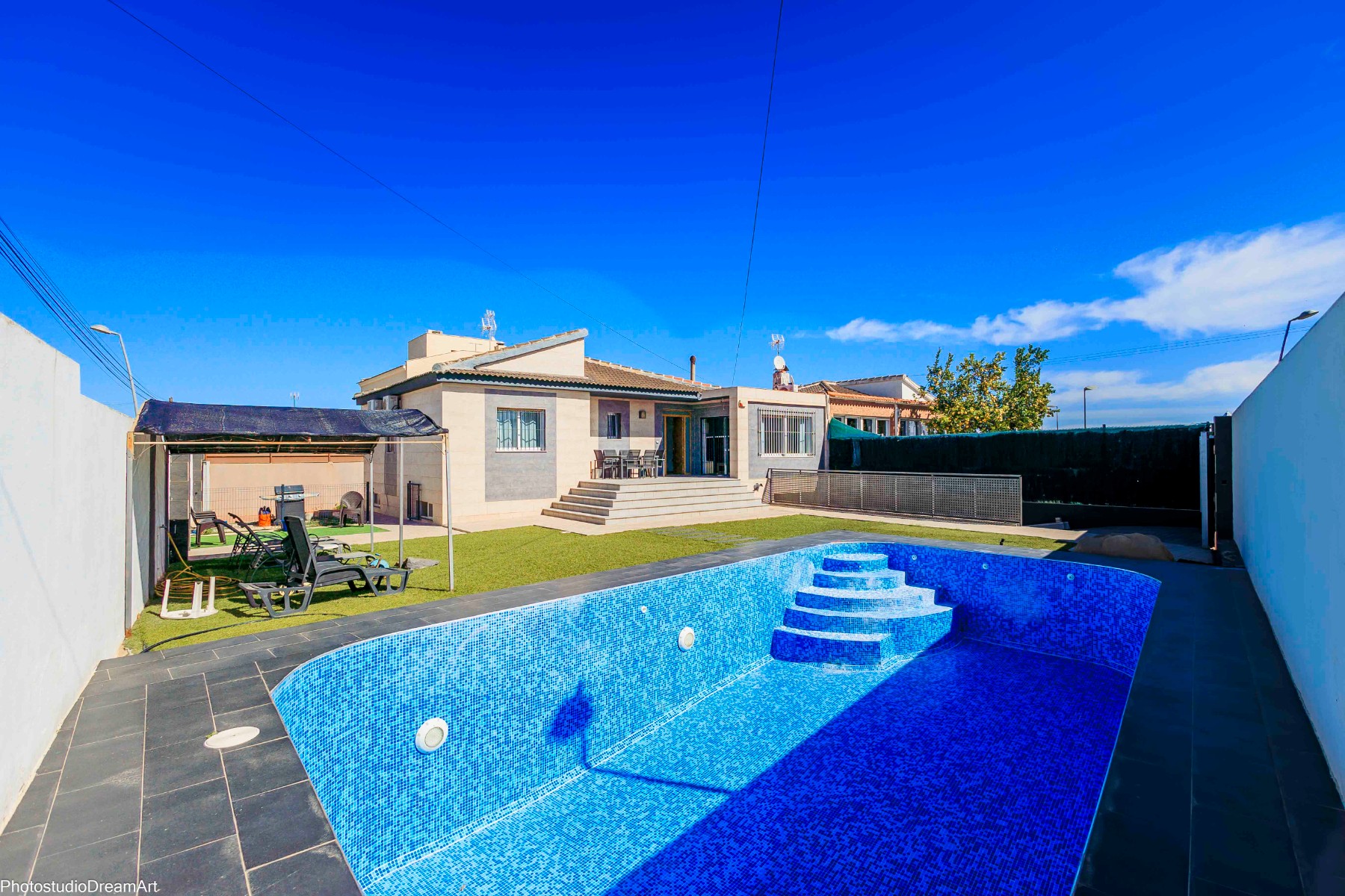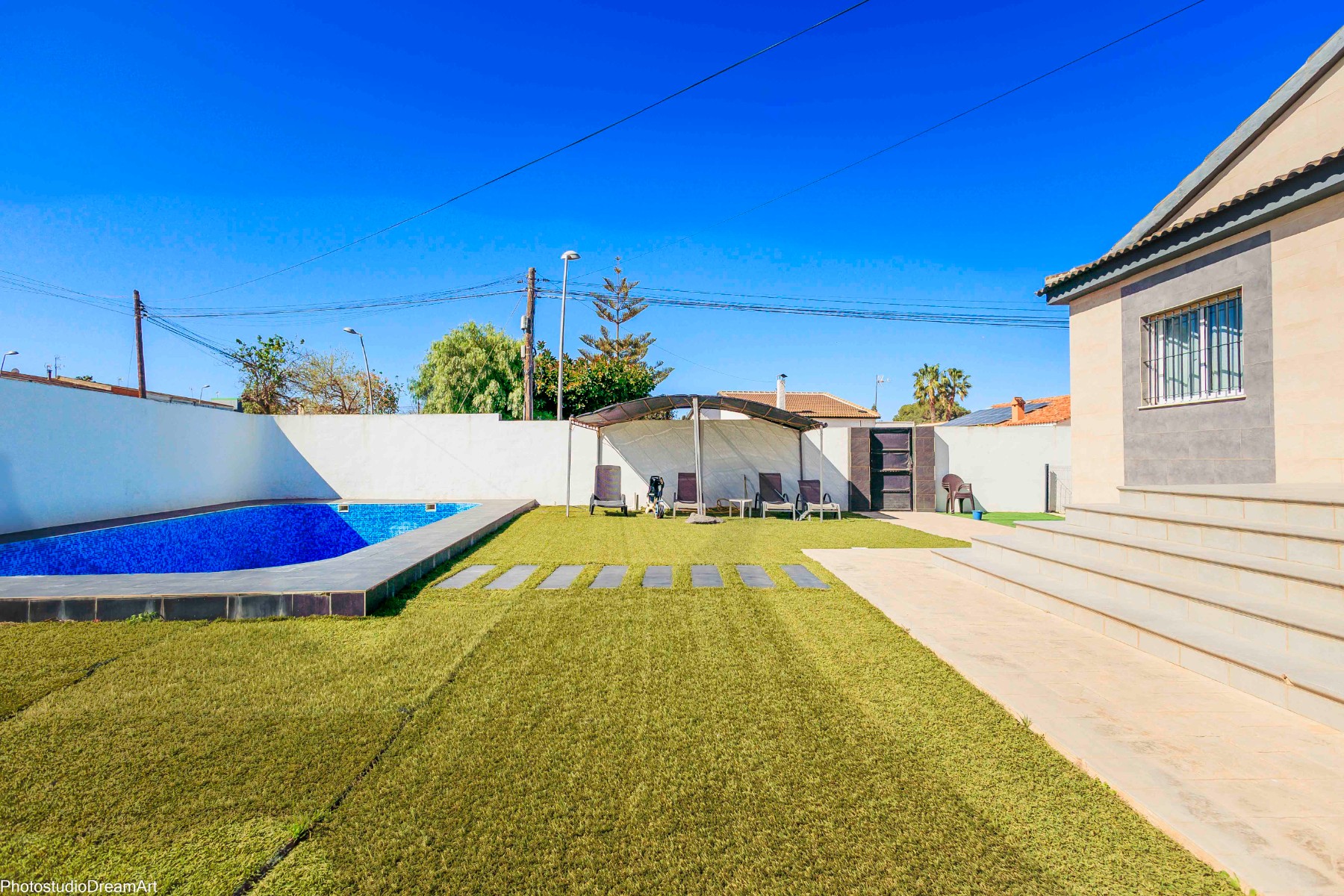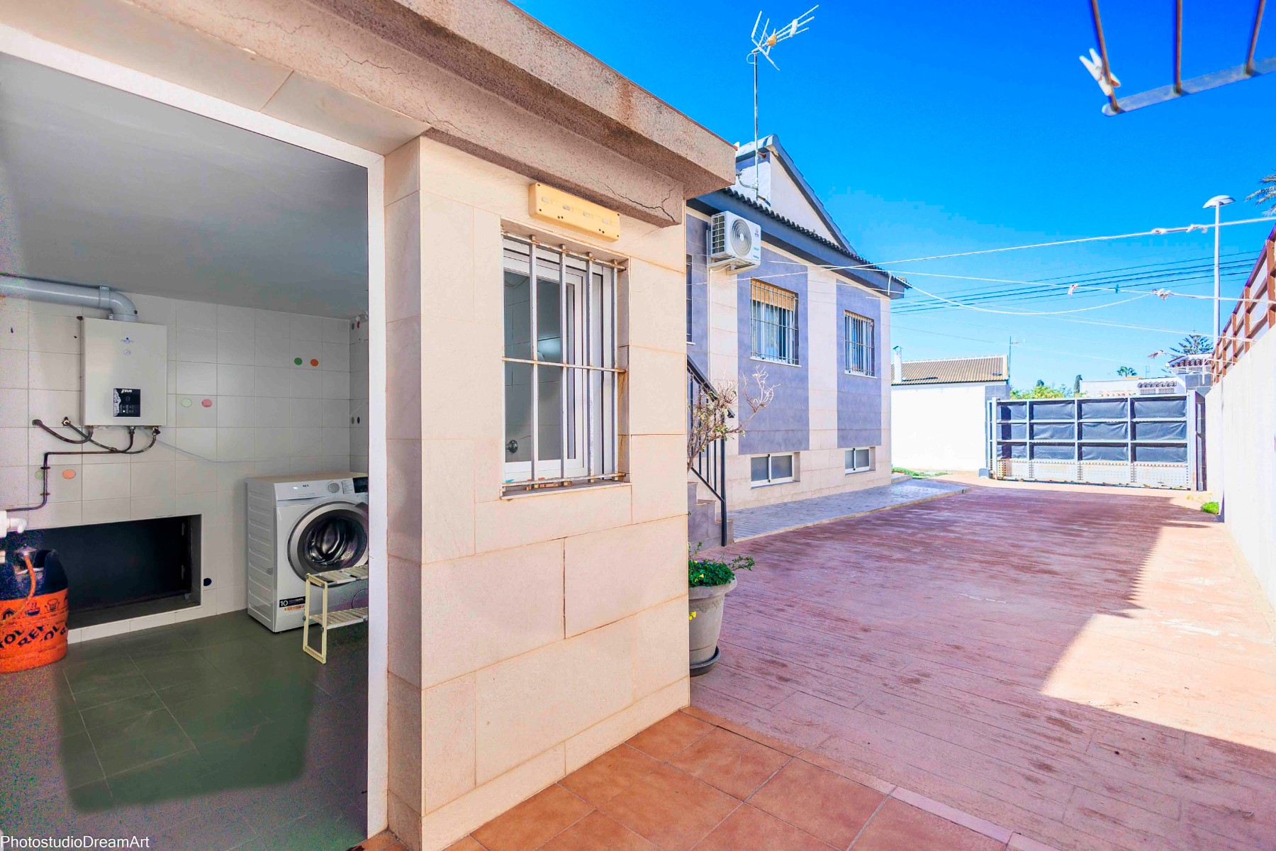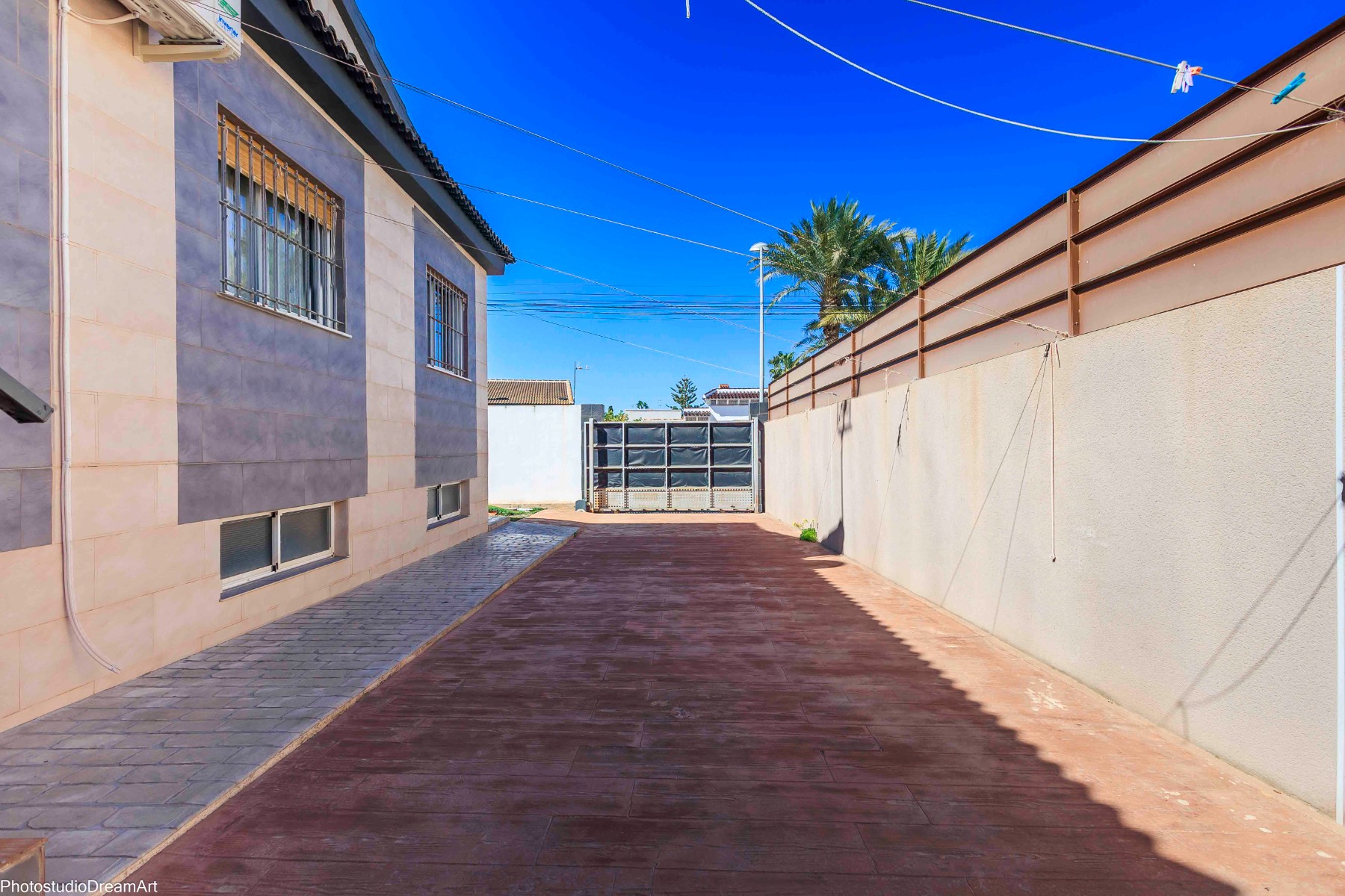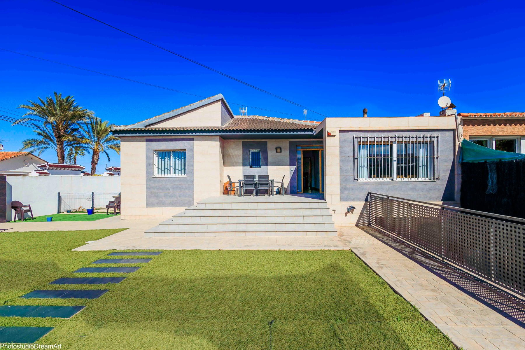 Beautiful villa for sale on Calle Ukraine, the house has 3 bedrooms, 2 full bathrooms, dressing room, separate kitchen, living room with fireplace, private pool, garden and a 100 square meter garage. It has two entrances, one of them with a motorized door with space for several vehicles. The location is fantastic, close to supermarkets, restaurants, 5 minutes from Torrevieja. Come visit it!