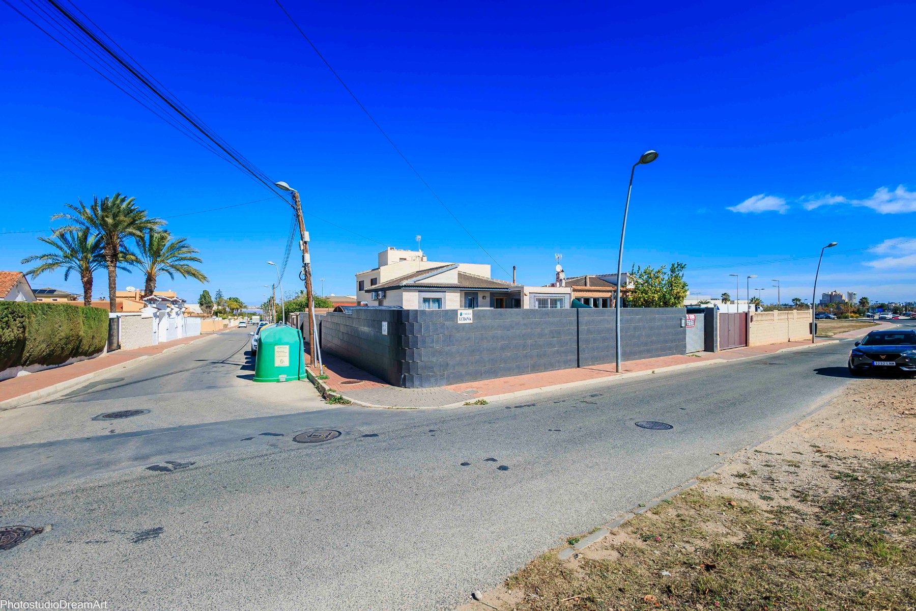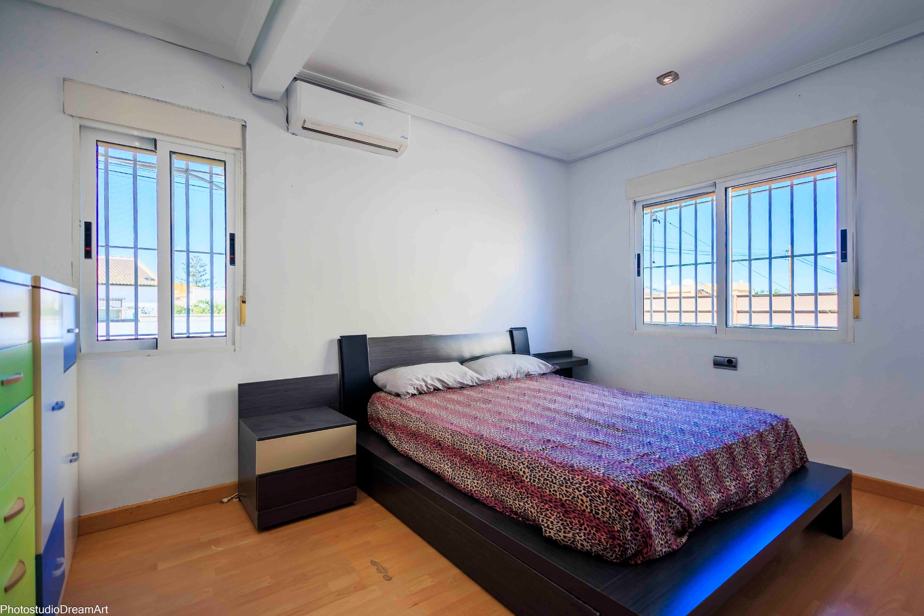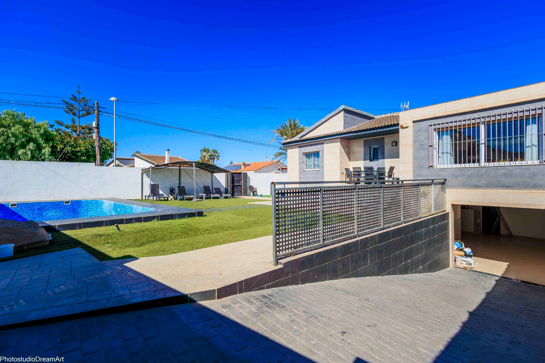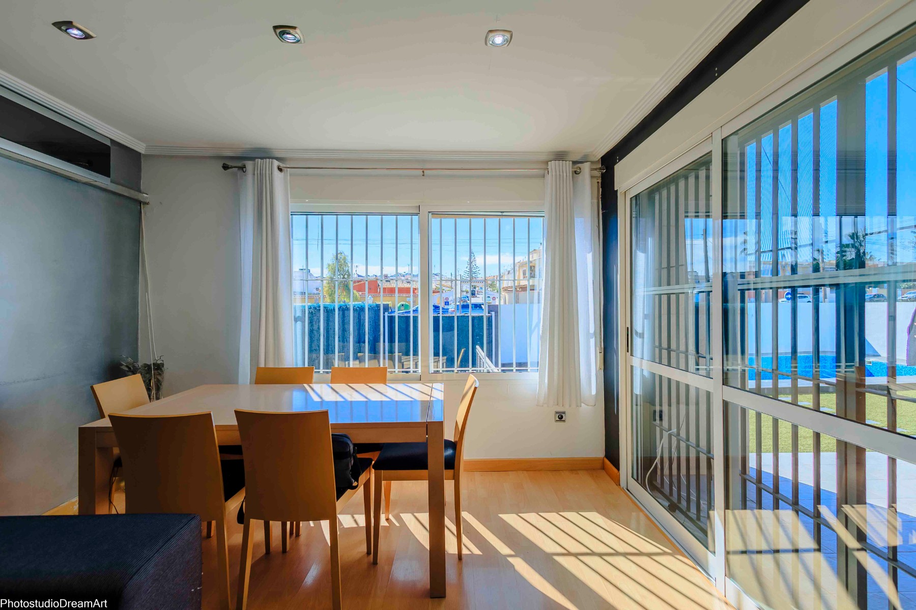 Beautiful villa for sale on Calle Ukraine, the house has 3 bedrooms, 2 full bathrooms, dressing room, separate kitchen, living room with fireplace, private pool, garden and a 100 square meter garage. It has two entrances, one of them with a motorized door with space for several vehicles. The location is fantastic, close to supermarkets, restaurants, 5 minutes from Torrevieja. Come visit it!
