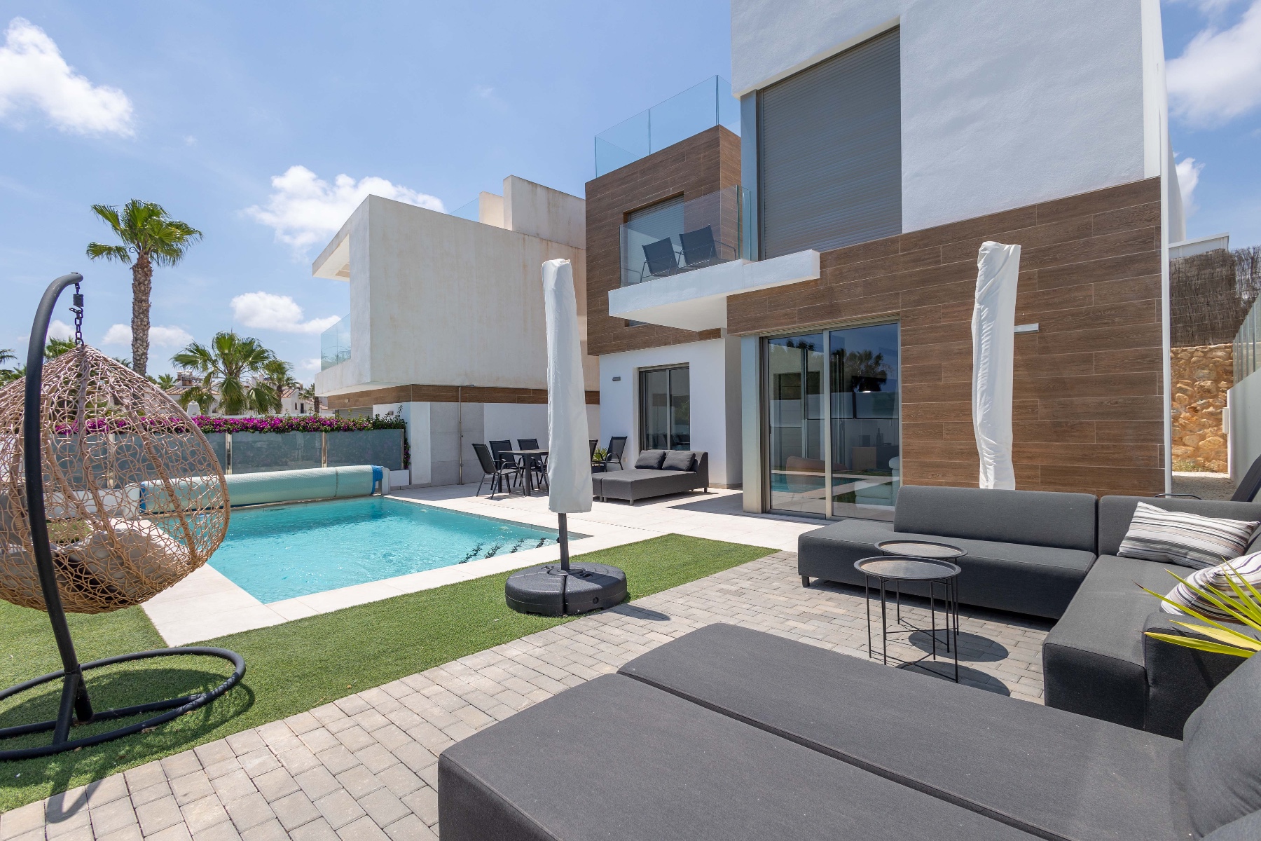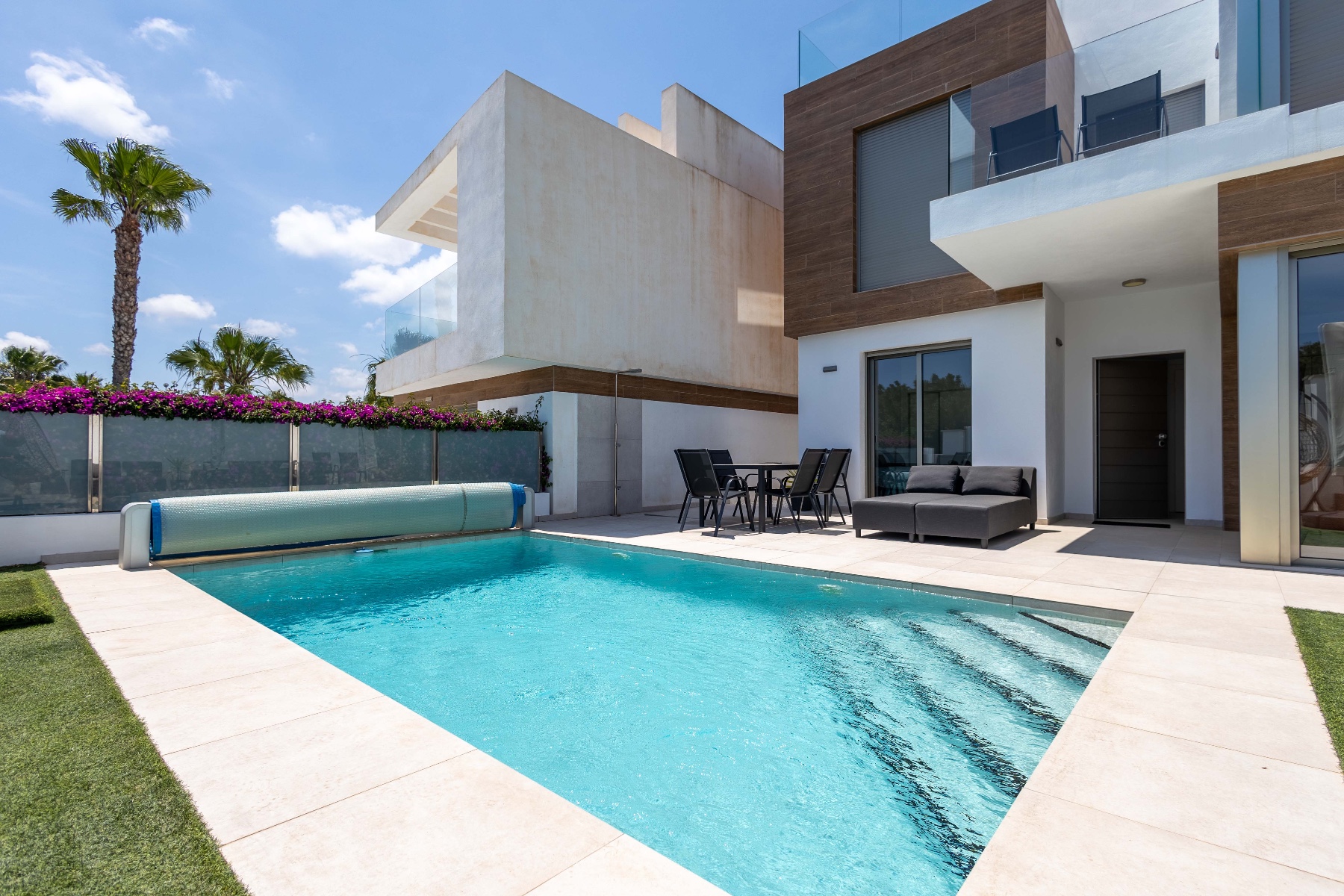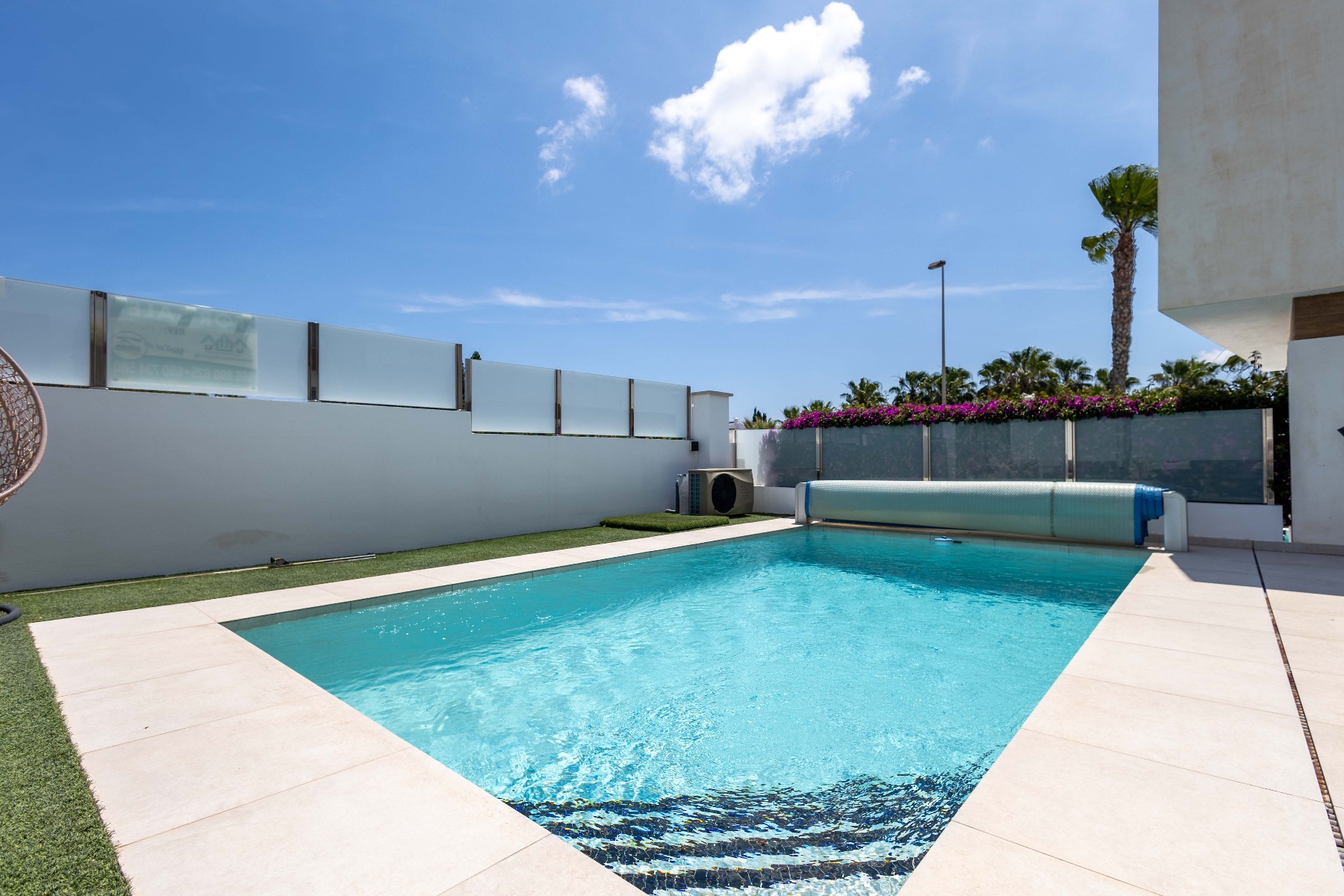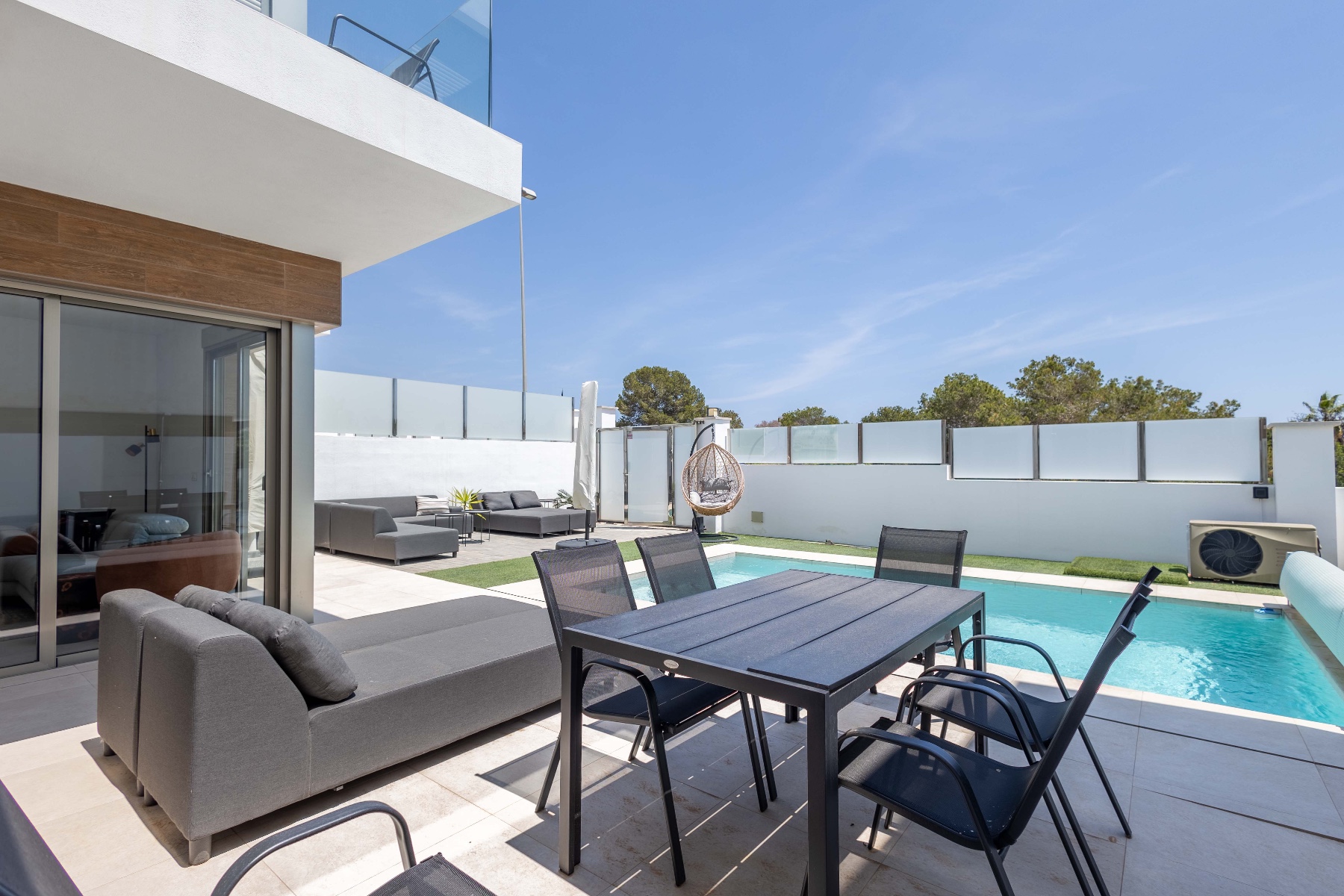 Modern villa in Villamartin – Luxury and comfort in Las Filipinas Orihuela Costa – Torrevieja Discover this magnificent modern villa in Villamartin, one of the most exclusive areas of Torrevieja. This impressive 178 m² property has been designed for those seeking elegance and comfort. It has four spacious bedrooms , all with en suite bathrooms , three of which have dressing rooms on the ground floor , ensuring privacy and comfort in every corner. The open plan living room with its large windows flows seamlessly into the modern and functional kitchen , creating an ideal place to socialise with family or friends. On the ground floor there is a guest toilet and a bedroom with en suite bathroom. The highlight of the house is its impressive private swimming pool , perfect for cooling off on sunny days. The large terrace invites you to relax and enjoy unforgettable evenings. A convenient parking space is also available. Excellent location This villa is located in a quiet area with good connections, close to supermarkets, restaurants, pharmacies and shopping centers . Within walking distance you can enjoy the beaches of Torrevieja, the La Mata Natural Park and the best golf courses on the Costa Blanca . Main features 178 m² living space Four bedrooms with private bathrooms. Three wardrobes Private pool South facing for maximum natural light. Used property in excellent condition If you are looking for an exclusive home with all the modern comforts , this modern villa in Villamartin is the perfect choice. Don't miss this opportunity. For more information or to book a visit, please contact us at +34 635 130 717