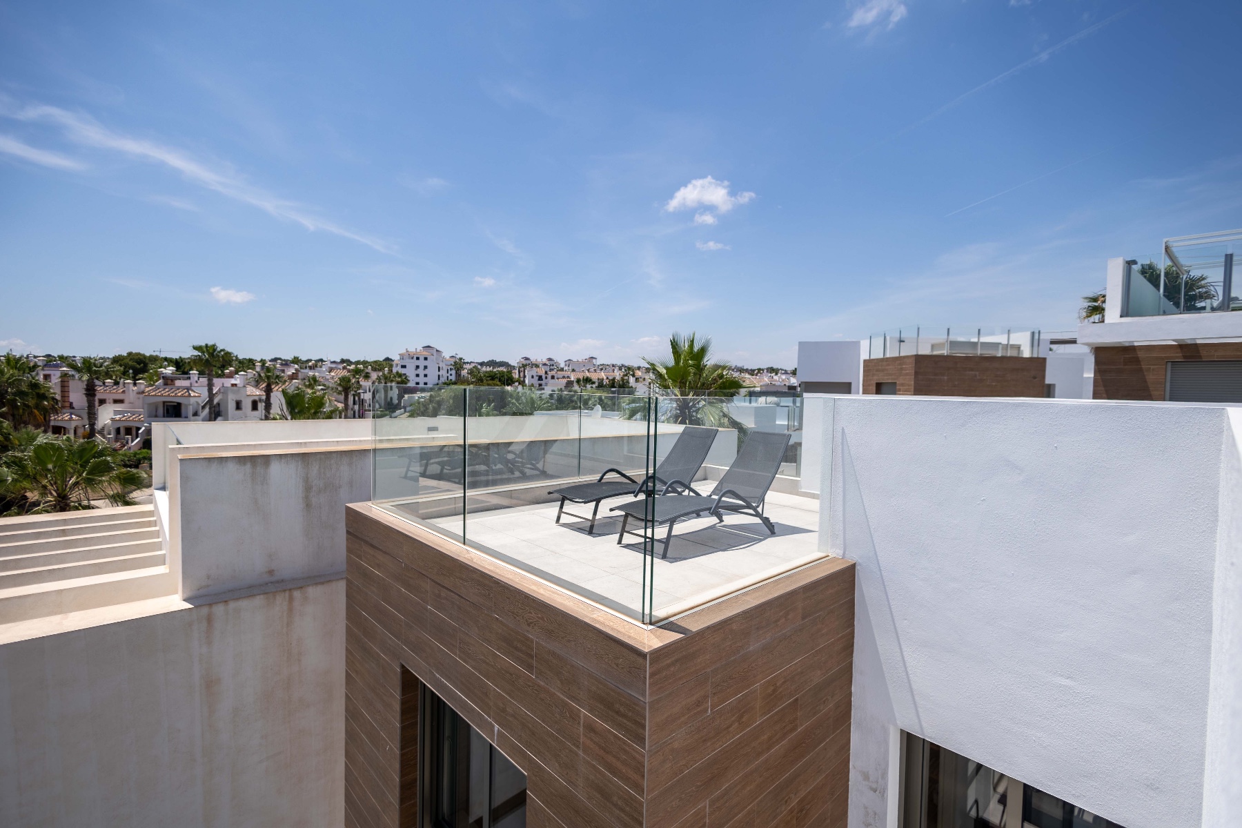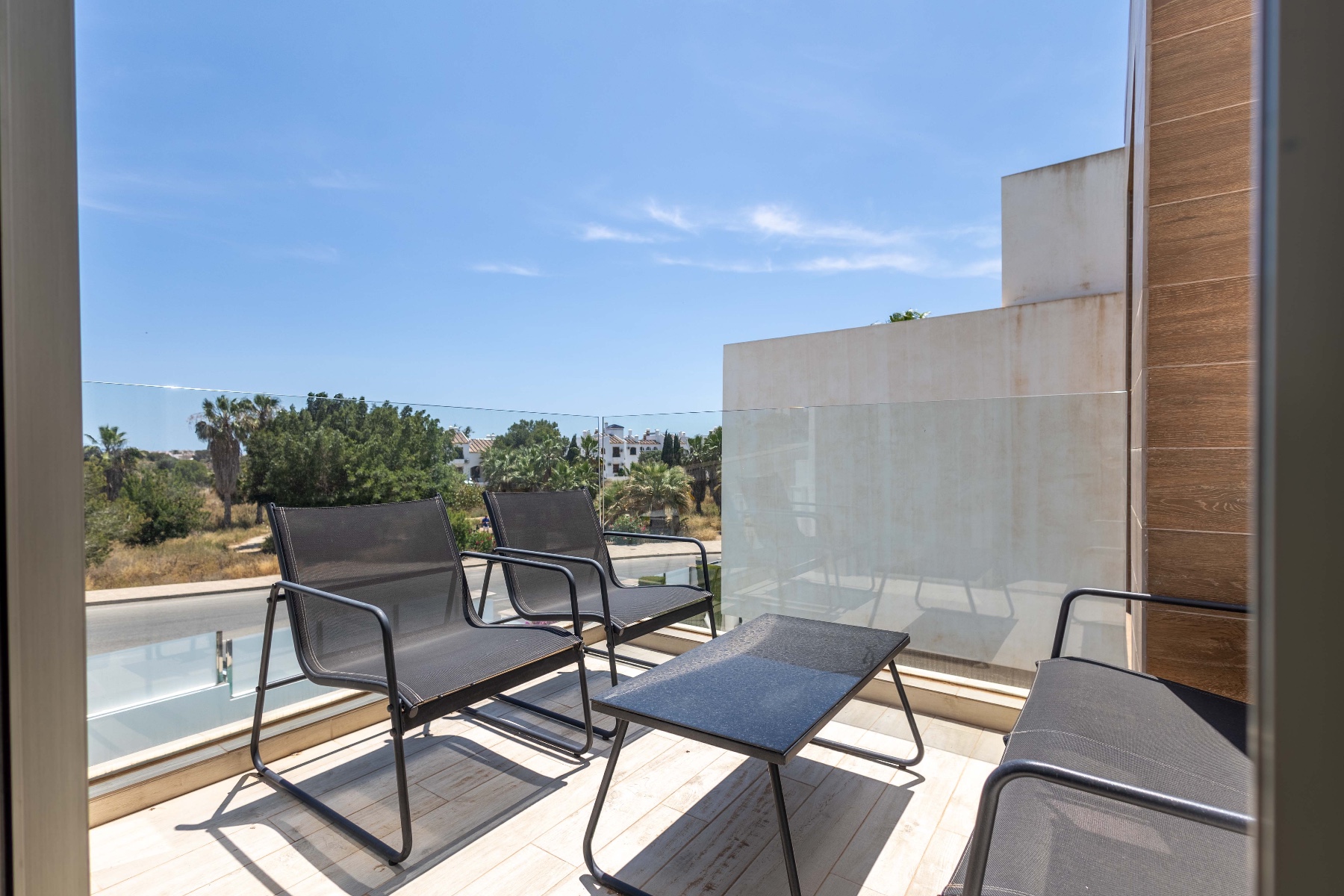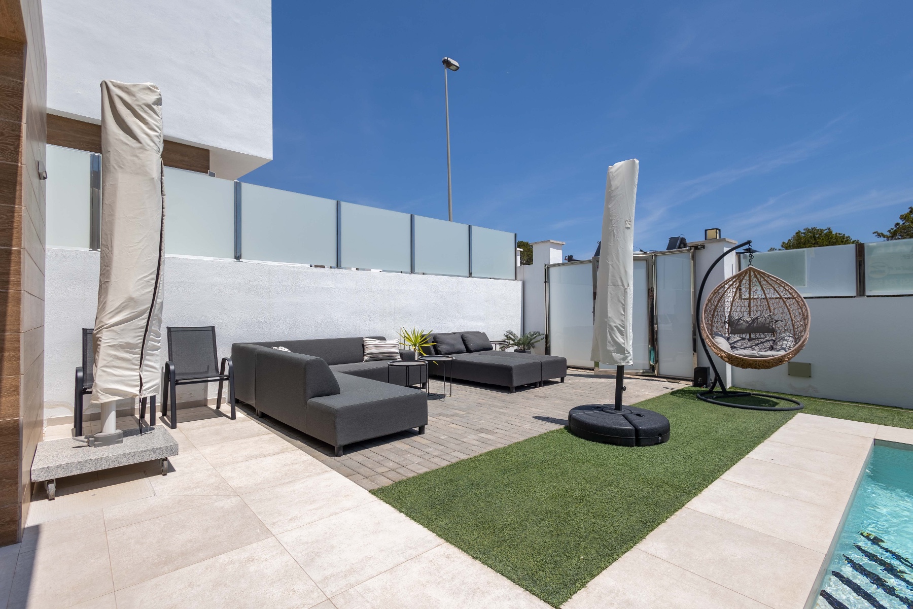 Modern villa in Villamartin – Luxury and comfort in Las Filipinas Orihuela Costa – Torrevieja Discover this magnificent modern villa in Villamartin, one of the most exclusive areas of Torrevieja. This impressive 178 m² property has been designed for those seeking elegance and comfort. It has four spacious bedrooms , all with en suite bathrooms , three of which have dressing rooms on the ground floor , ensuring privacy and comfort in every corner. The open plan living room with its large windows flows seamlessly into the modern and functional kitchen , creating an ideal place to socialise with family or friends. On the ground floor there is a guest toilet and a bedroom with en suite bathroom. The highlight of the house is its impressive private swimming pool , perfect for cooling off on sunny days. The large terrace invites you to relax and enjoy unforgettable evenings. A convenient parking space is also available. Excellent location This villa is located in a quiet area with good connections, close to supermarkets, restaurants, pharmacies and shopping centers . Within walking distance you can enjoy the beaches of Torrevieja, the La Mata Natural Park and the best golf courses on the Costa Blanca . Main features 178 m² living space Four bedrooms with private bathrooms. Three wardrobes Private pool South facing for maximum natural light. Used property in excellent condition If you are looking for an exclusive home with all the modern comforts , this modern villa in Villamartin is the perfect choice. Don't miss this opportunity. For more information or to book a visit, please contact us at +34 635 130 717