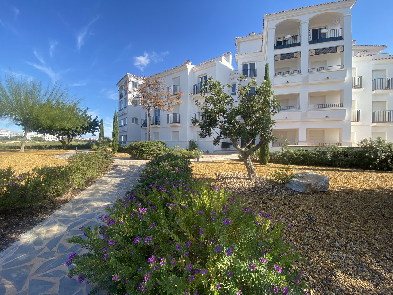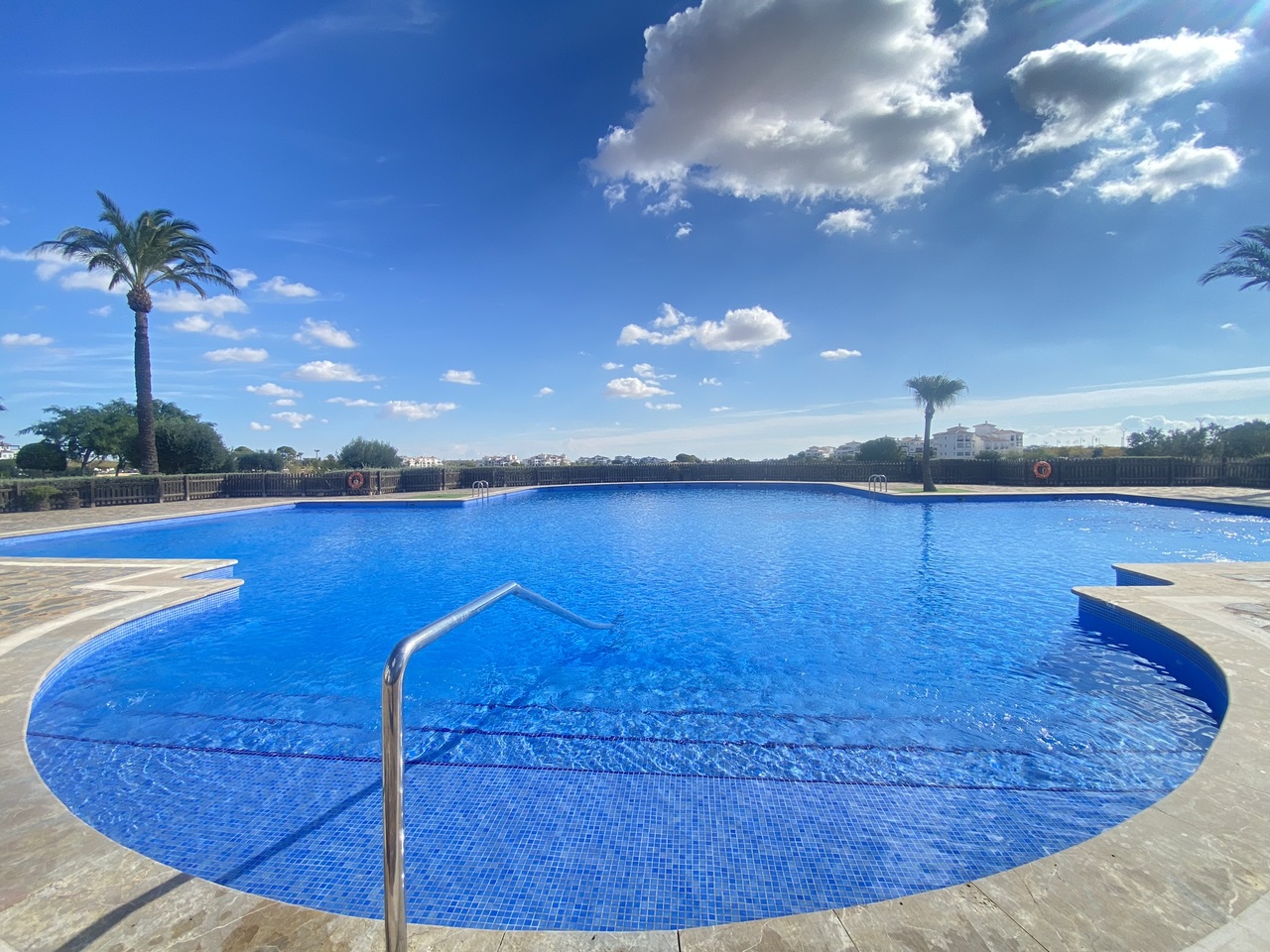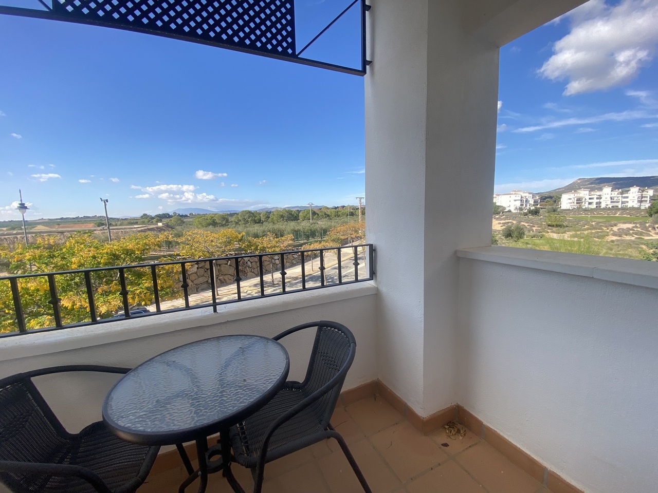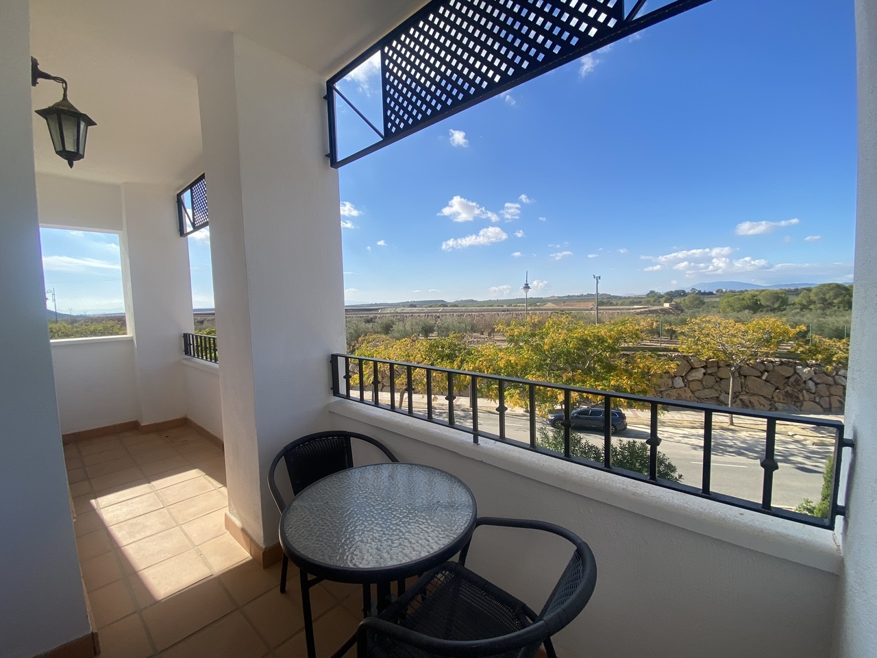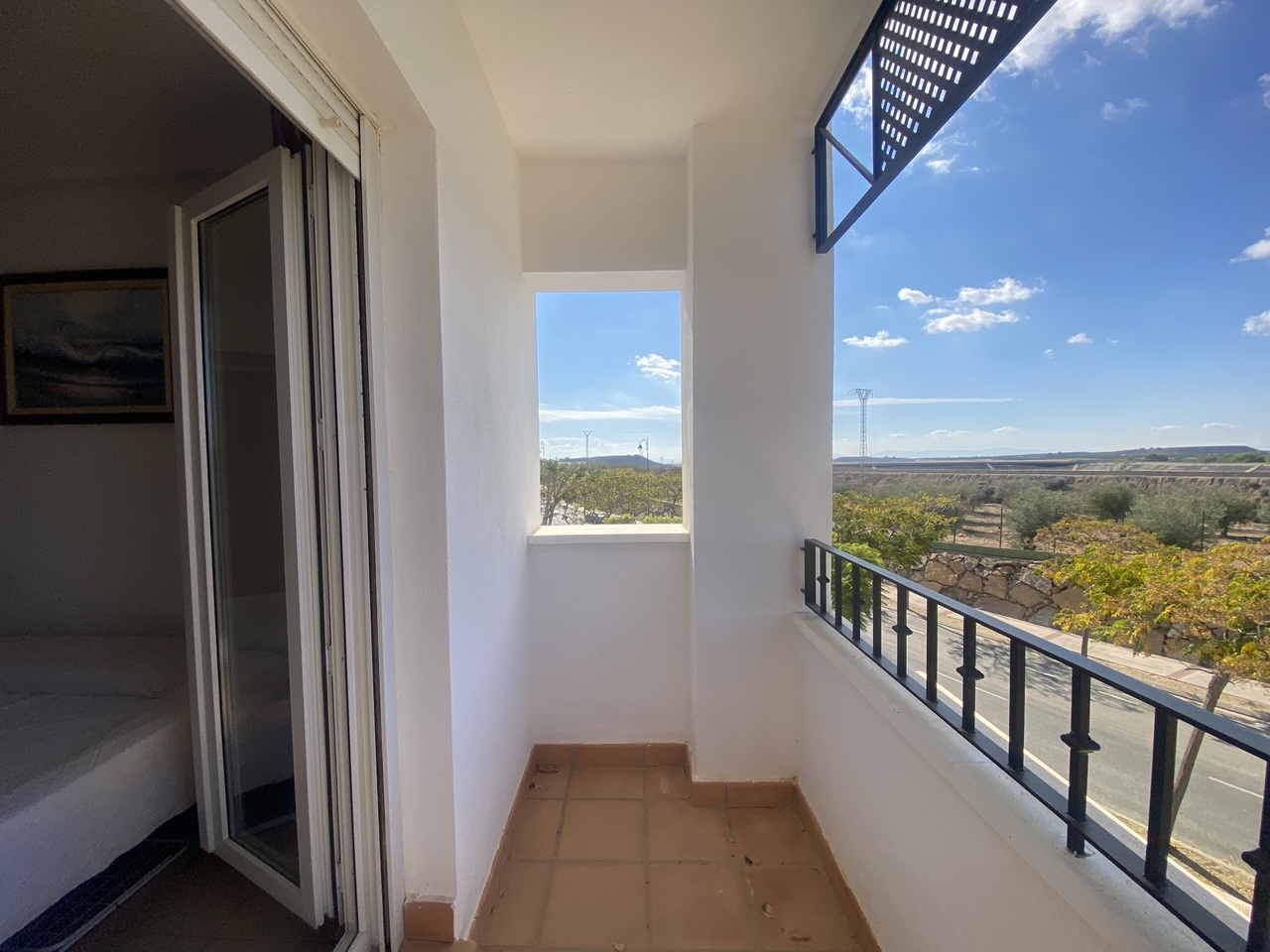 Charming Apartment for Sale in Hacienda Riquelme Golf Resort Welcome to one of the most sought-after apartments in Hacienda Riquelme Golf Resort! This unique two-bedroom, one-bathroom residence stands out with its spacious round-walled living room and an expanded kitchen, offering extra room and comfort. The apartment features a cozy rear terrace overlooking a beautiful orange grove, perfect for enjoying peaceful mornings. The main terrace, accessible from the living room, boasts a lovely pergola and stunning views of the golf course, providing a picturesque spot for relaxation and entertainment. Located just a 10-minute walk from the clubhouse, this apartment not only enjoys extraordinary views but is also ideally positioned within the lush, well-maintained grounds of Hacienda Riquelme Golf Resort. Residents here benefit from 24/7 security and a range of amenities, including the popular El Casón bar and restaurant, a small on-site supermarket, and stunning mountain views behind the complex. Conveniently situated just five minutes by car from the charming Murcian village of Sucina, 15 minutes from the nearest beach, and 20 minutes from Murcia Airport, this is the perfect home for those looking to blend tranquility, convenience, and breathtaking surroundings. Experience the best of resort living with this exceptional apartment – a true oasis of peace and beauty.