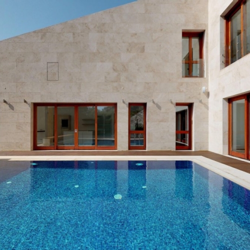 This impressive dream villa combines contemporary design with Mallorcan tradition, offering panoramic views of the sea and the Canyamel golf course.. . Located on a hillside plot of approximately 1,000 m2, this newly built property is adjacent to the spectacular "Cap Vermell" golf course and within walking distance of a picturesque bay.. . Distributed over three levels and 410 m2 of living space, on the first floor there are three bedrooms with en-suite bathrooms and access to a covered terrace. On the second floor there is a fully equipped designer kitchen, a large open area with dining room and living room, a bathroom, another room that can be used as an office or another bedroom and also access to a covered terrace. The covered terraces have a total area of 135 m2.. . On the lower floor there is a fitness room, a sauna and a wine cellar. All floors have easy access. through stairs elevator.. . The pool is located on the roof terrace, from where you have a fantastic view of the turquoise sea and the golf course.. . The villa was built with only the highest quality materials and is equally captivating with the European design furniture used.. . The taxes corresponding to the purchase, as well as notary and property registration expenses, are not included in the price.. . This villa is a dream property that offers luxury, comfort and an enviable location. Contact us for more information and to arrange a visit!