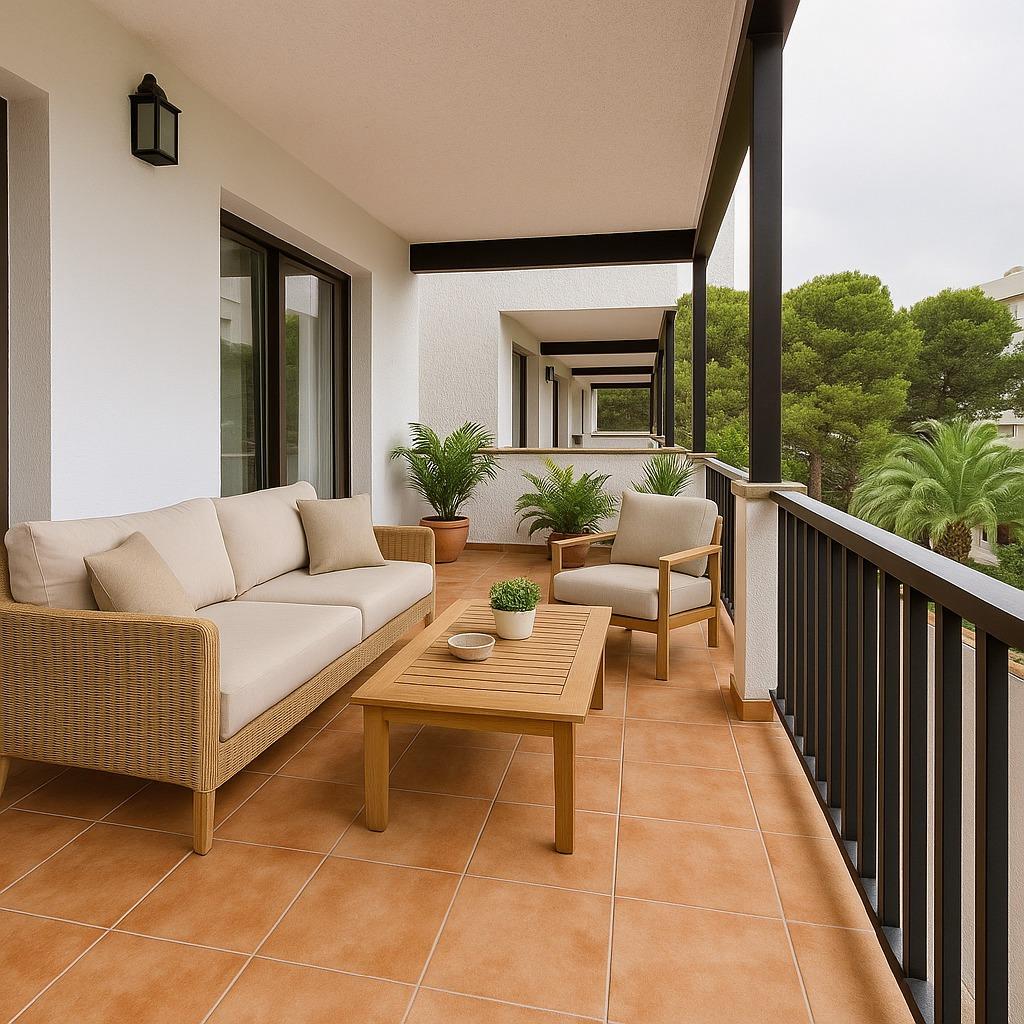 Exclusive apartment just 40 meters from the beach in Font de Sa Cala, Capdepera.. . Discover this charming apartment located in the sought-after area of Font de Sa Cala, Capdepera. A privileged setting that combines residential tranquillity with proximity to the sea – perfect as a permanent residence or for enjoying holiday stays.. This bright and welcoming apartment is situated on the second sea line, just steps from the beach, in a well-maintained residential building with elevator. The area is peaceful, exclusive, and very close to all amenities, ensuring comfort and an exceptional quality of life.. With a built area of 61 m² (50 m² usable), the property is south-facing, allowing for bright, warm, and functional living spaces throughout the day.. The highlight is the 11.42 m² terrace with partial sea and garden views – ideal for creating a stylish chill-out area or enjoying breakfast with the family while taking in the Mediterranean breeze.. There are two spacious double bedrooms with built-in wardrobes and excellent ventilation: one with a garden view, the other with direct access to the terrace. The bright living-dining room also connects to the terrace through large aluminum sliding doors, blending indoor and outdoor living beautifully.. The open-plan kitchen is fully equipped with appliances and cabinetry and includes a breakfast bar, perfect for social cooking and modern living.. There are two complete bathrooms, both with walk-in showers. Hot water is provided by an electric boiler. Though there is no central heating, the excellent orientation ensures a pleasant temperature all year round.. The property is in good condition and ready to move in, though a light renovation could enhance its full potential. The original wood-framed windows and doors with fine glass add character and charm.. The building features exclusive outdoor parking for residents and the option to rent a covered parking space for added convenience.. Community fees: €2,000 per year.. The purchase and sale transaction of this property may be completed starting from March 2026.. This is a unique opportunity to live surrounded by peace, sea, and natural beauty in one of the most enchanting corners of northeast Mallorca – where each day begins with an inspiring view.. Some images have been generated with AI to illustrate potential decor and highlight the property’s possibilities.. Important: Purchase taxes, notary, and registration costs are not included. As a construction company, we are also happy to advise you on renovation, expansion, or any project you may have in mind.
