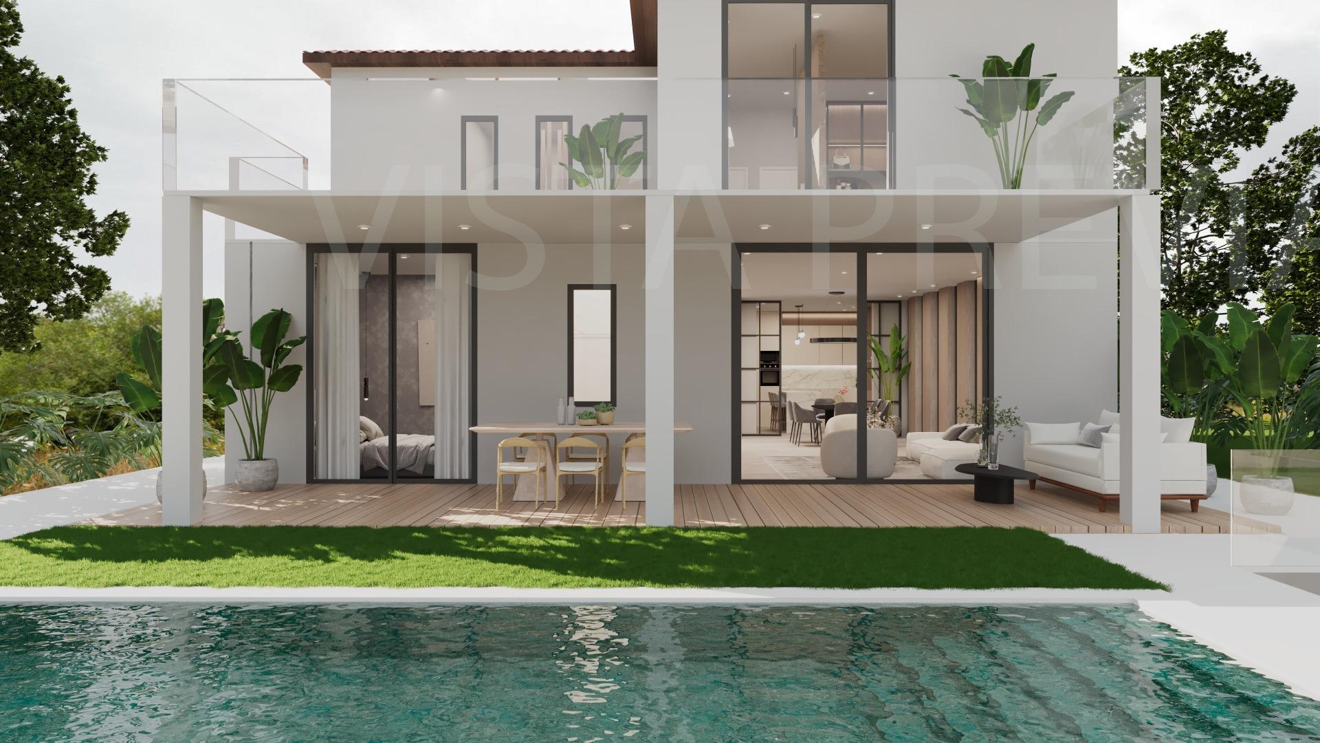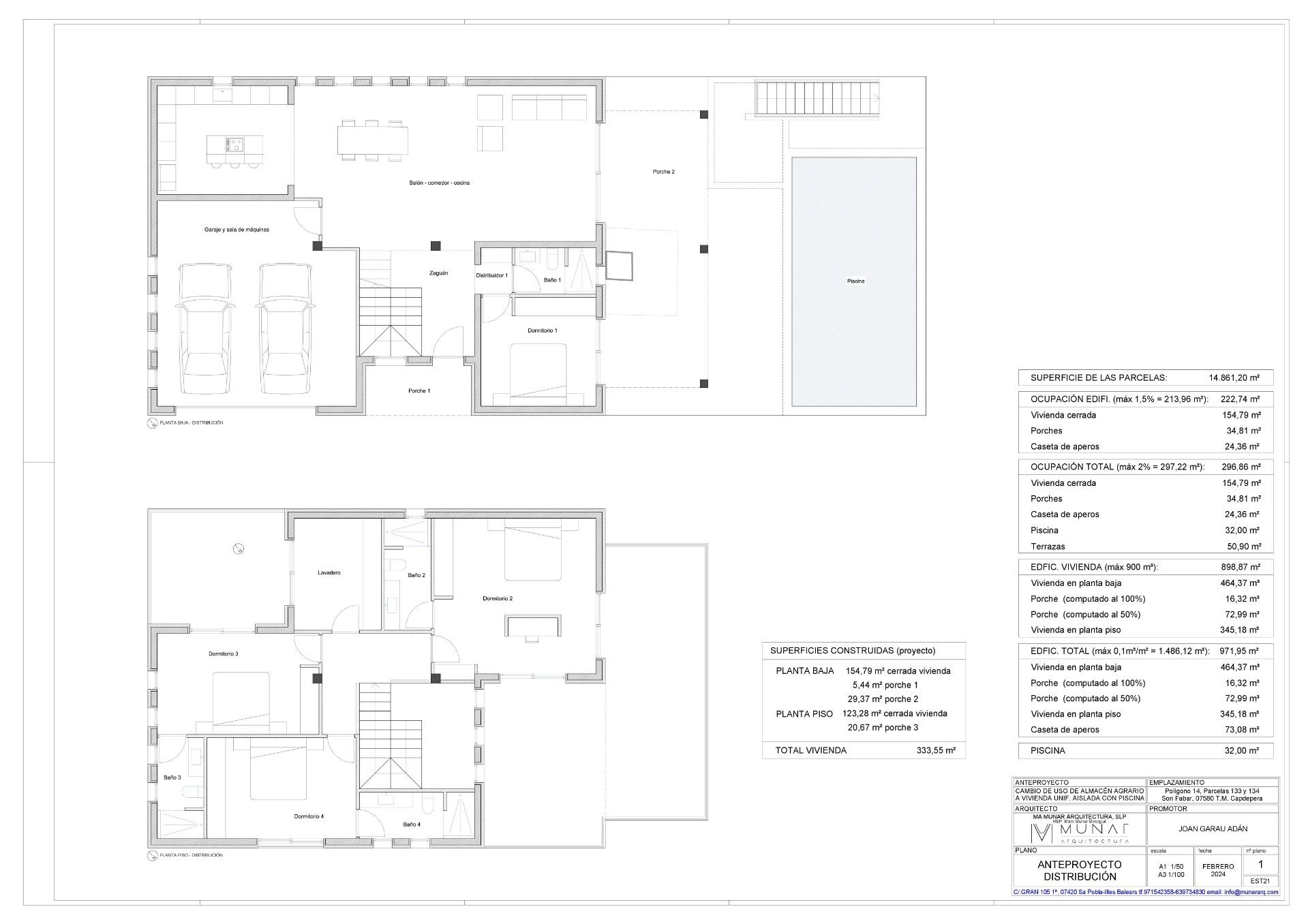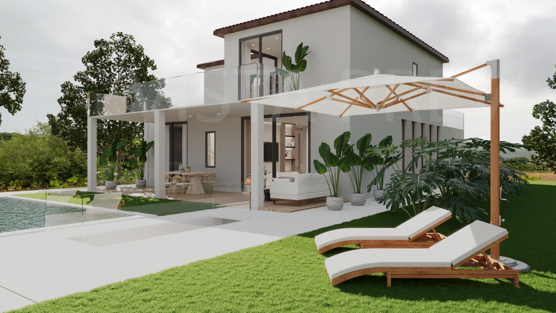 This set of two rural properties, with a total of 14,800 m2, is strategically located near the Artá-Capdepera highway, just behind the Capdepera industrial estate. The property has excellent communication and offers clear views of the mountains and the picturesque town of Capdepera, providing a quiet and natural environment.. . Farm 1:. Agricultural Warehouse: A construction of approximately 140 m2, equipped with a rainwater cistern. Tool Shed: A small, old stone shed of about 25 m2, ideal for storage.. . Farm 2:. Natural Water Well: Completely legal and functional, providing a reliable source of water.. Infrastructure:. . The farms are semi-enclosed with a block and masonry wall, guaranteeing security and clear delimitation of the property. The main entrance to the property is built with Marés stone, offering robust and aesthetic access. The electrical connection is located about 400 meters away, facilitating future connections to the network.. . The combined buildability of both properties allows the construction of a house with the following characteristics:. . Construction Area: Occupation of 262 m2 on the ground floor.. Height: Possibility of an additional first floor.. Swimming pool: A swimming pool of approximately 30 m2.. . Currently, there is a preliminary project to expand the existing construction, transforming it into a two-story house with a garage and swimming pool. This preliminary project includes visual renderings that show what the house would look like once built.. . These farms represent an excellent investment opportunity, both for agricultural use and residential development. The possibility of building a new house with a pool and garage adds significant value to the property.. . The price does not include the taxes corresponding to the purchase and sale of the property, nor the notary and property registration expenses.. . We are builders and are available for any additional information or to organize a visit. If you want to build a new house on this property, contact us.
