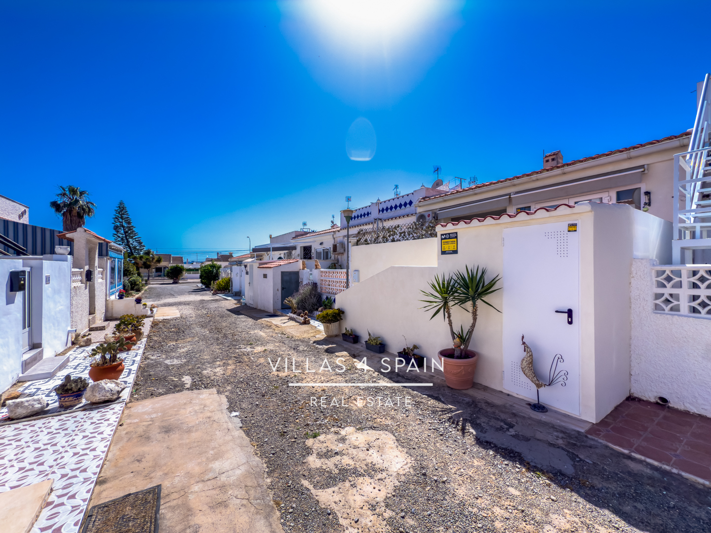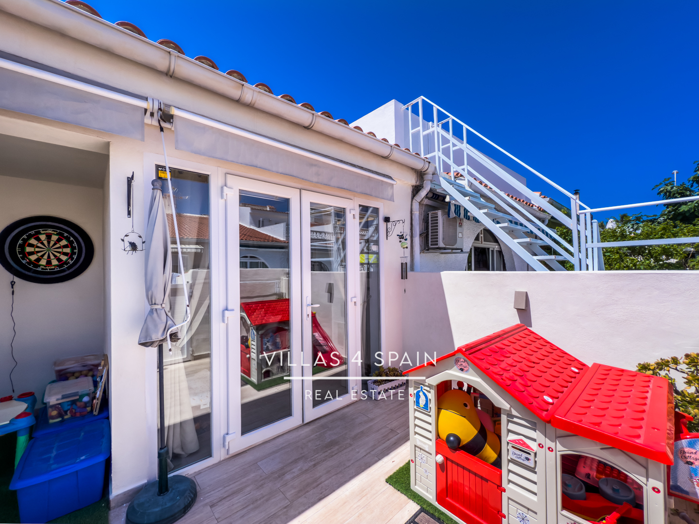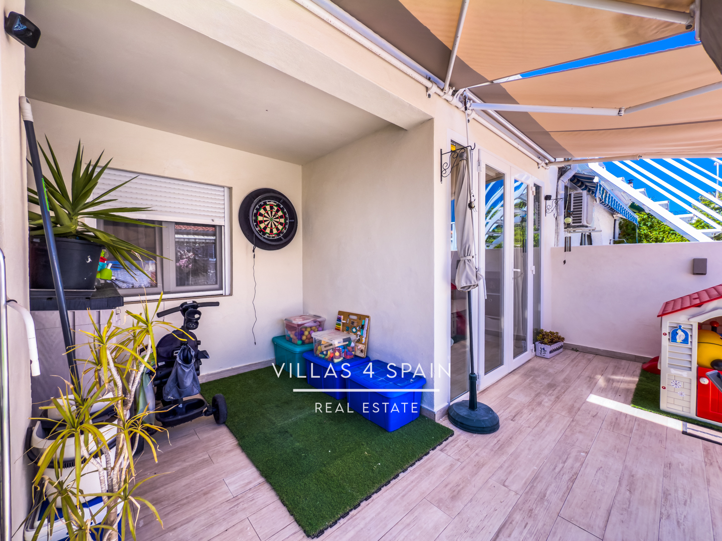 Discover this beautifully modernized 2-bedroom, 1-bathroom home in the heart of San Luis, Torrevieja, offering a perfect blend of comfort and convenience. This south-facing gem boasts a spacious front garden with an easy-access ramp and a covered storage area, ideal for outdoor living. Enjoy al fresco dining or entertaining under two extendable toldo sunshades, creating a shaded area.