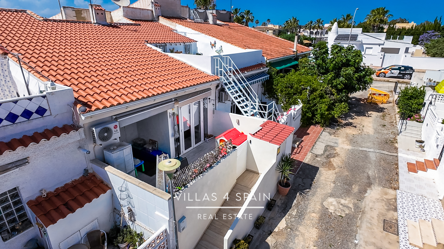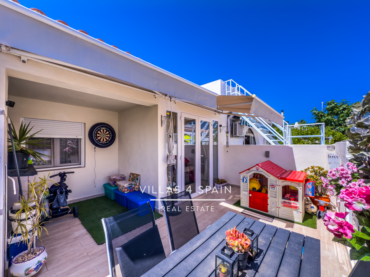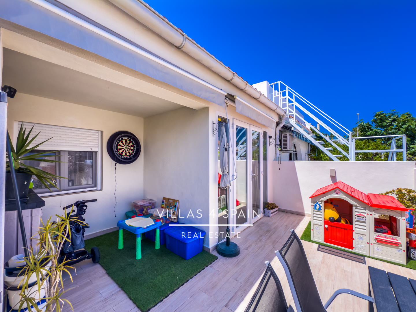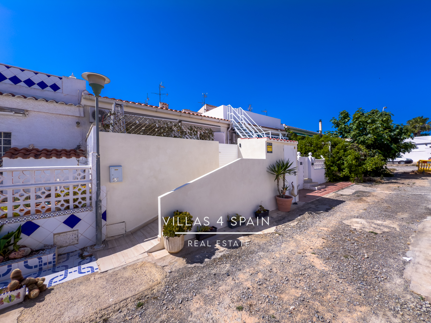Discover this beautifully modernized 2-bedroom, 1-bathroom home in the heart of San Luis, Torrevieja, offering a perfect blend of comfort and convenience. This south-facing gem boasts a spacious front garden with an easy-access ramp and a covered storage area, ideal for outdoor living. Enjoy al fresco dining or entertaining under two extendable toldo sunshades, creating a shaded area.