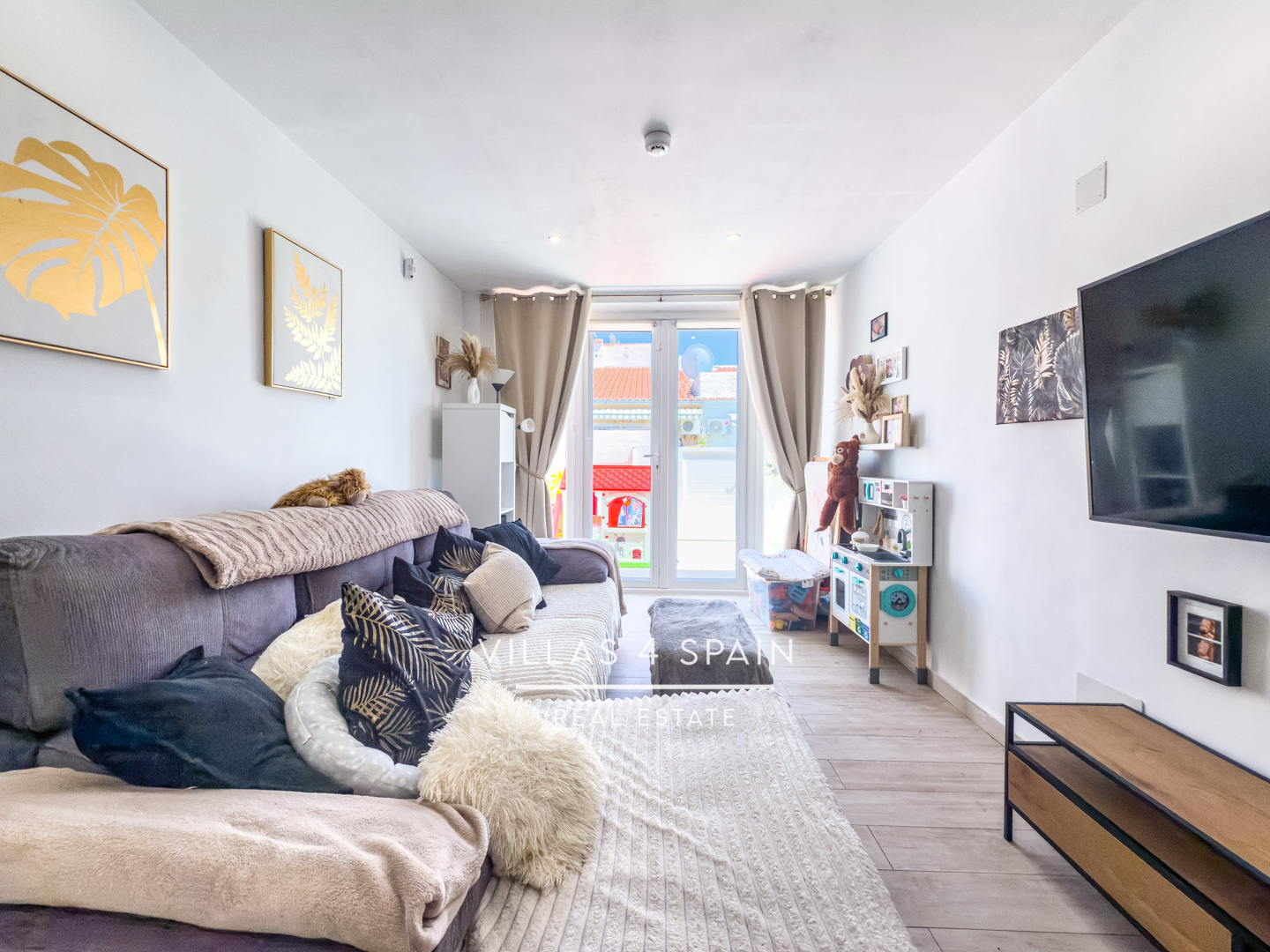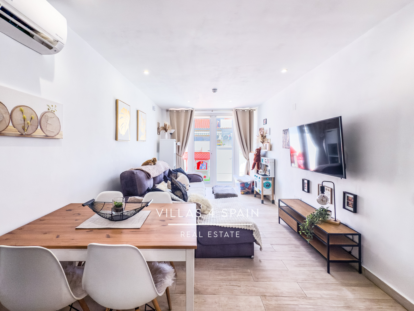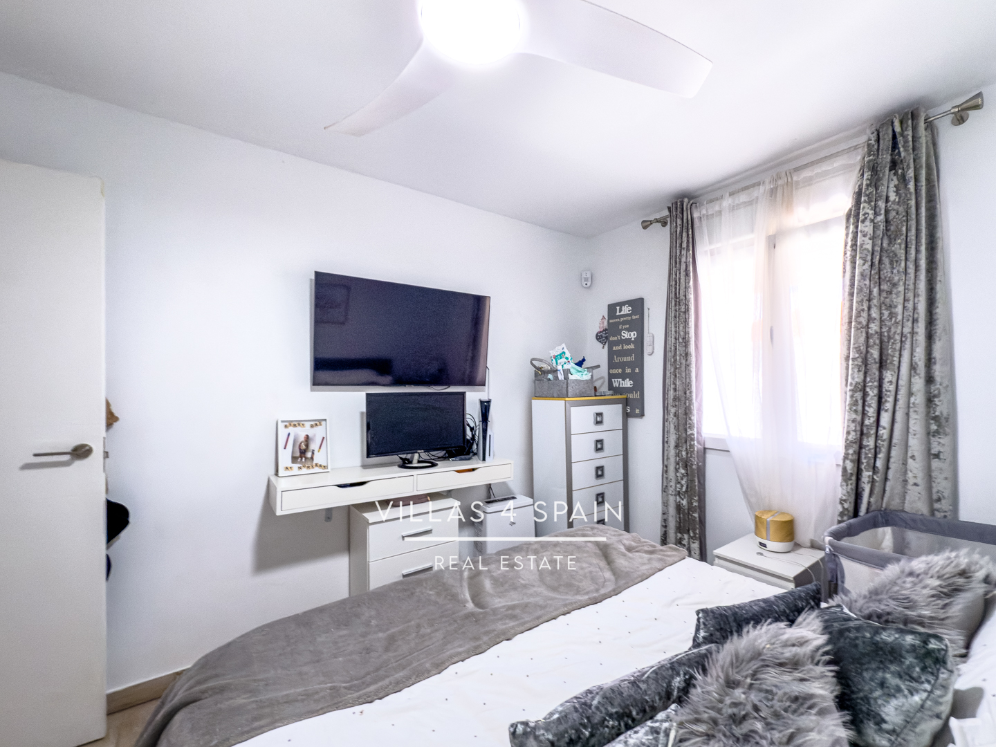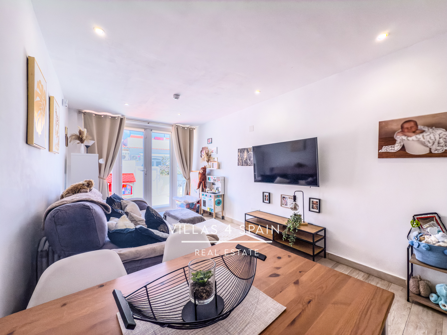 The hallway leads to a master bedroom with fitted wardrobes, a sleek, fully renovated bathroom with a sliding door, and a spacious double second bedroom. Located just a 2-minute walk from a local supermarket and surrounded by a variety of bars and restaurants, this home is perfectly positioned for convenience. The breathtaking Costa Blanca beaches are only a 10-minute drive away, while the iconic pink salt lake, perfect for evening strolls or sunset views, is just a 3-minute walk.
