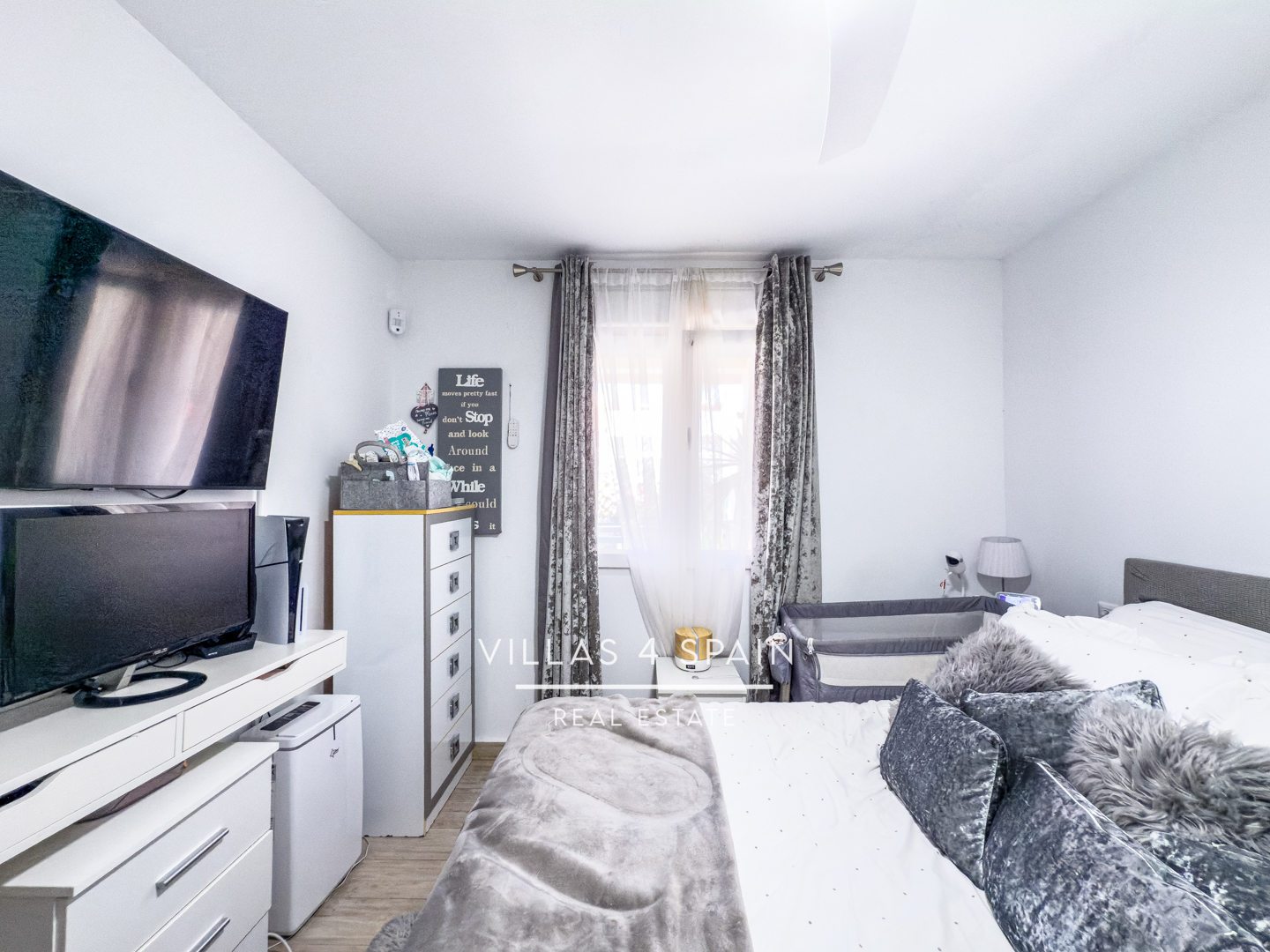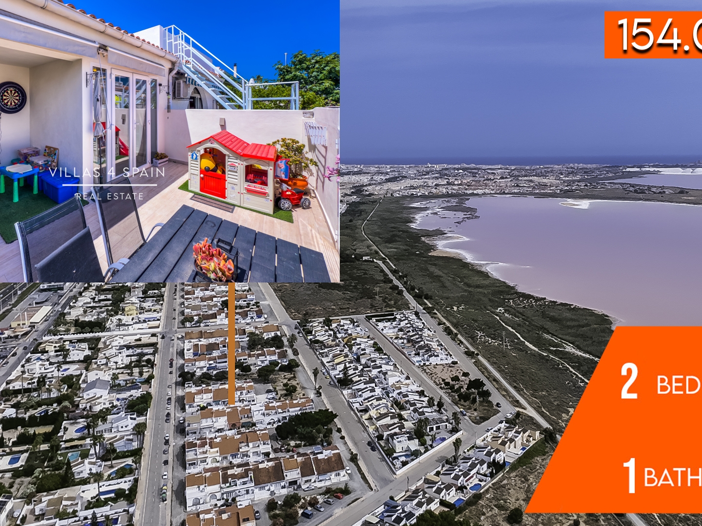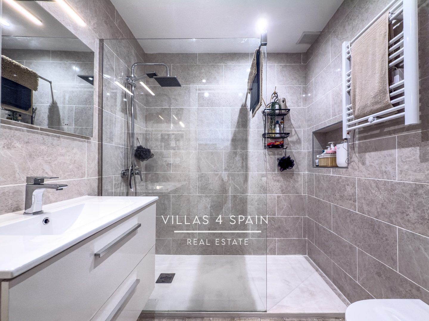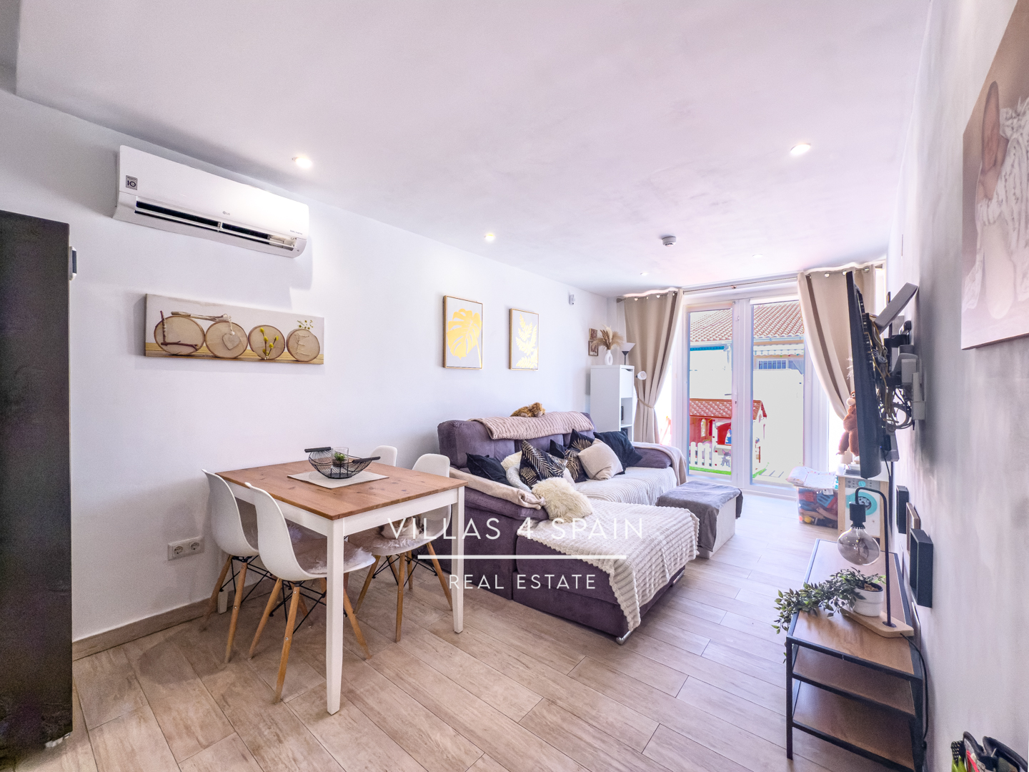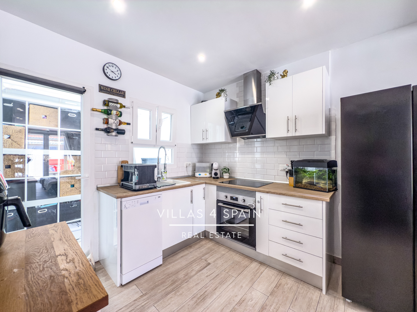 The hallway leads to a master bedroom with fitted wardrobes, a sleek, fully renovated bathroom with a sliding door, and a spacious double second bedroom. Located just a 2-minute walk from a local supermarket and surrounded by a variety of bars and restaurants, this home is perfectly positioned for convenience. The breathtaking Costa Blanca beaches are only a 10-minute drive away, while the iconic pink salt lake, perfect for evening strolls or sunset views, is just a 3-minute walk.